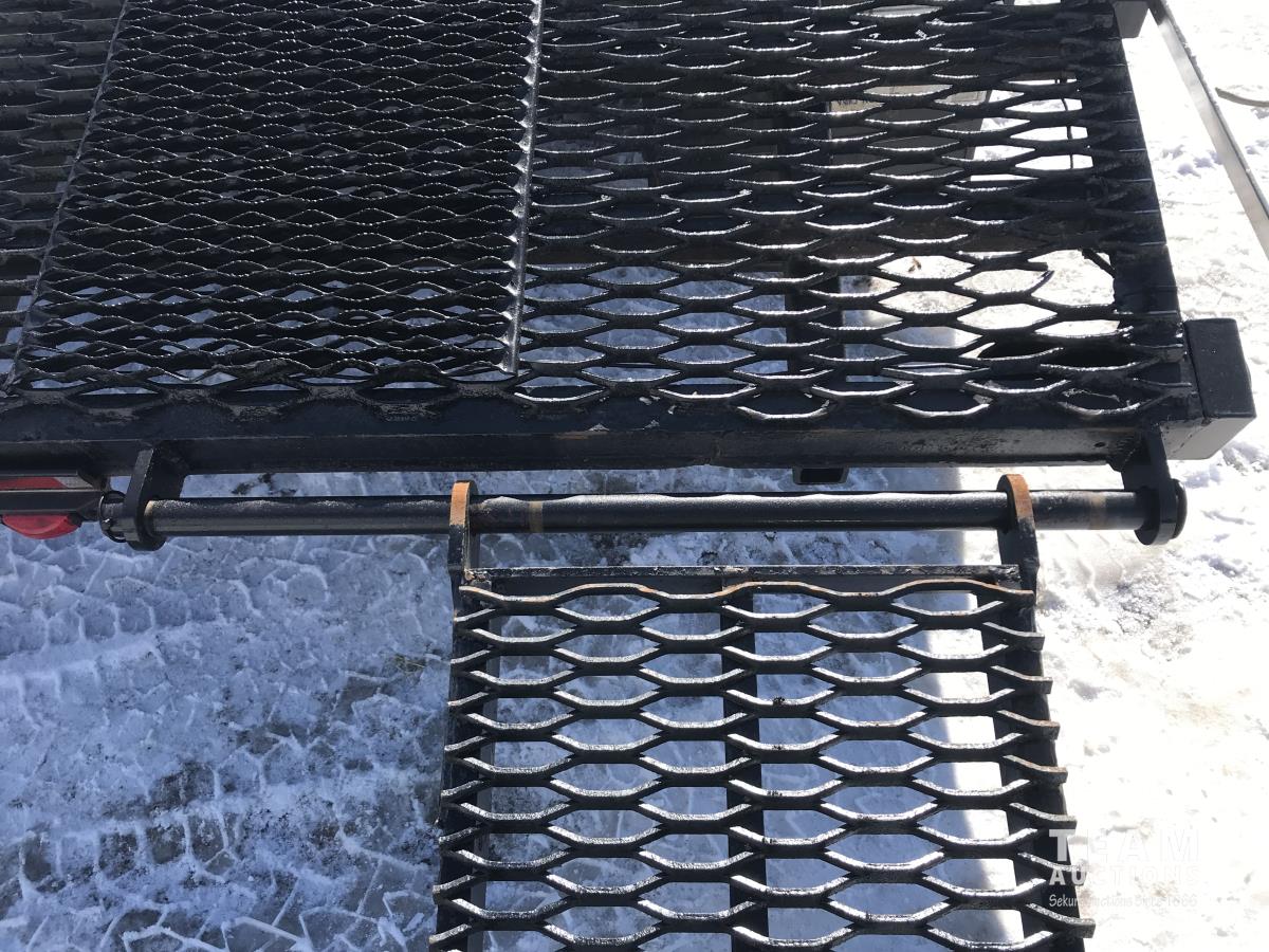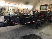 96 inch wide deck, 36 inch beaver tails, wood deck, torsion suspension, ball hitch, 4 ft flip over ramps, electric brakes on one axle, 5500 lb axles, 8X14.5 tires