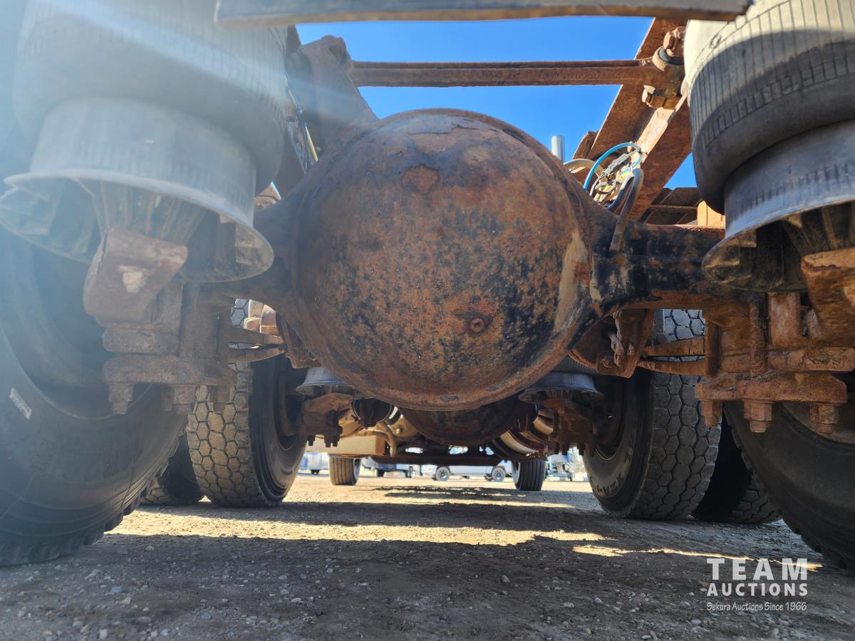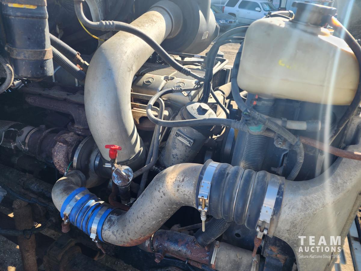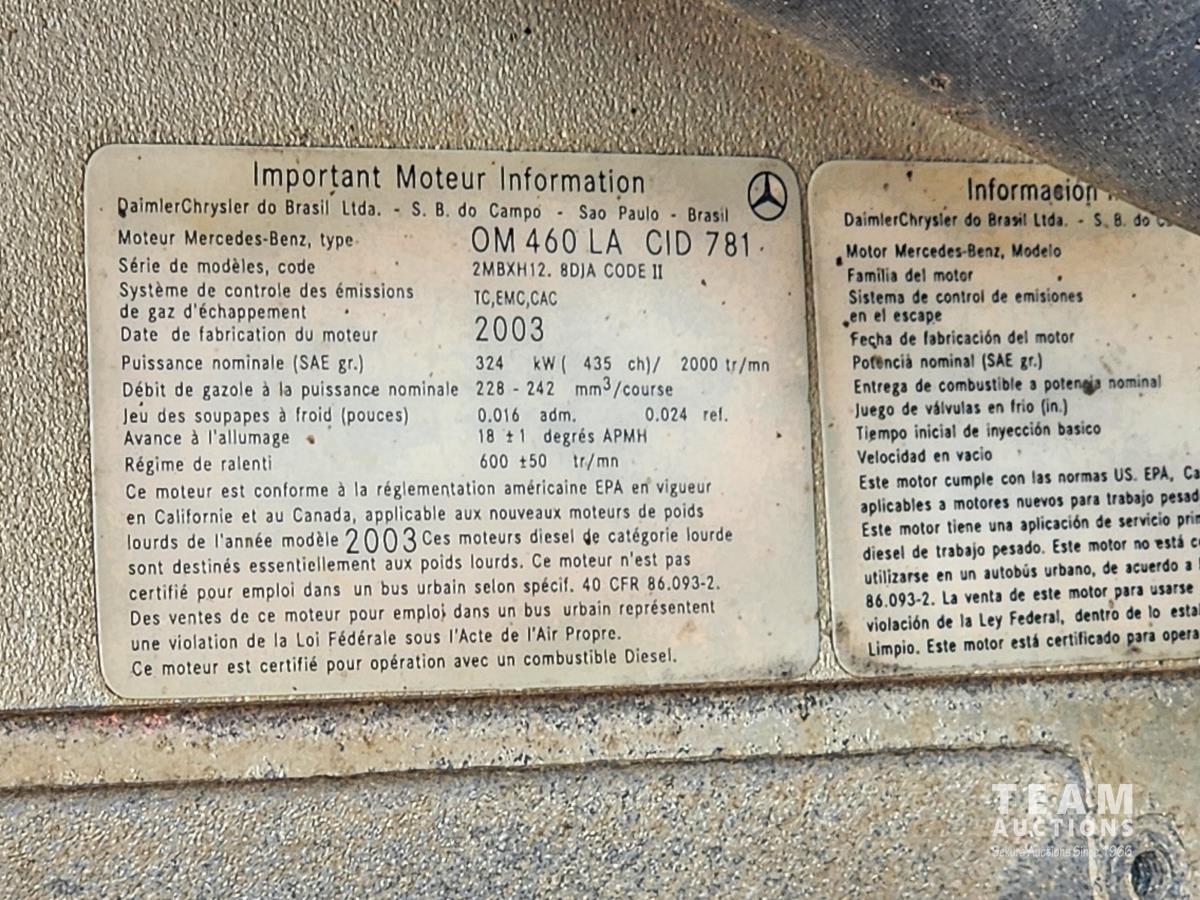 Mercedes 460 12.0 L engine, engine brake, Eaton Fuller 18 speed manual transmission, A/C, cruise control, radio, beacons, single line wet kit for end dump, Airliner air ride suspension, 48,000 lb rear axles, 205 inch WB, Rockwell diffs with full lockers, all aluminum wheels, 11R22.5 tires