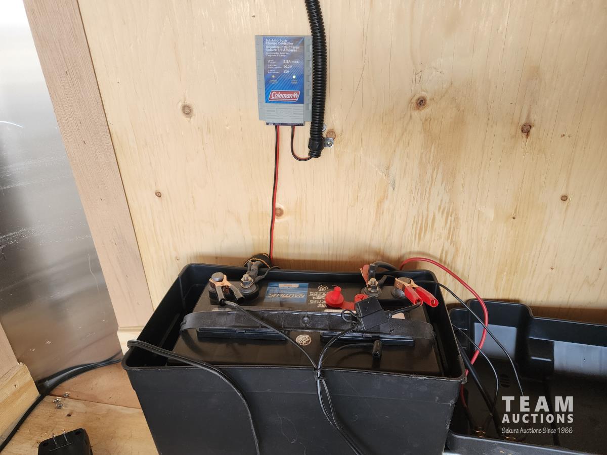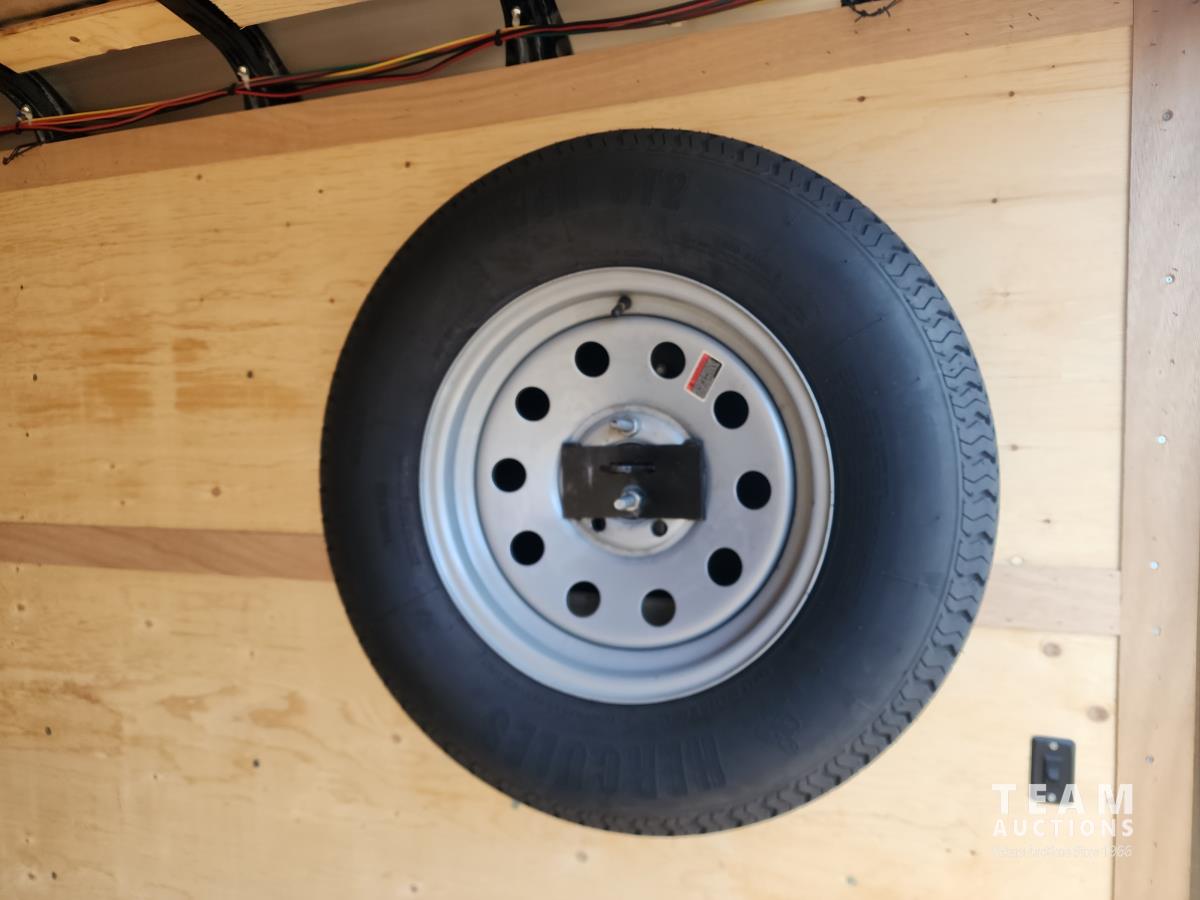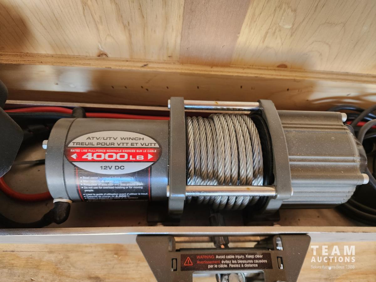 96 inch interior width, ball hitch pins, fold down door, spring suspension, side door, tie down hooks, 4000 lb winch, interior lights, spare tire, 3500 lb axles, 205/75R15 tires