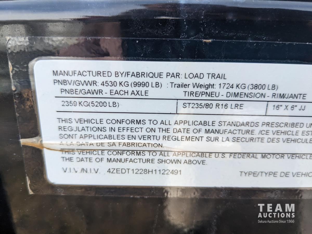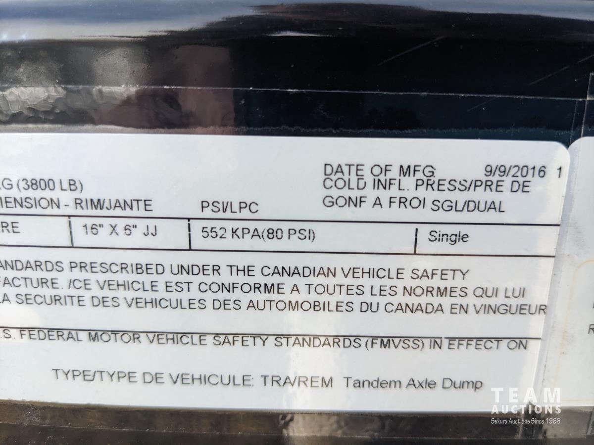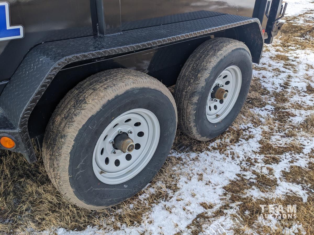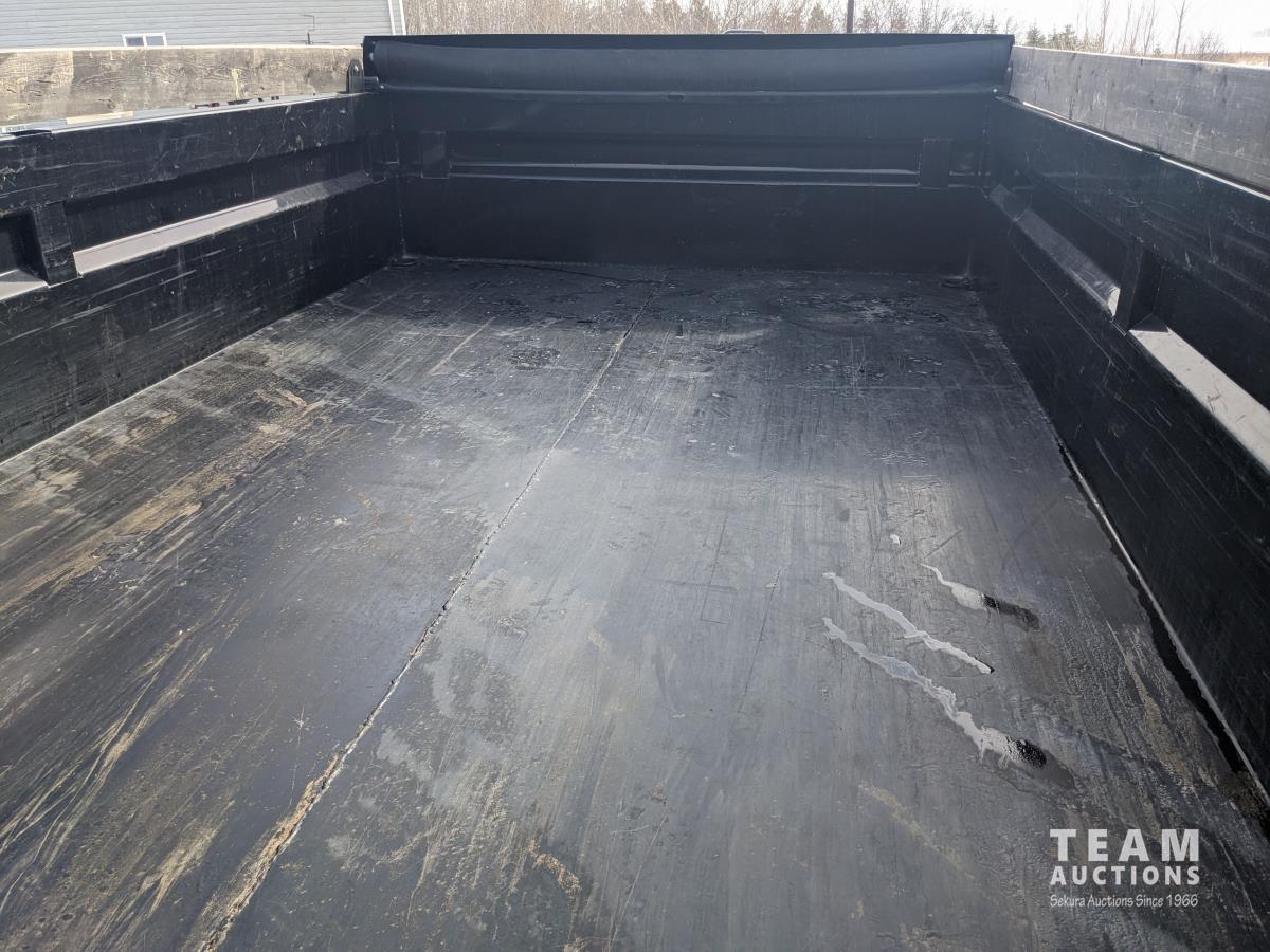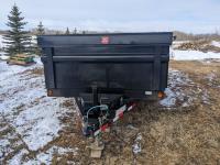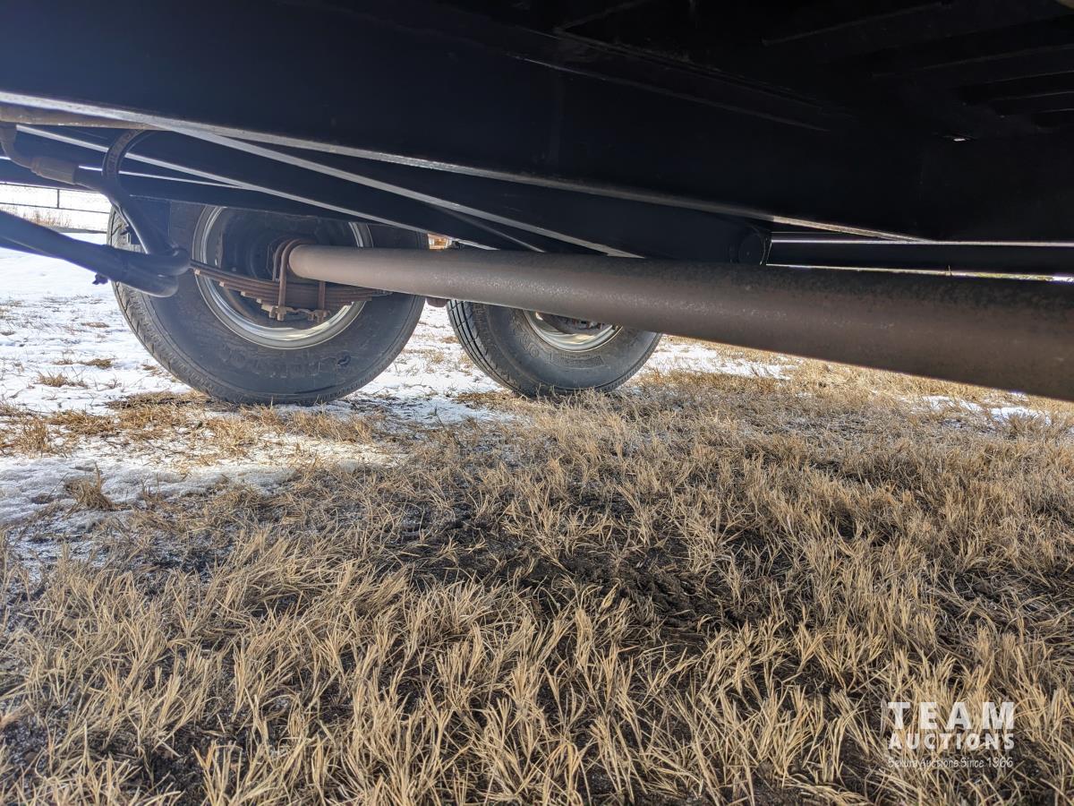 Ball hitch, roll tarp, electric brakes, spring suspension, 5,200 lb axles, 12V self contained hydraulic system with corded remote, 23/80R16 tires