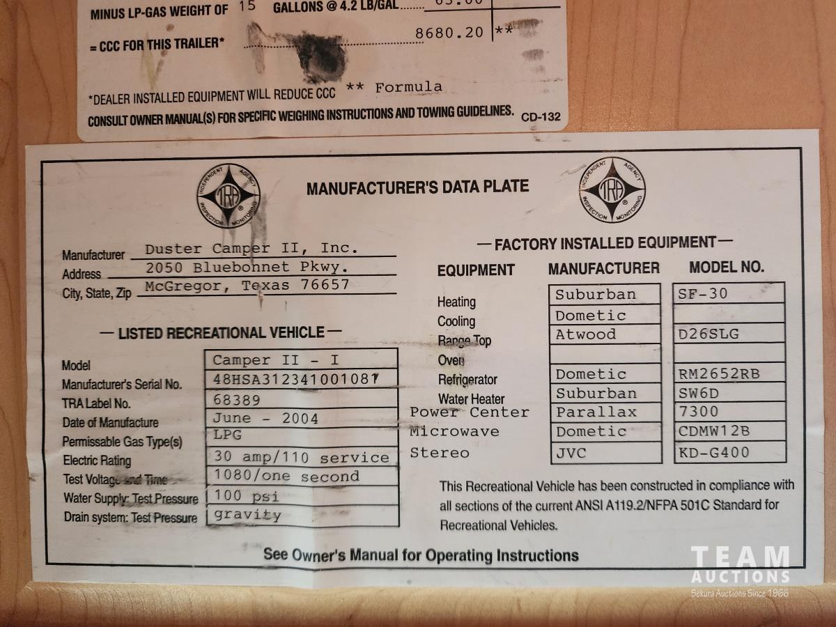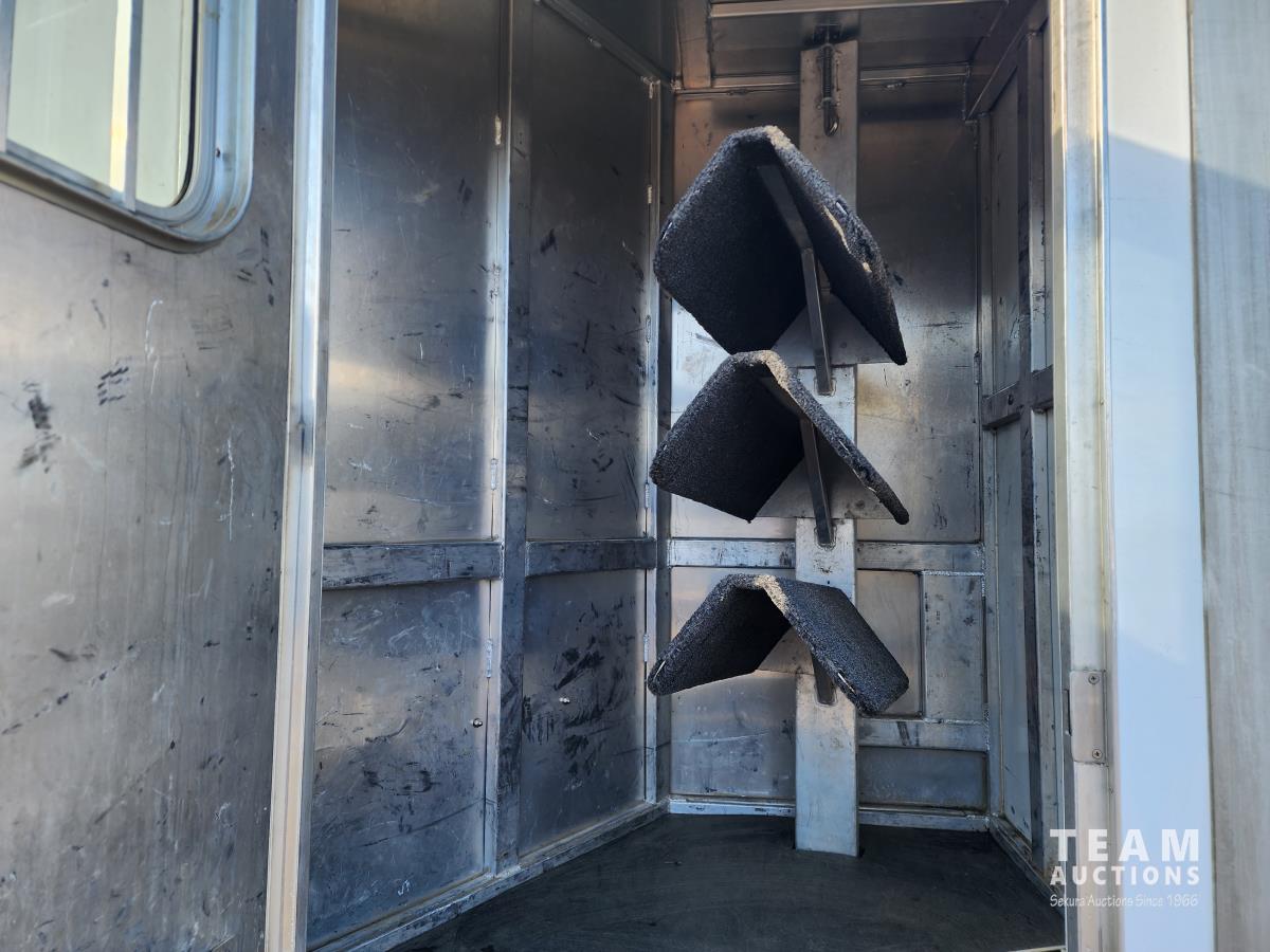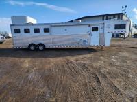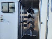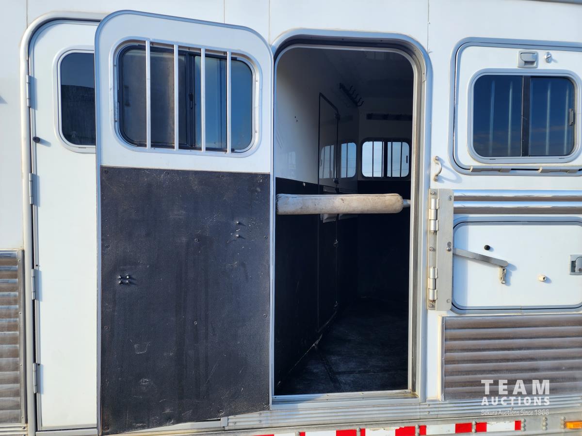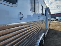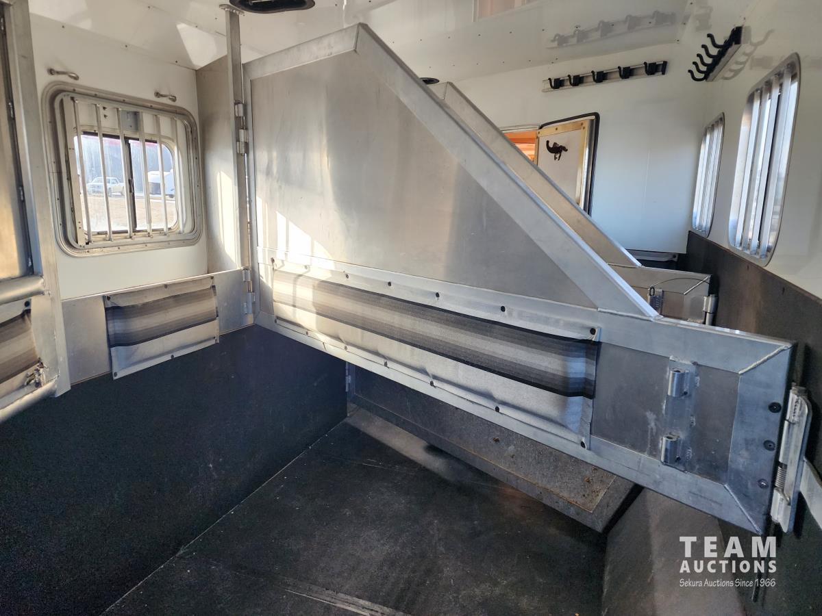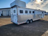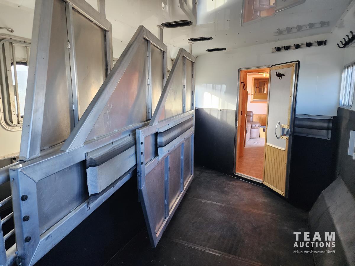 Front living quarters include solid wood Duster interior, full fridge with freezer (propane/electric), stove, microwave, king size master area with privacy door and storage cabinets, full bathroom with shower, cupboards have interior lighting, decorative rope lights, sleeps 5, A/C, furnace, stereo with speakers inside and outside, electric awning, setup for 110 power or 3000 watt generator, electric landing gear, solar panel on roof, rear area includes, 4 horse stalls with dividers, feed bunks double as waterers, full floor rubber matting, drop down windows with bars, exterior LED lighting, hay pod on roof, (2) tack areas with saddle stands, spring suspension, 99 inch wide, spare tire, 235/85R16 tires