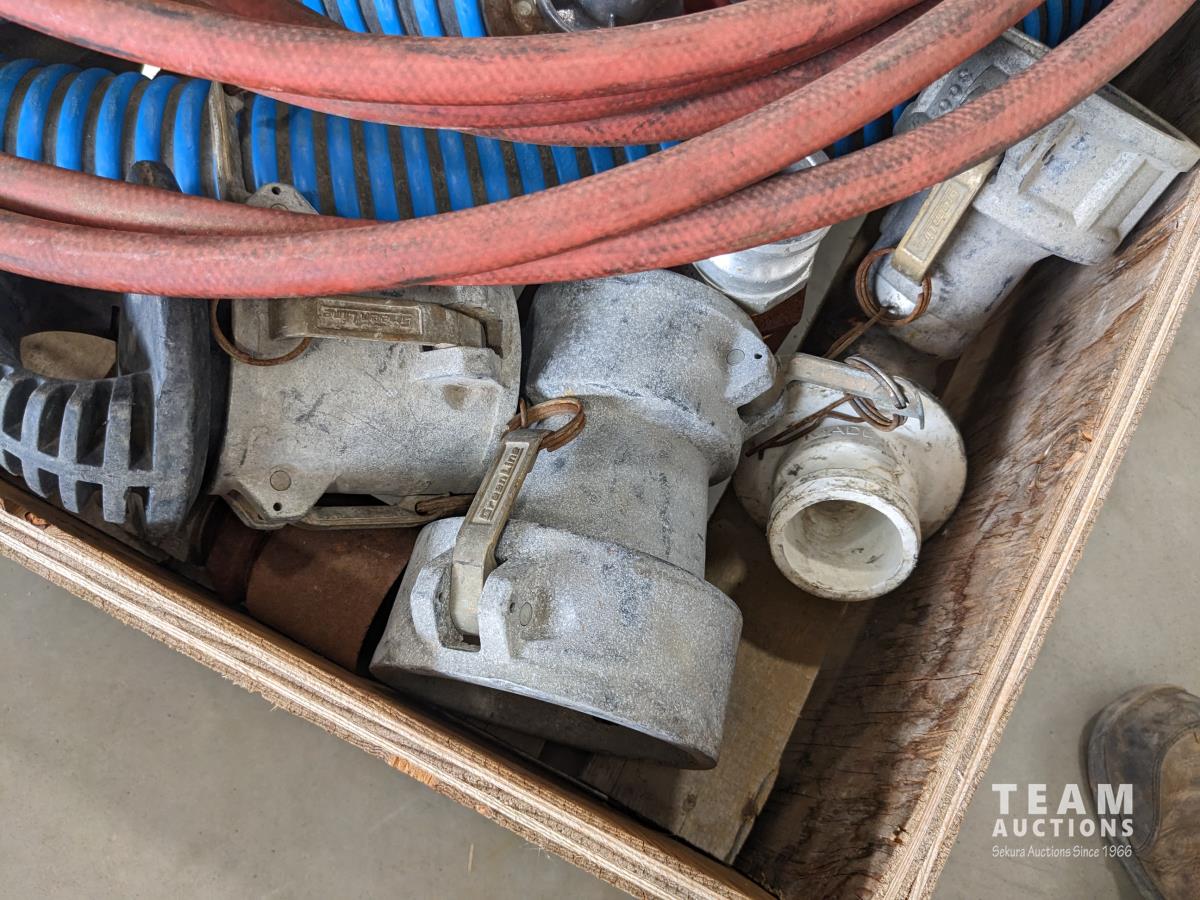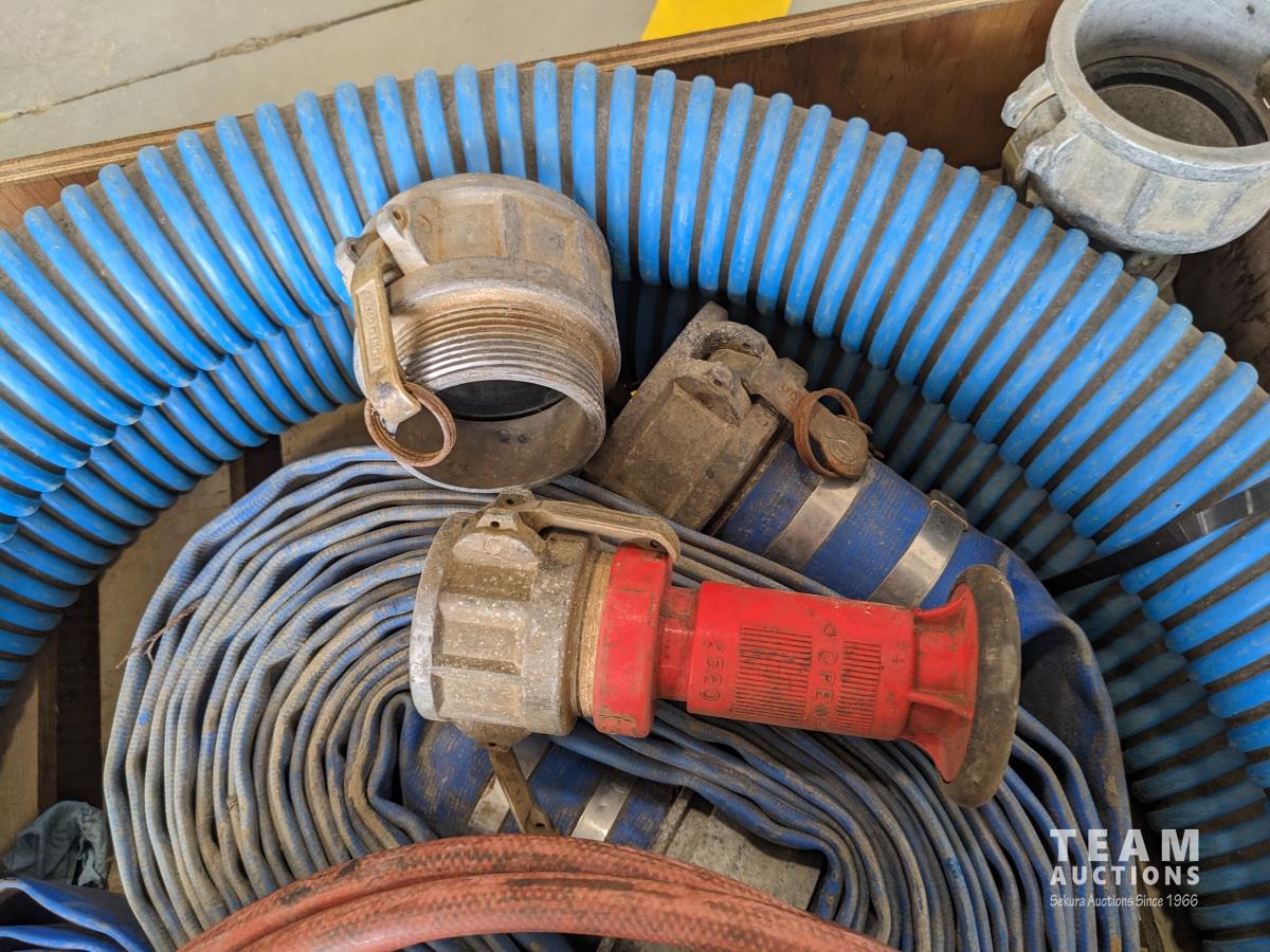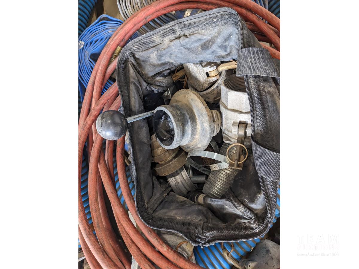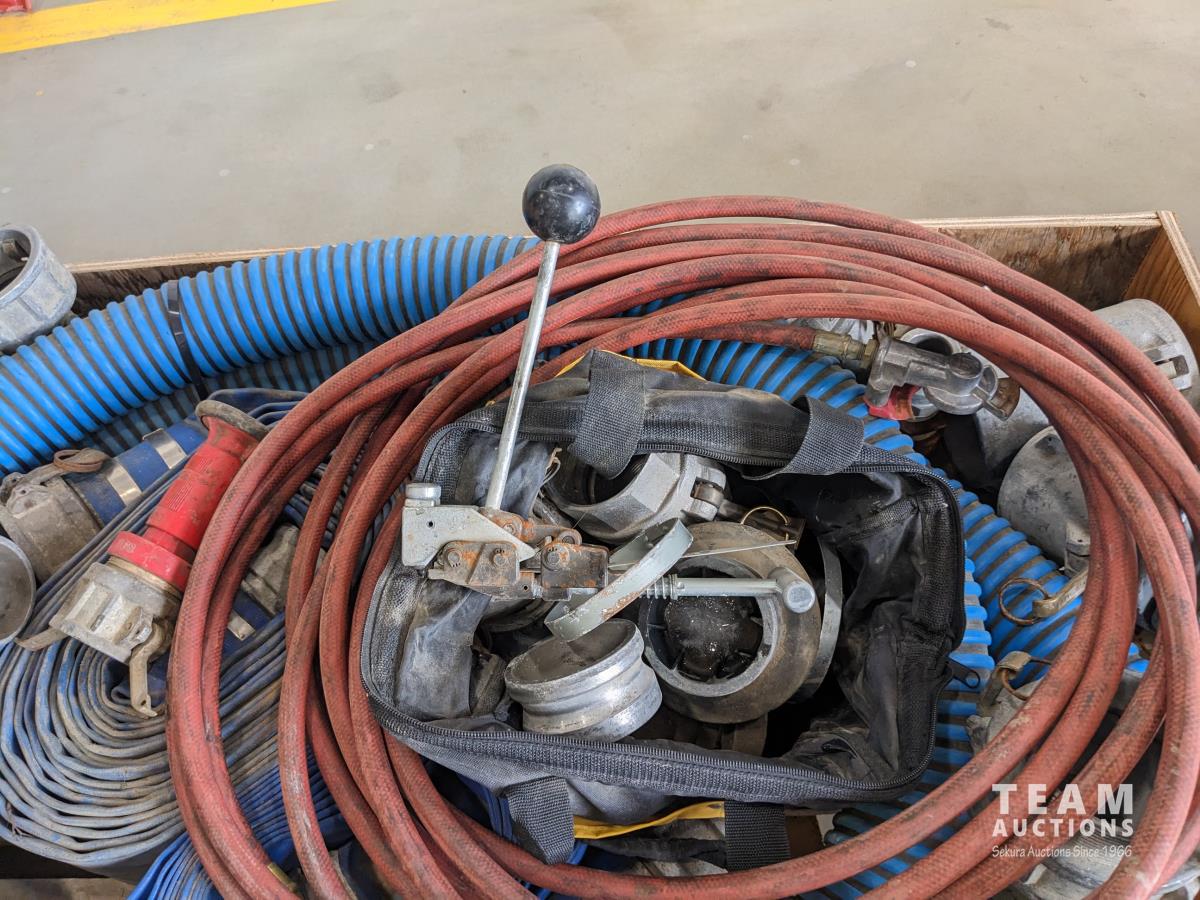 (2) 3 inch lay flat hoses, (2) short 3 inch suction hose, miscellaneous camlocks, hose clamp toll, fire nozzle