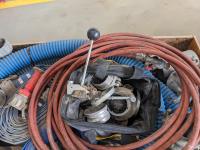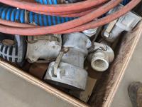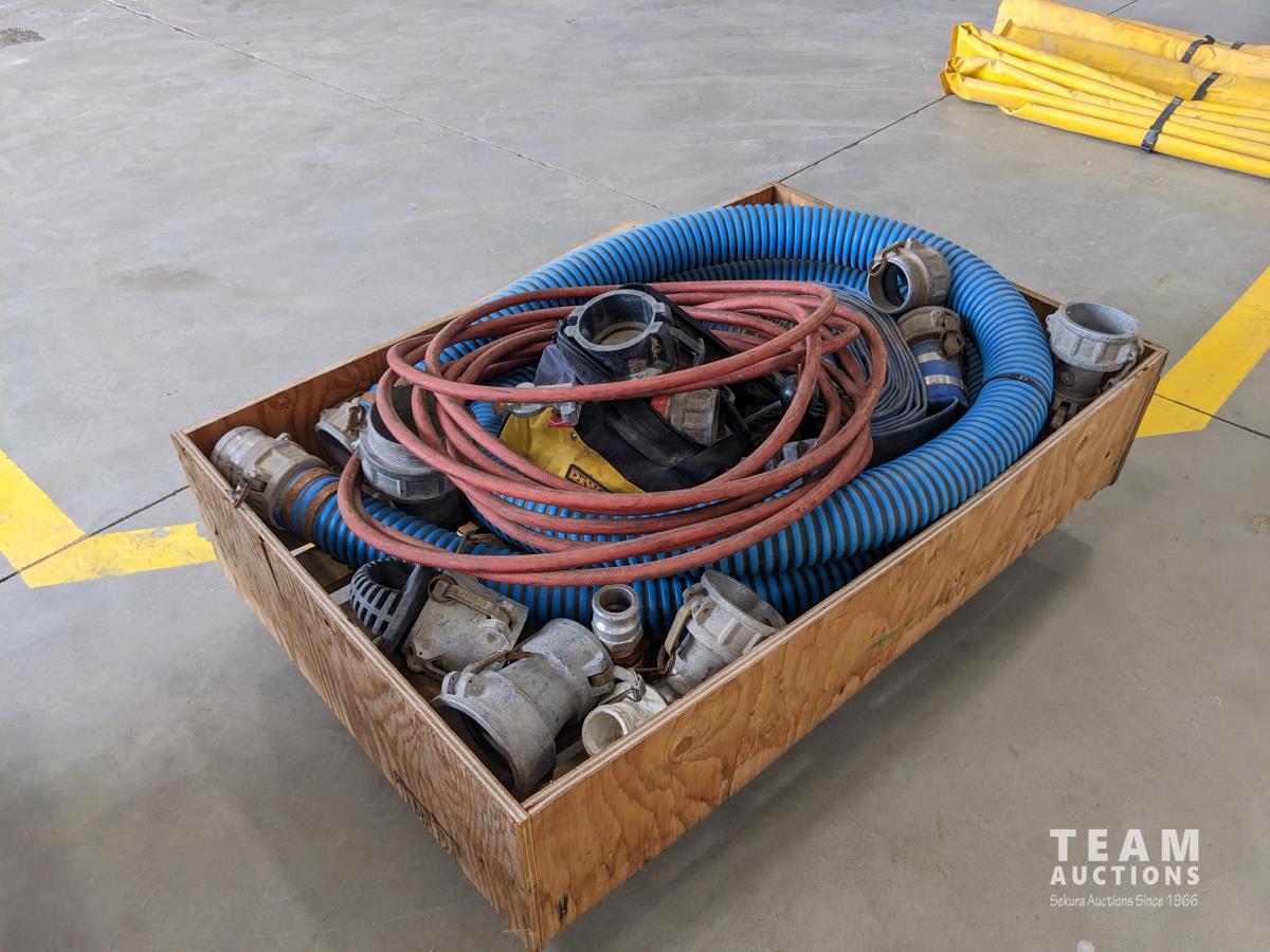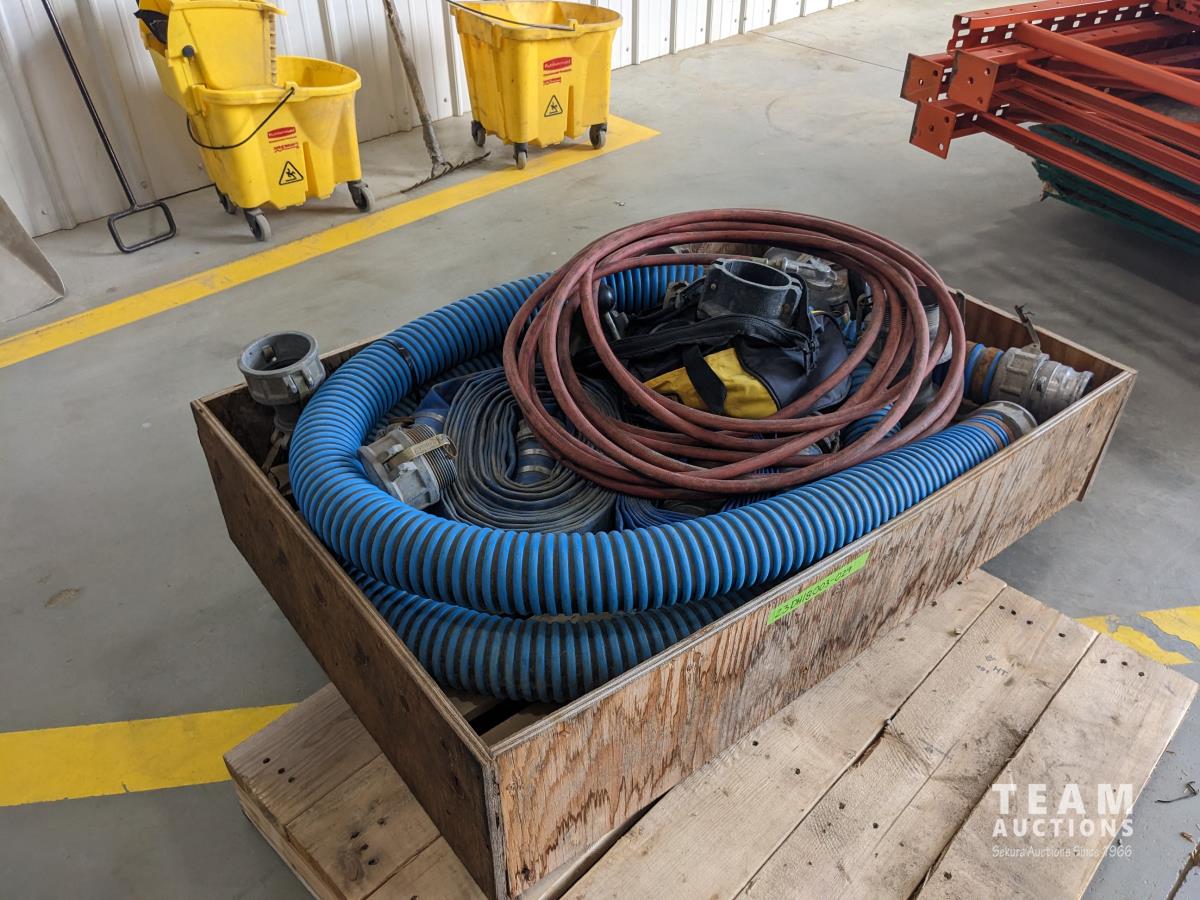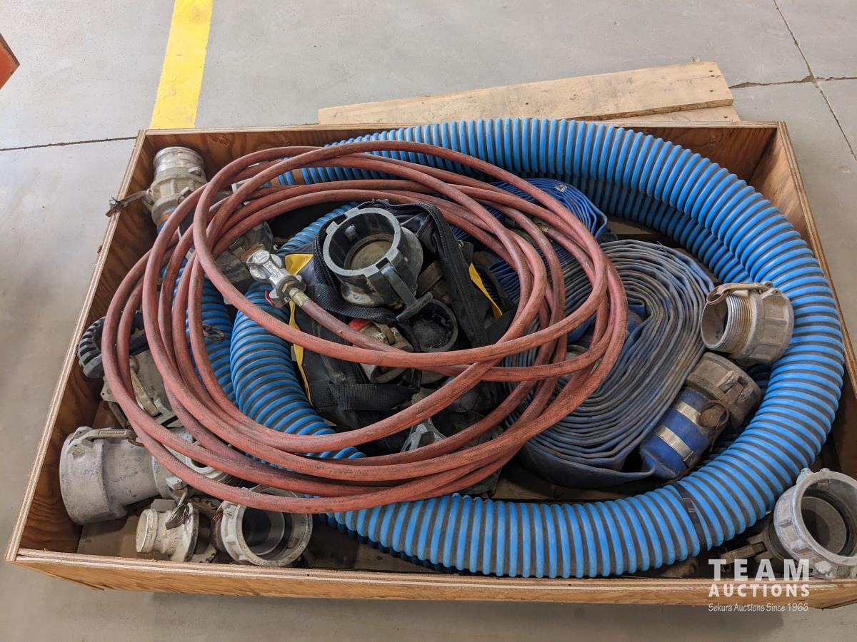 (2) 3 inch lay flat hoses, (2) short 3 inch suction hose, miscellaneous camlocks, hose clamp toll, fire nozzle