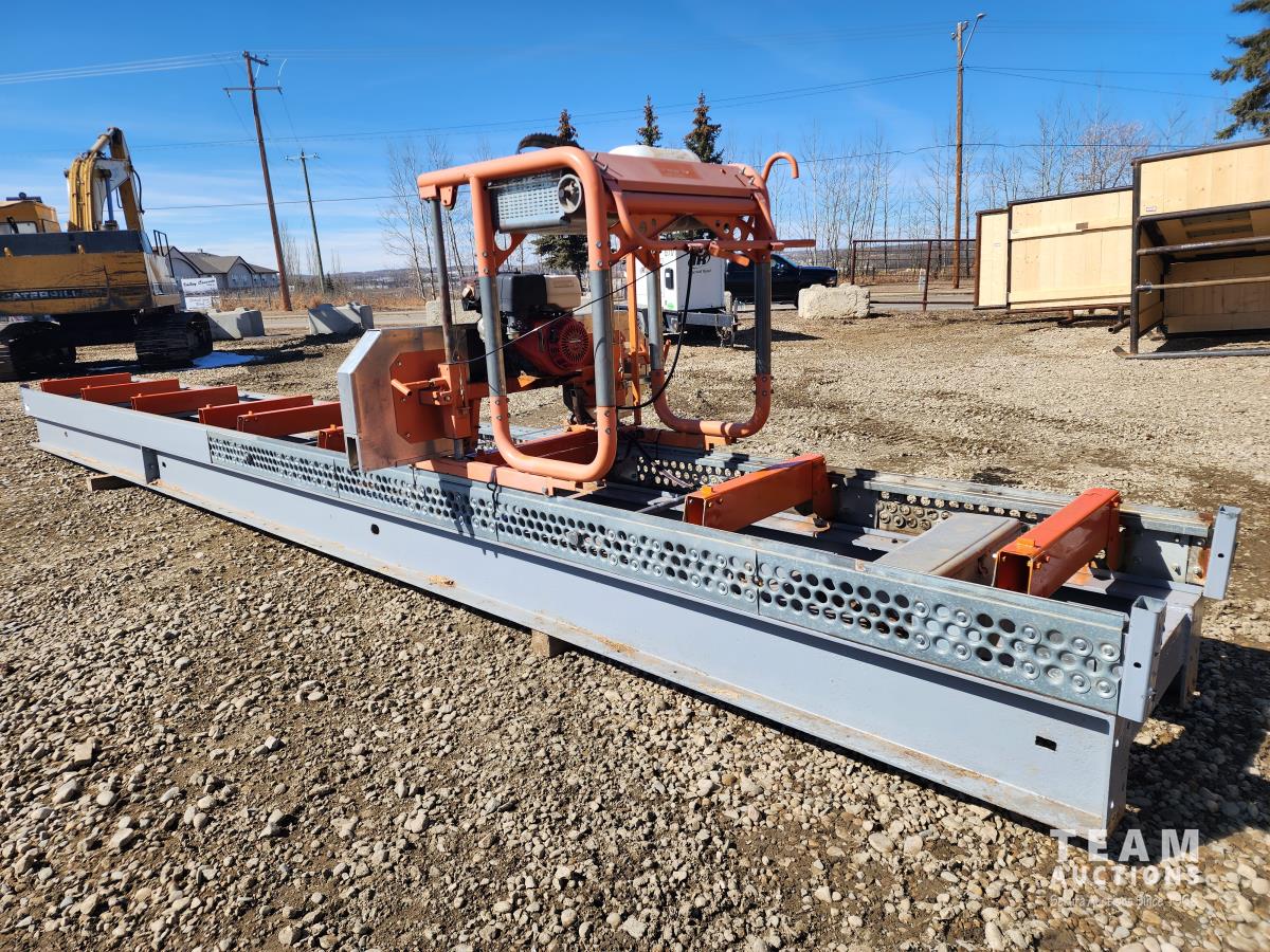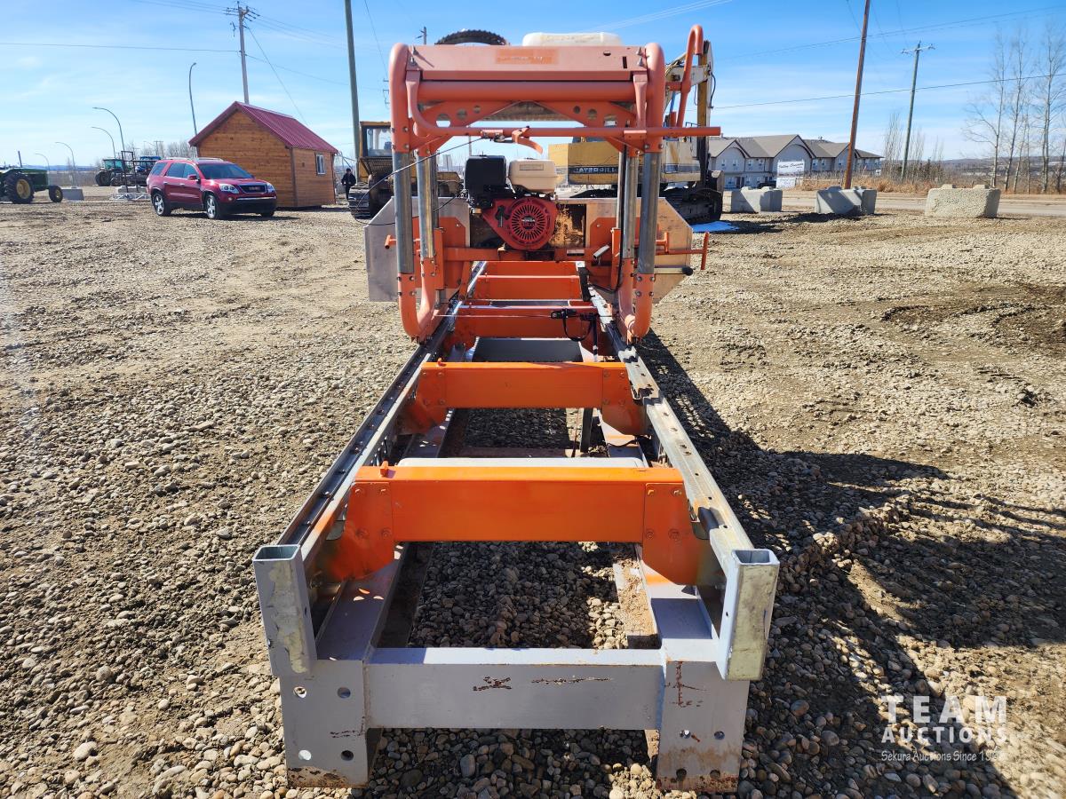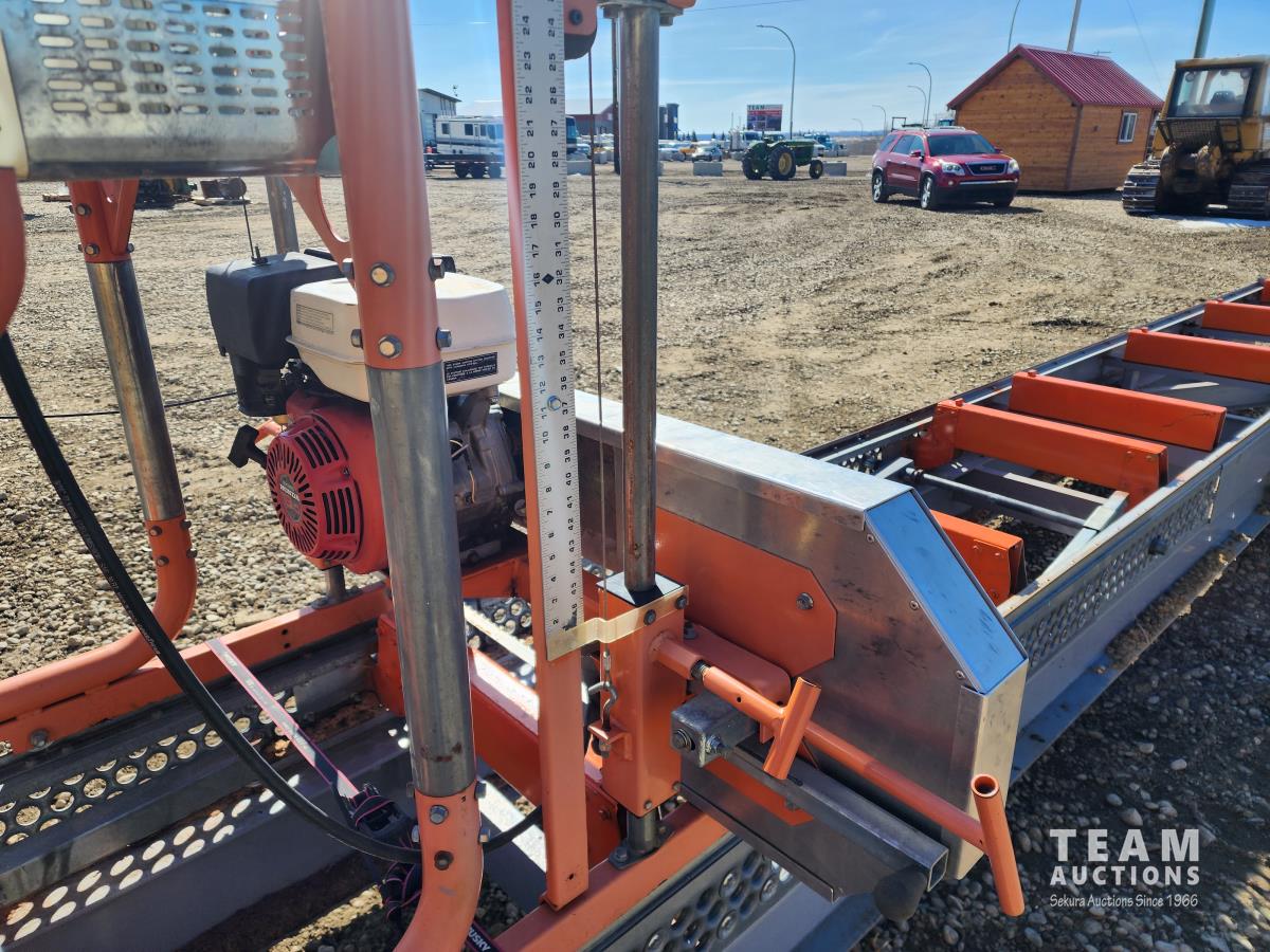 30 ft track, Honda GX390 13 HP gas engine, handles logs up to 31 inches in diameter, cuts boards up to 24 inches wide