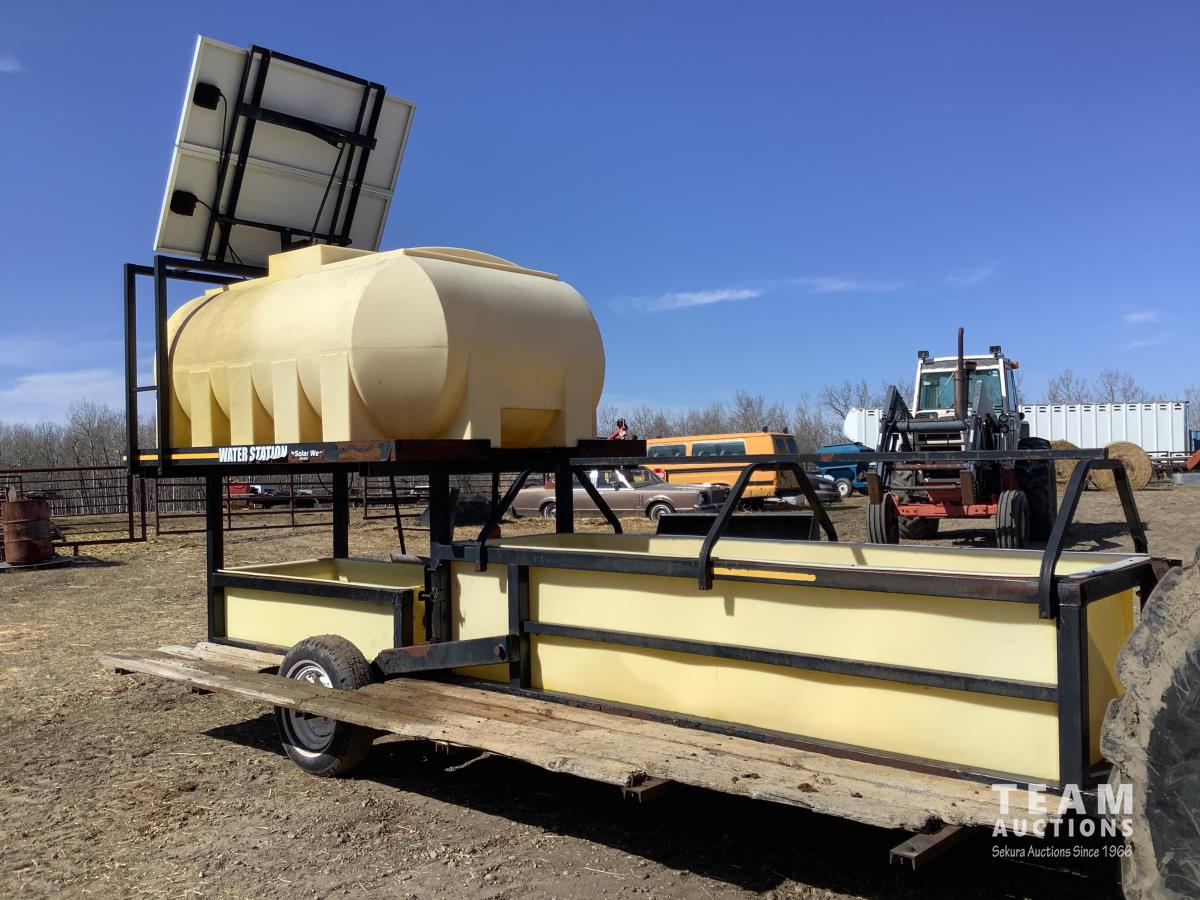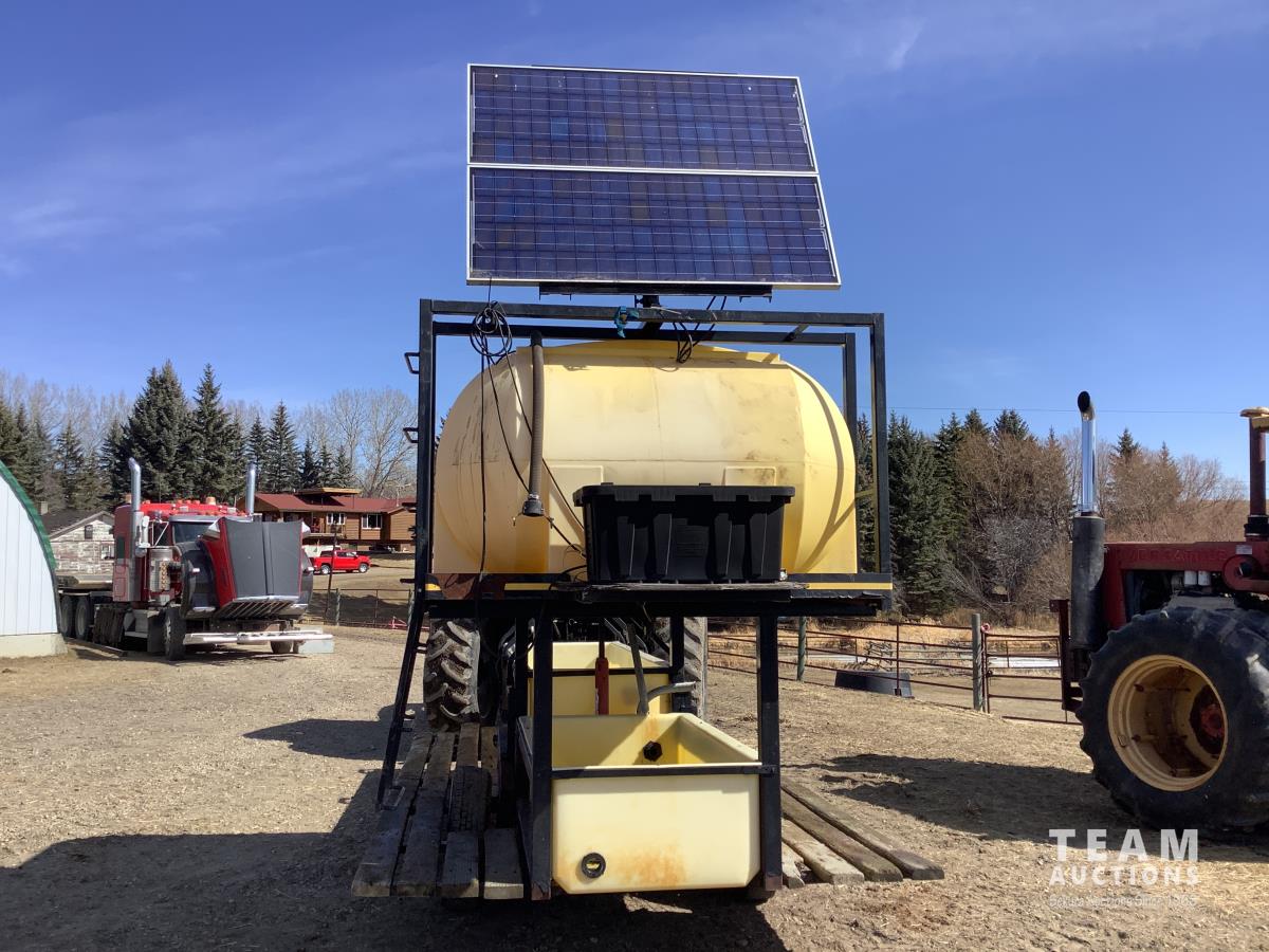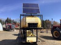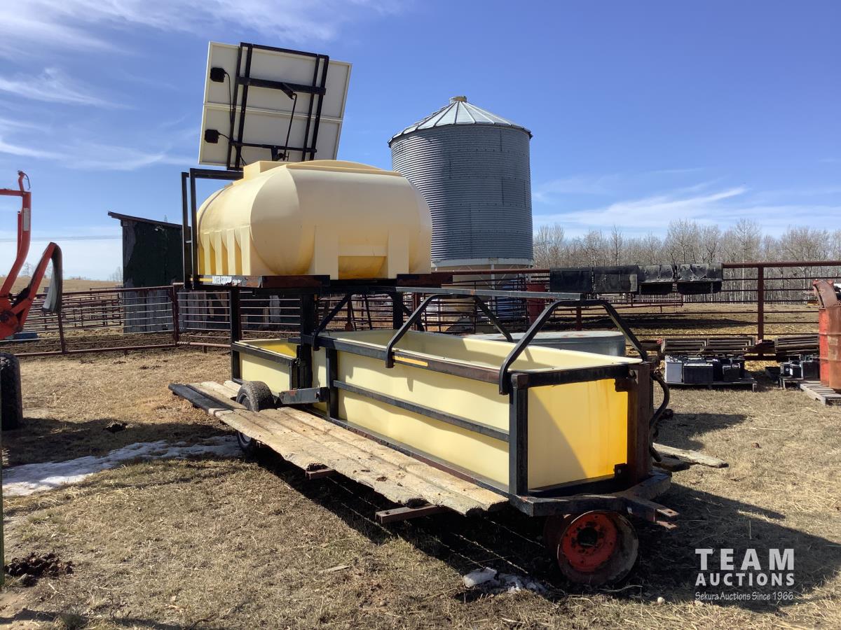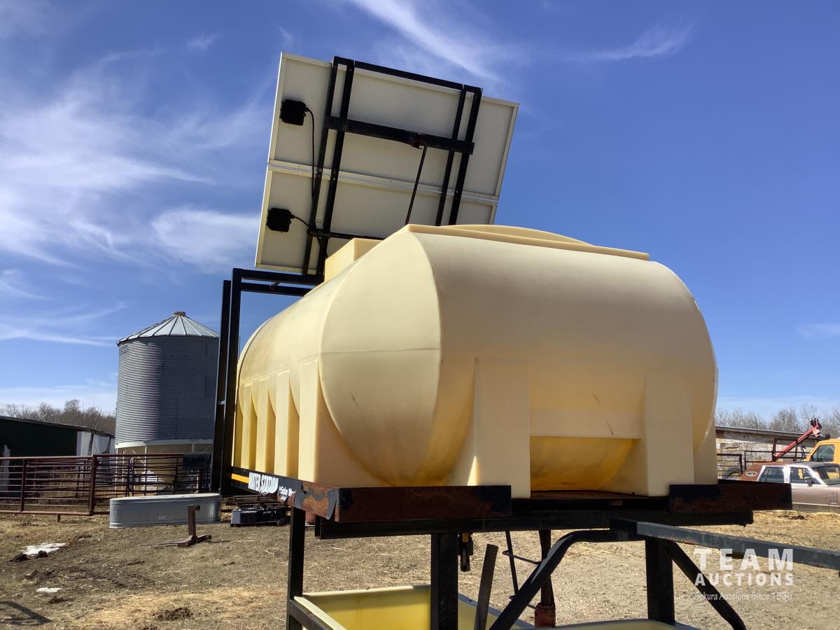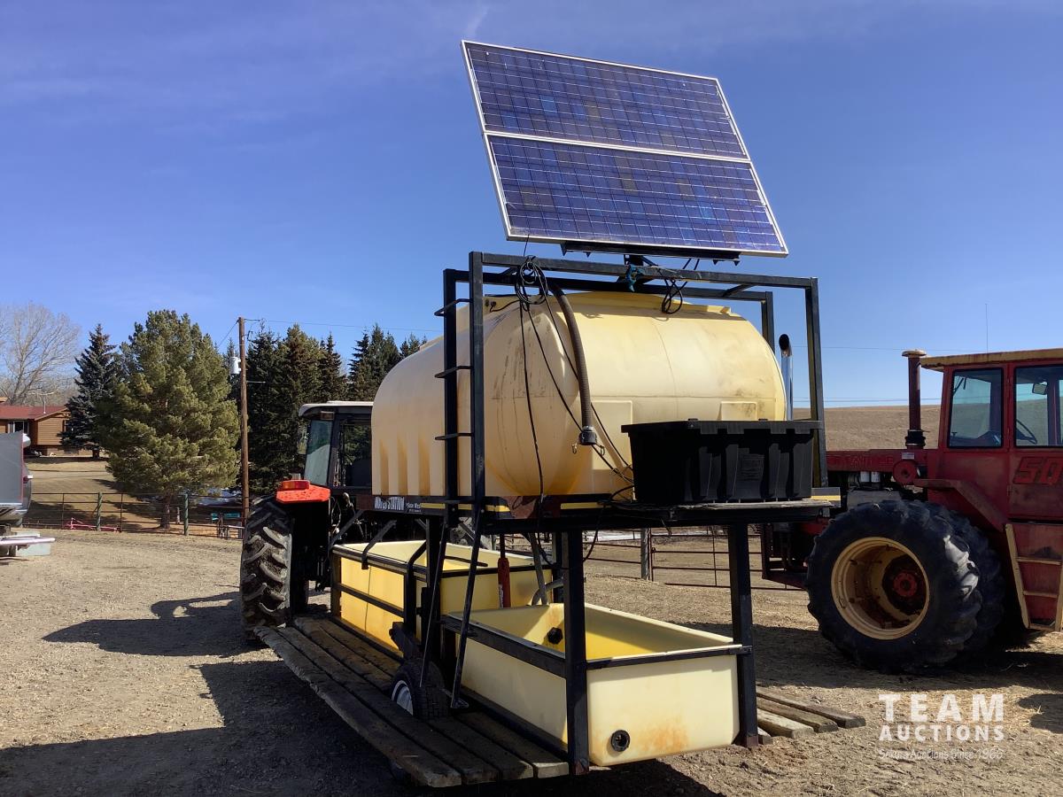 Solar panel with batteries and water pump, top holding tank, (2) drinking troughs, road transport kit, ground wood floor boards
