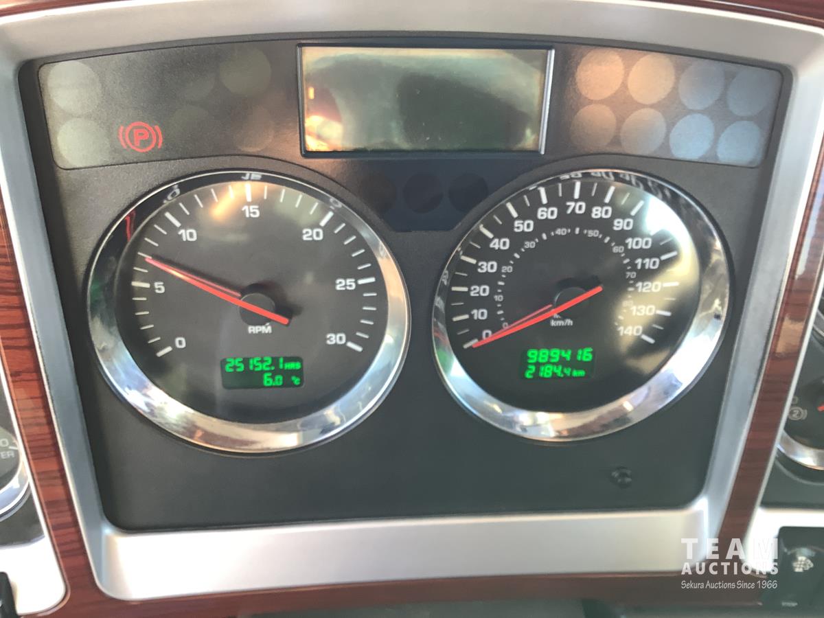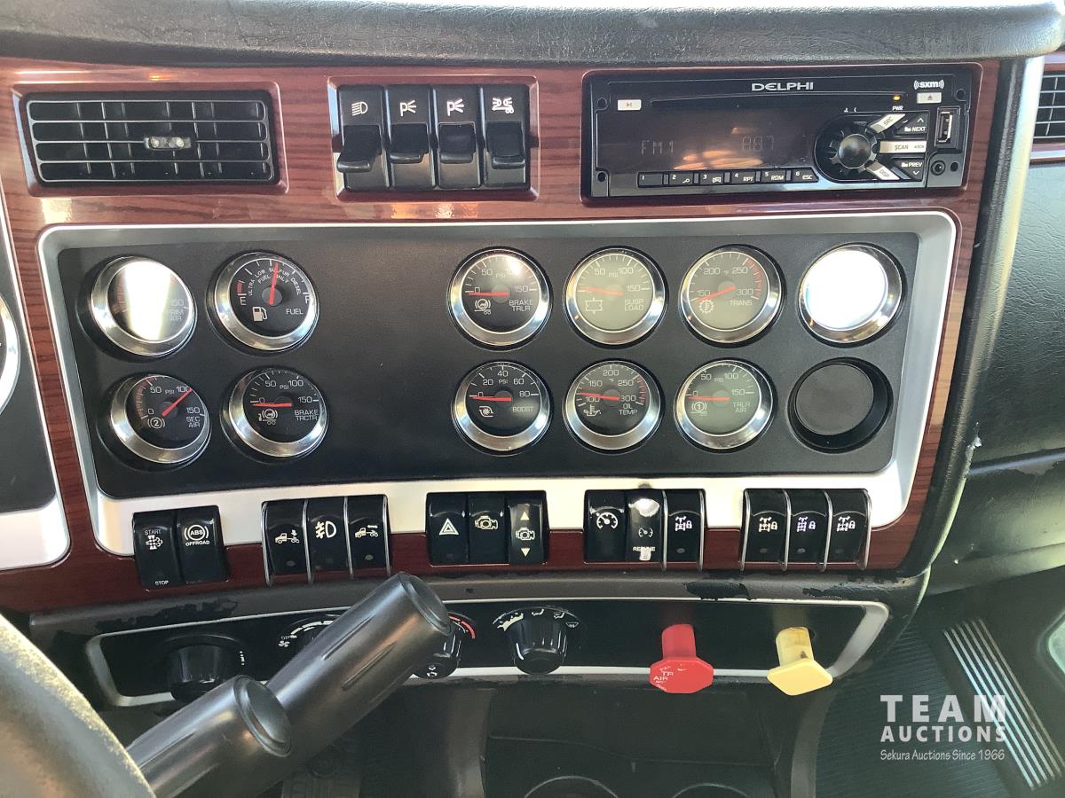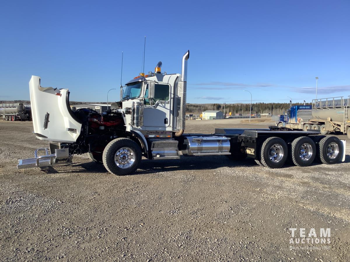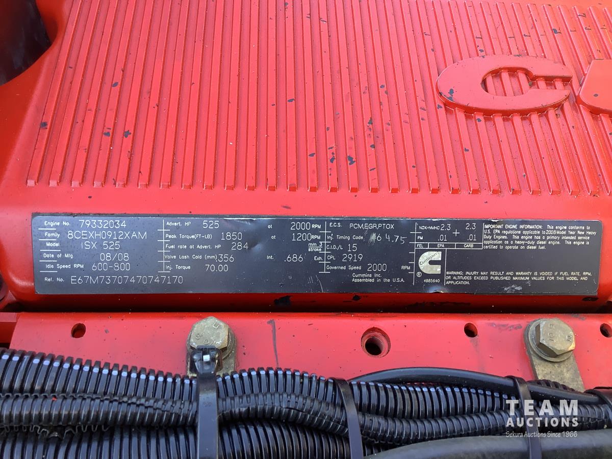 Cummins ISX 525 HP engine, engine brake, positive air shutoff, emissions deleted, Eaton Fuller RTLO18918B 18 speed manual transmission, A/C, radio, CB radio, moose bumper, beacons, Neway air ride suspension, 20,000 lb front axle, full lockers, 270 inch WB, Dana Spicer T69-170HP58K rears, 280 inch from back of cab to end of frame, all aluminum wheels, 385/65R22.5 front tires, 11R24.5 rear tires