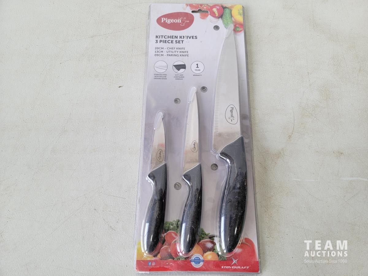 1947 Pigeon 3 Piece Kitchen Knife Set and (2) Single Kitchen Knives (Unused)