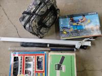 Inflatable boat, jungle fogger (bug killer), Christmas train set, (2) baseball bats, Singer sewing machine with carrying bag and light