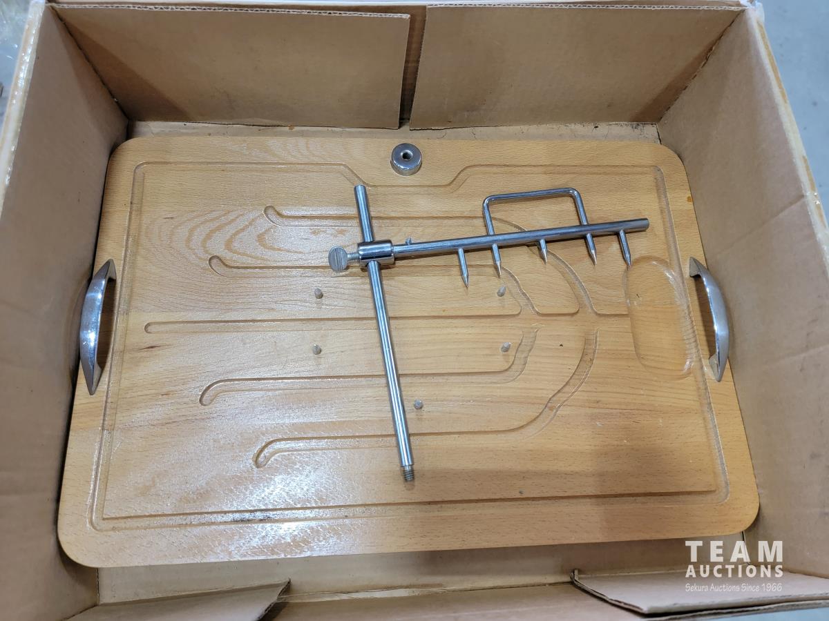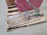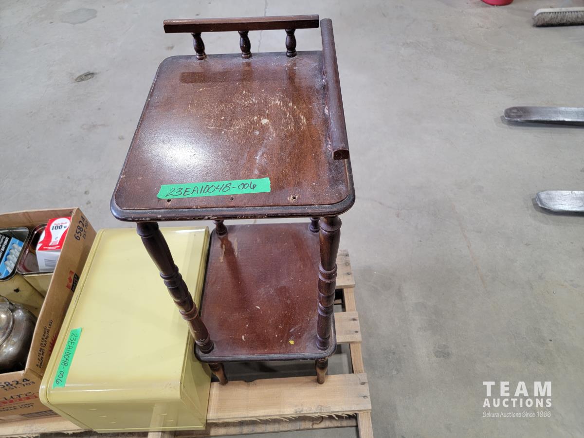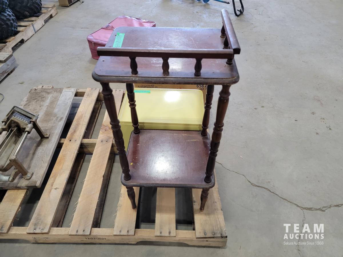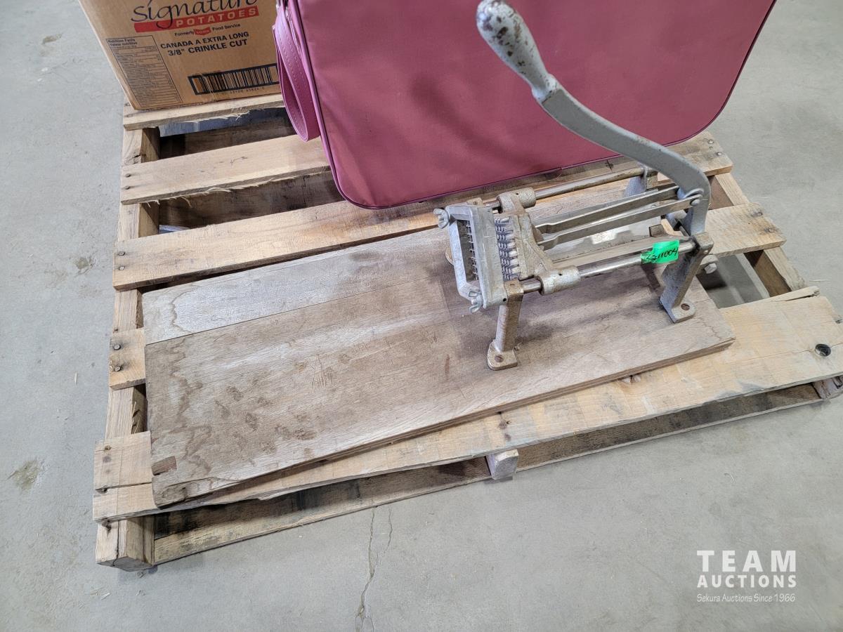 End table, meat cutting board, suitcase, french fry cutter