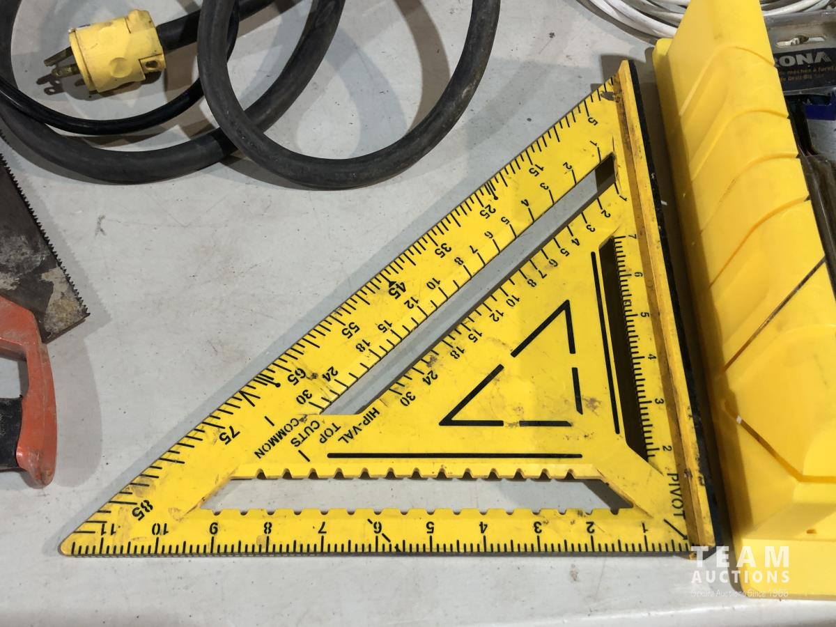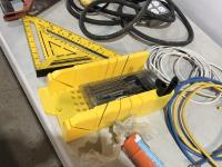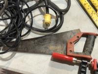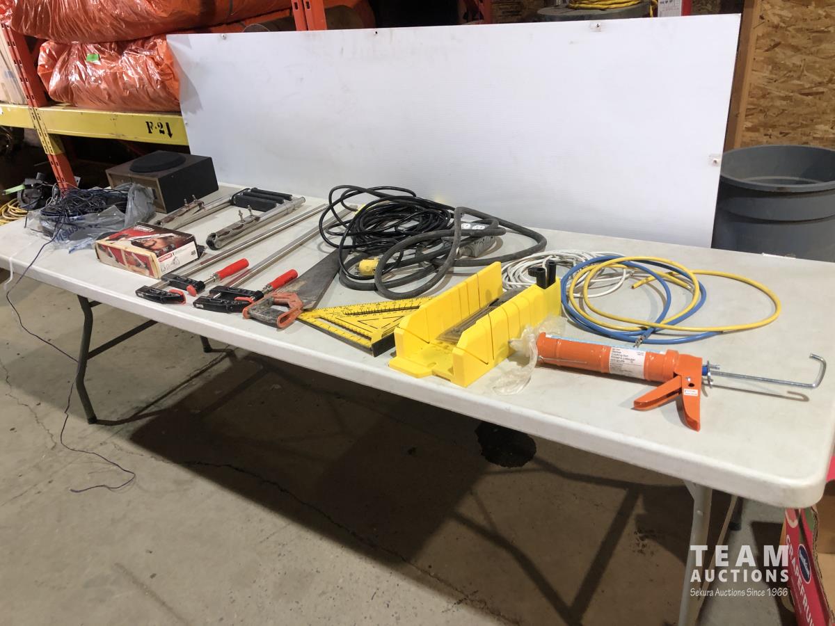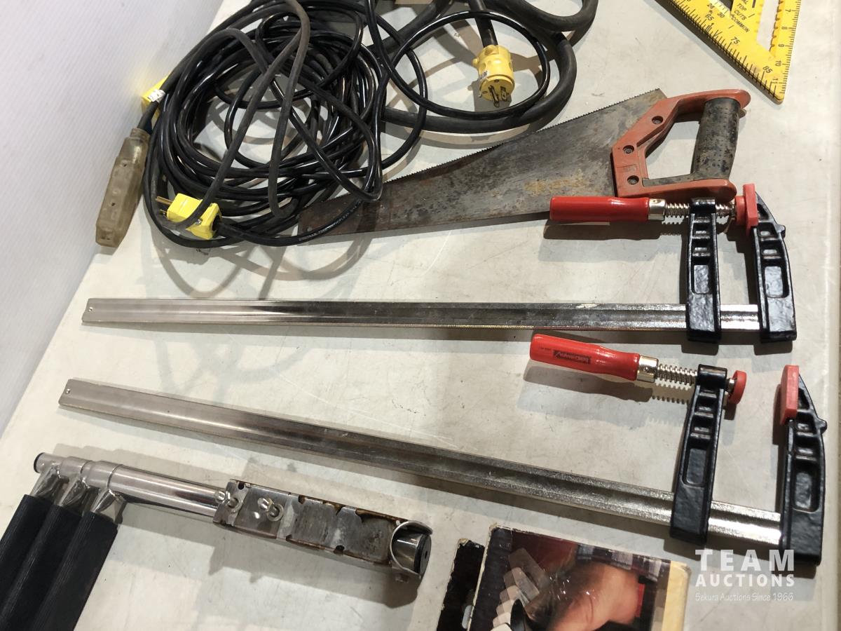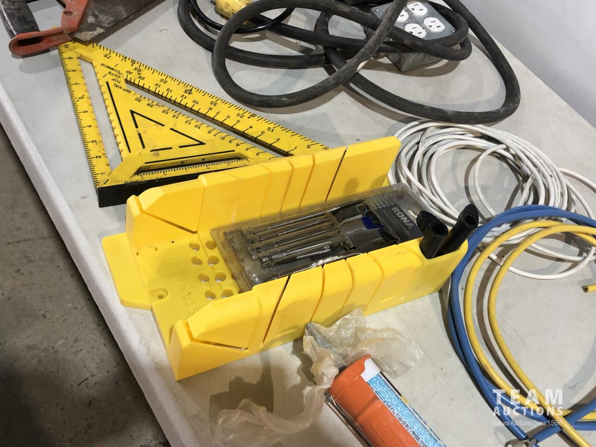 Clamps, speed square, extension cords, speakers, hand saw, caulking gun, hand planer, spade bits and miter box