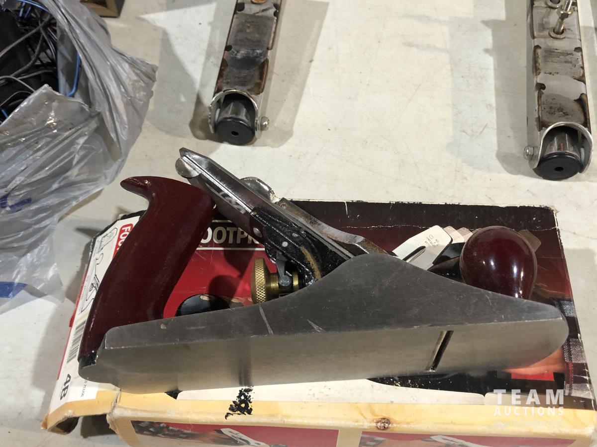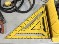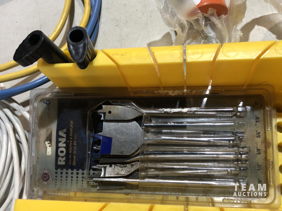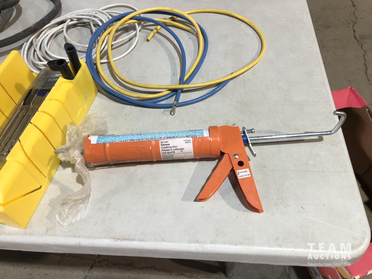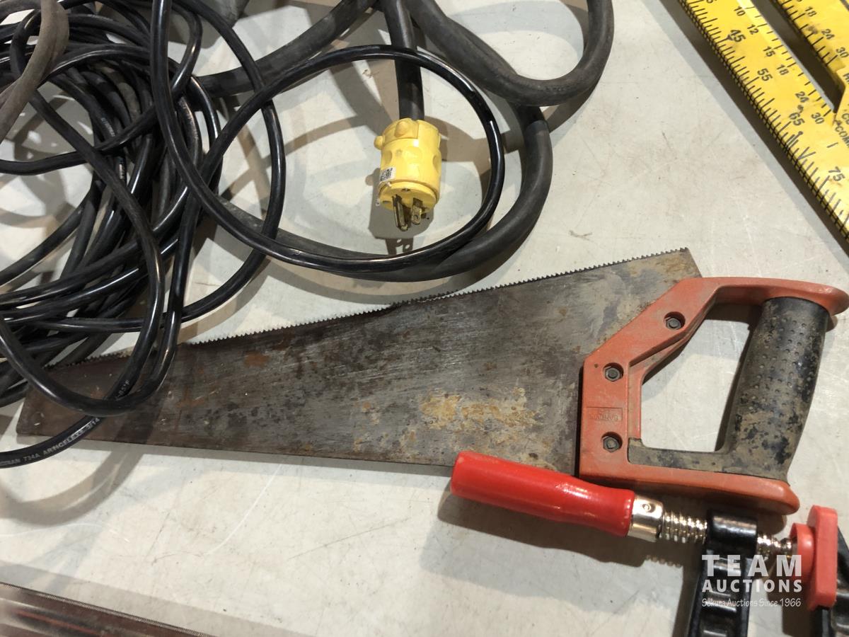 Clamps, speed square, extension cords, speakers, hand saw, caulking gun, hand planer, spade bits and miter box