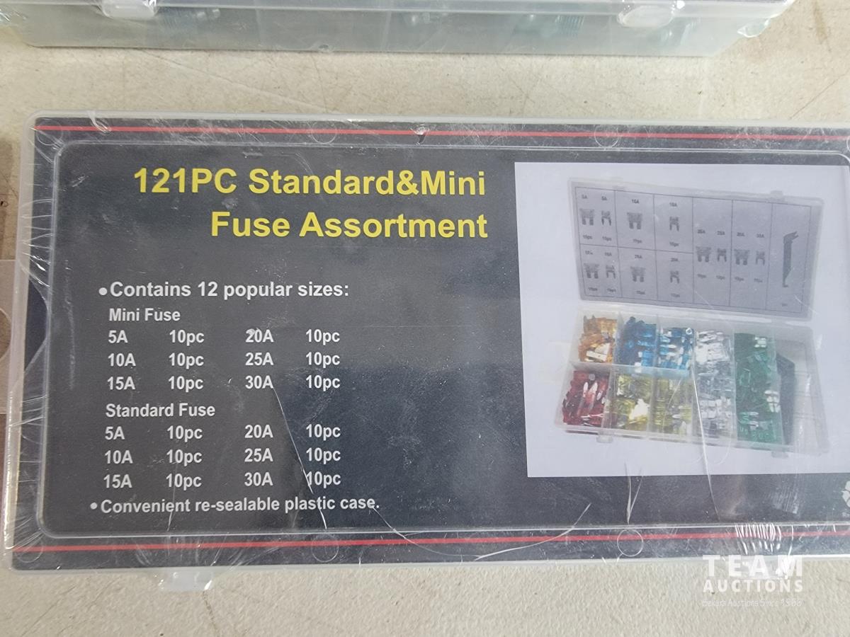 121 piece Standard & Mini Fuse Assortment, 70 piece Hydraulic Grease Fitting Assortment, 158 piece Wire Connector Assortment, 28 piece Electrical Clip Assortment