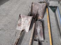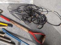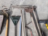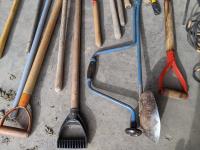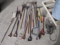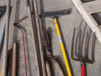 Qty of garden hand tools, metal barrel, qty of snow fence and (9±) posts