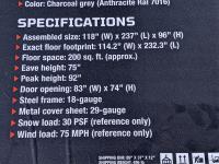 7 ft 8 inch peak height, side entry door, 185 sq ft floor space
