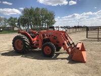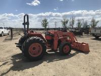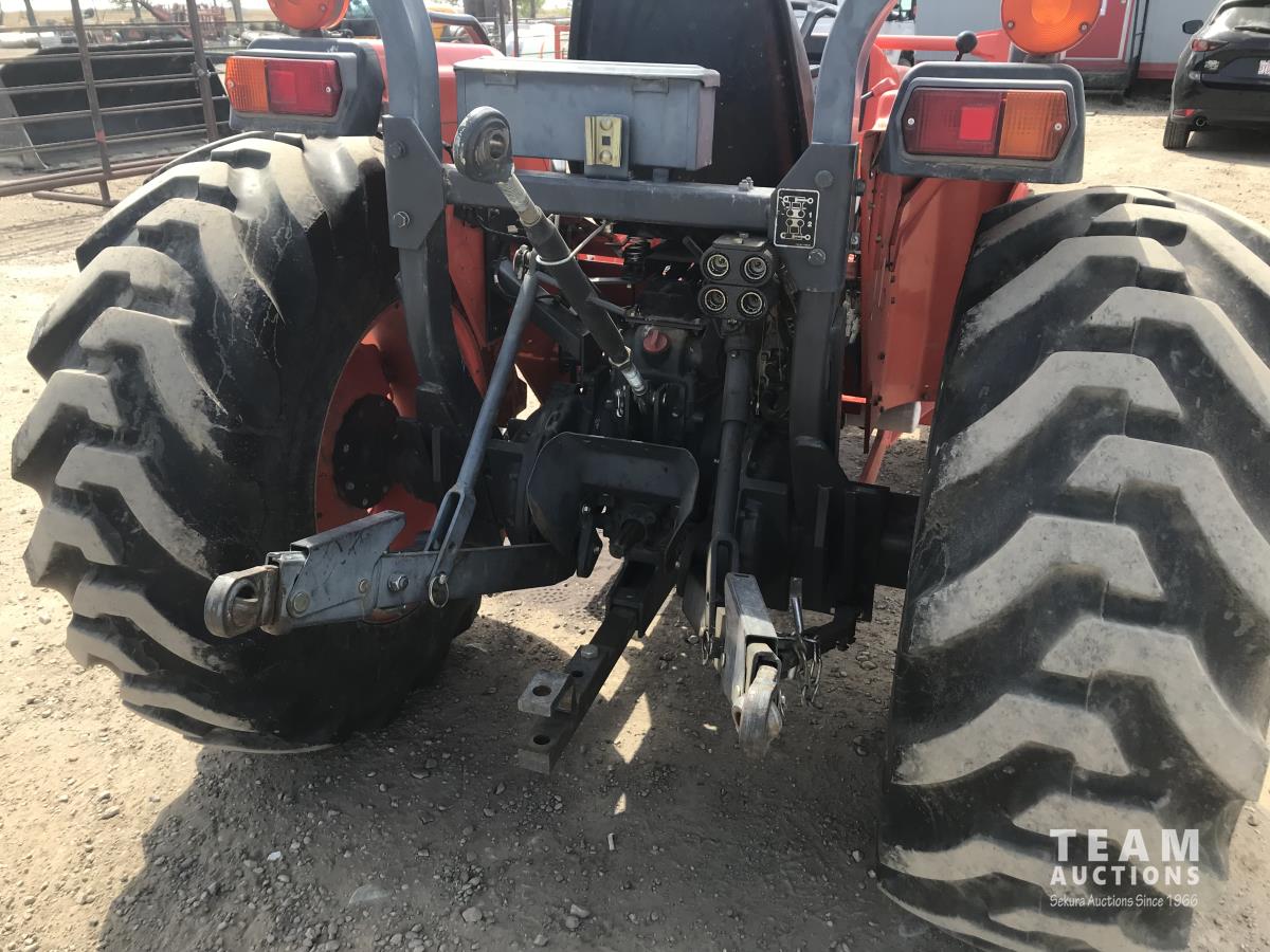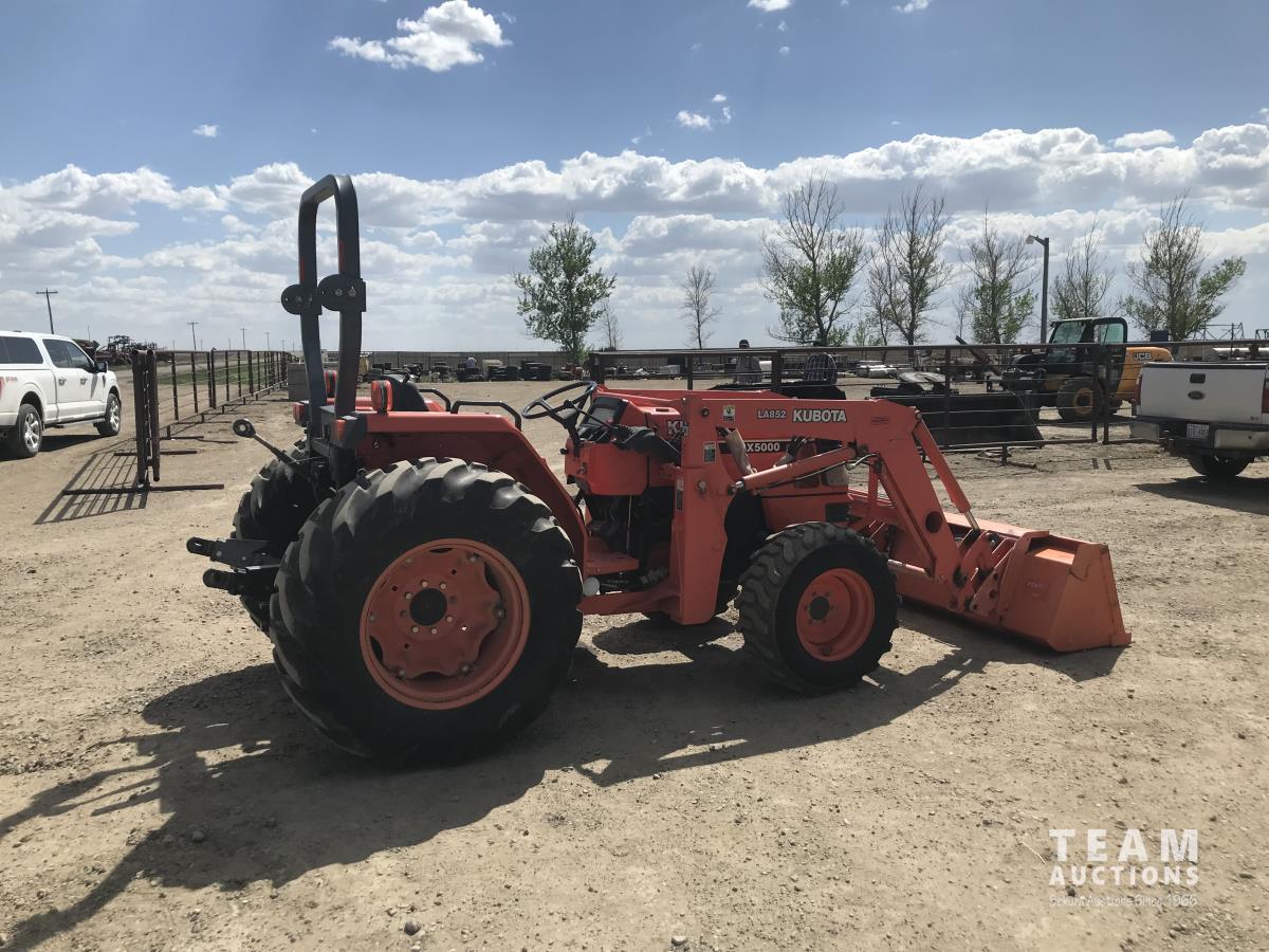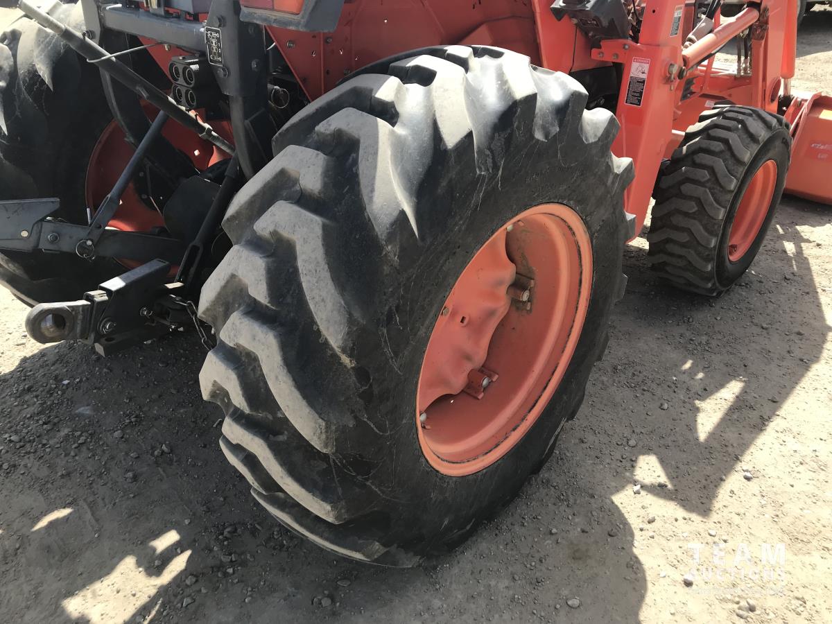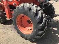 Kubota LA852 loader, 71 inch bucket, Kubota 2.4 4 cylinder 50 HP, diesel engine, 44 PTO HP, 8 speed partial synchro transmission, 14 GPM hydraulic pump, open station platform, 540 PTO, 3 point hitch, 2 rear hydraulic outlets, 12-16.5 front tires, 17.5L-24 rear tires