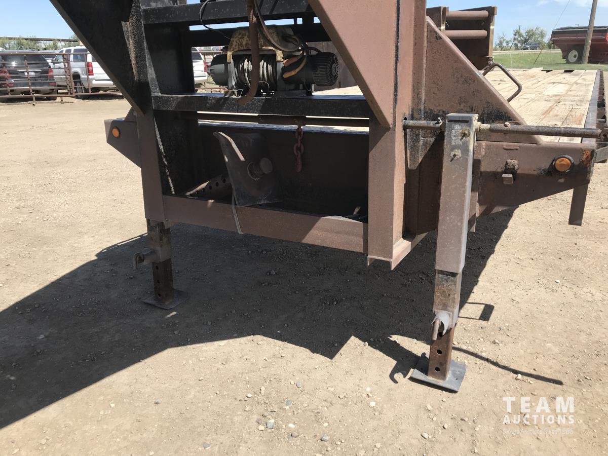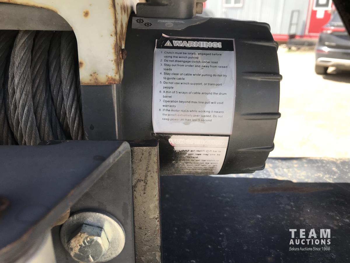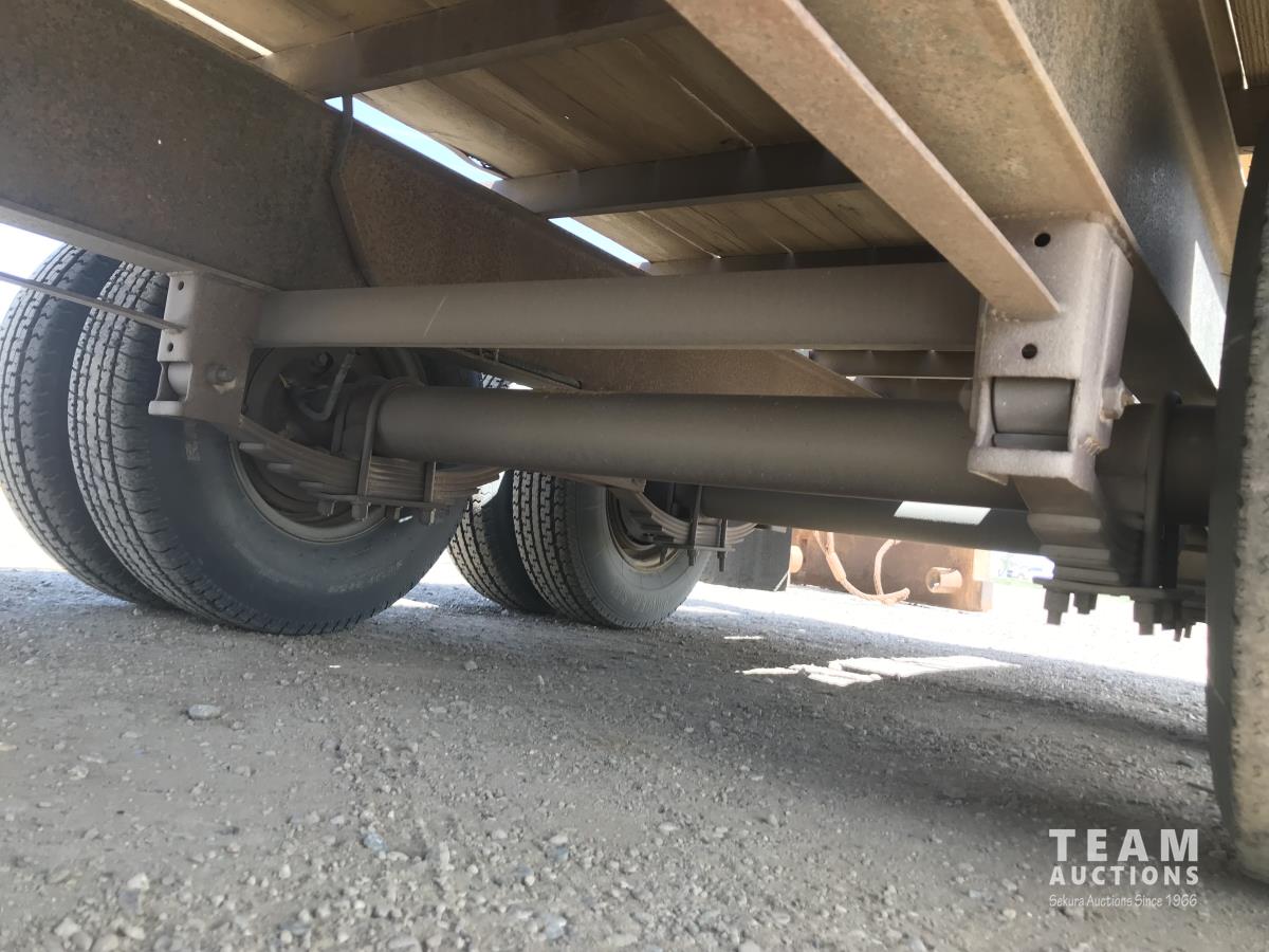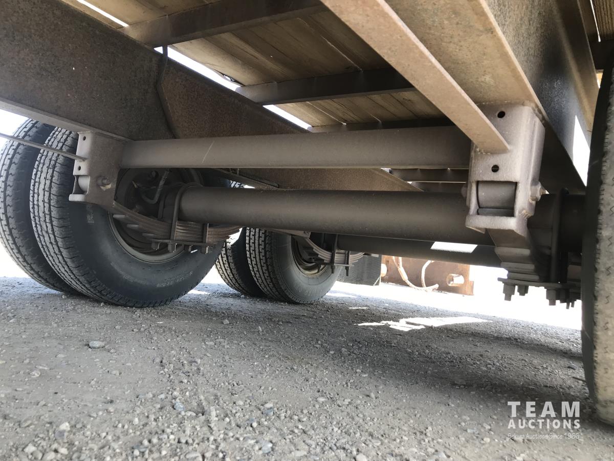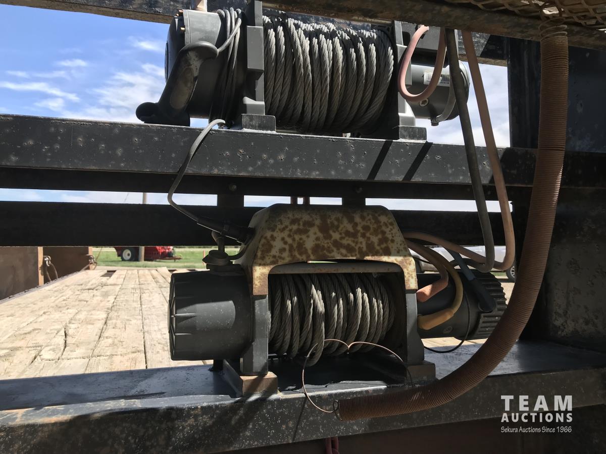 102 inch wide deck, wood deck, stake pockets, rub rails, cargo winches, rear live roll, 10, 500 Lb. axles, (2) 17, 500 lb. winch, spring suspension, ST235/80R16 tires