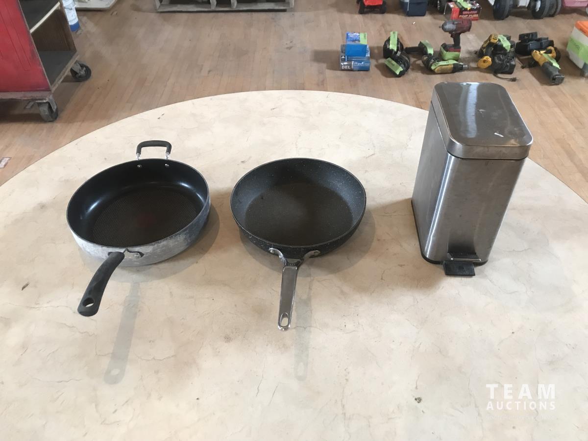1103 (2) Frying Pans w/ Small Garbage Can