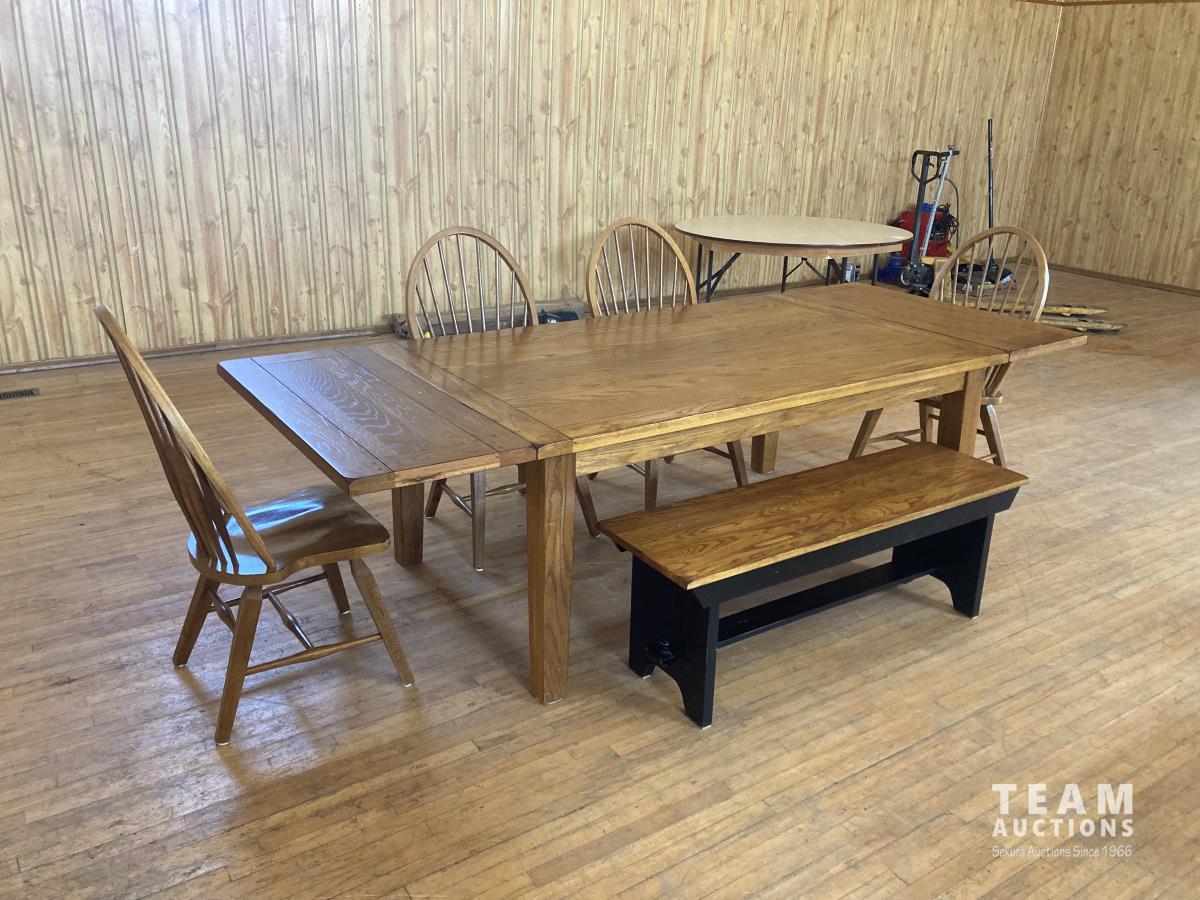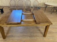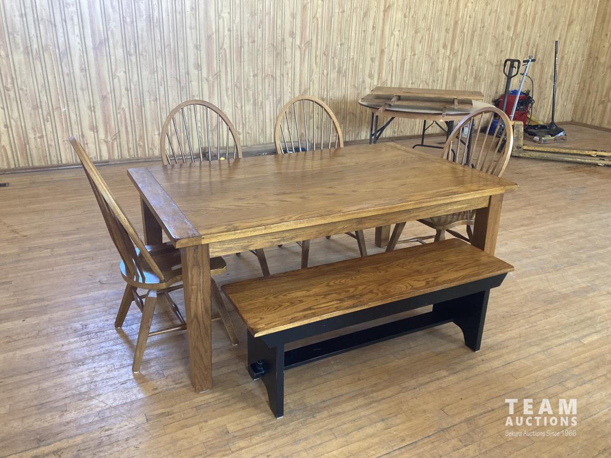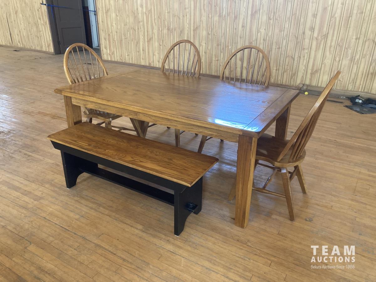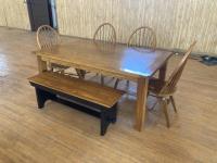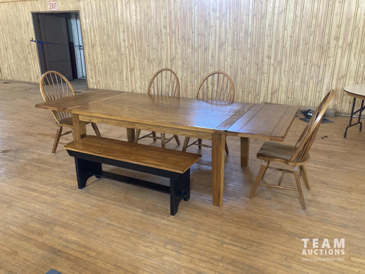 72 X 44 inch table w/ 2 18 inch extensions, 4 chairs, bench seat