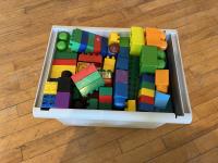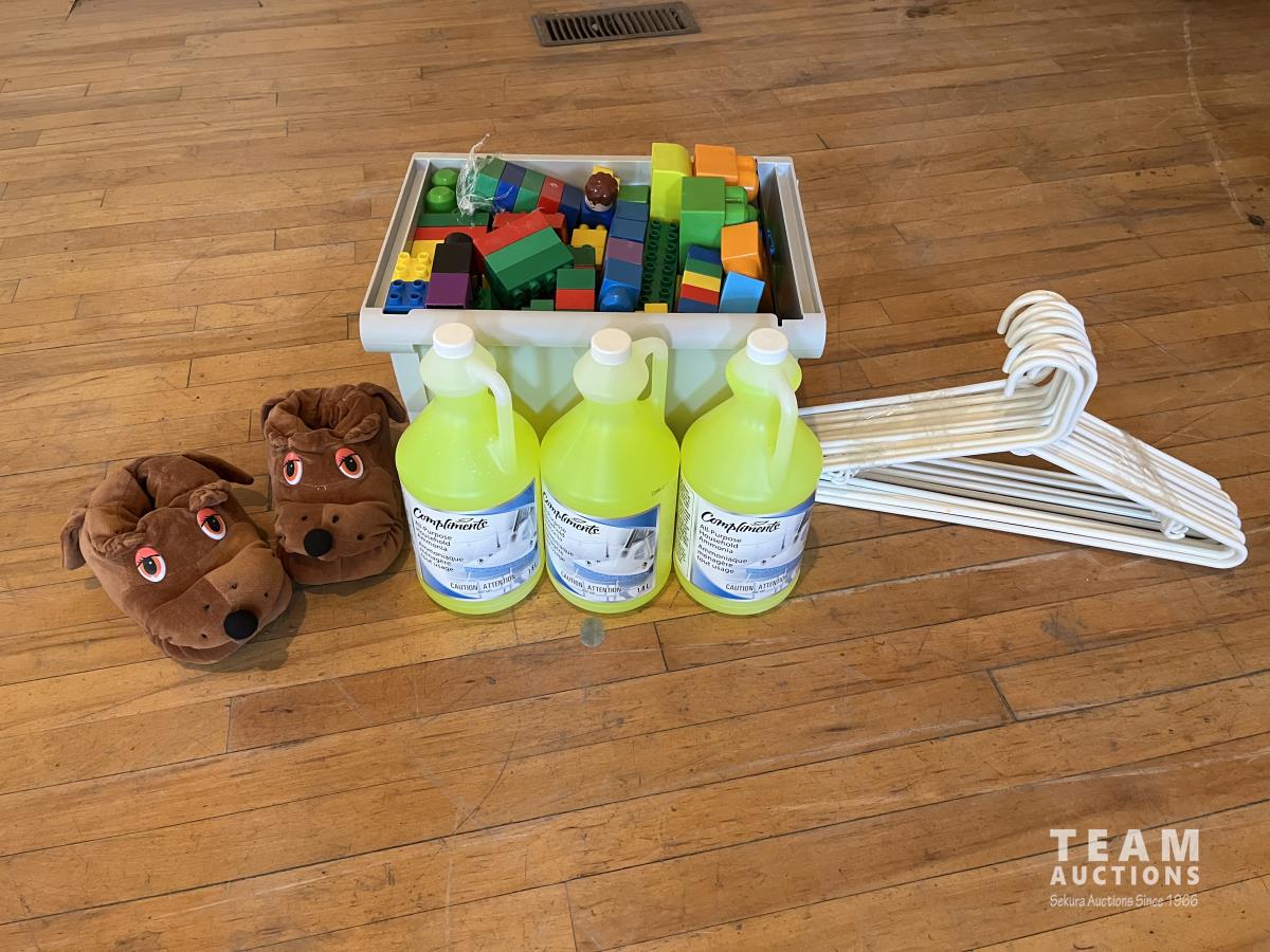 Childrens Size M Slippers, Clothes Hangers, (3) Bottles of Cleaner, Childrens Blocks