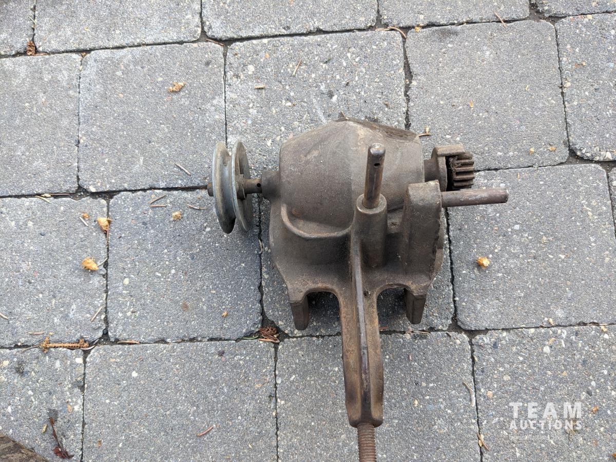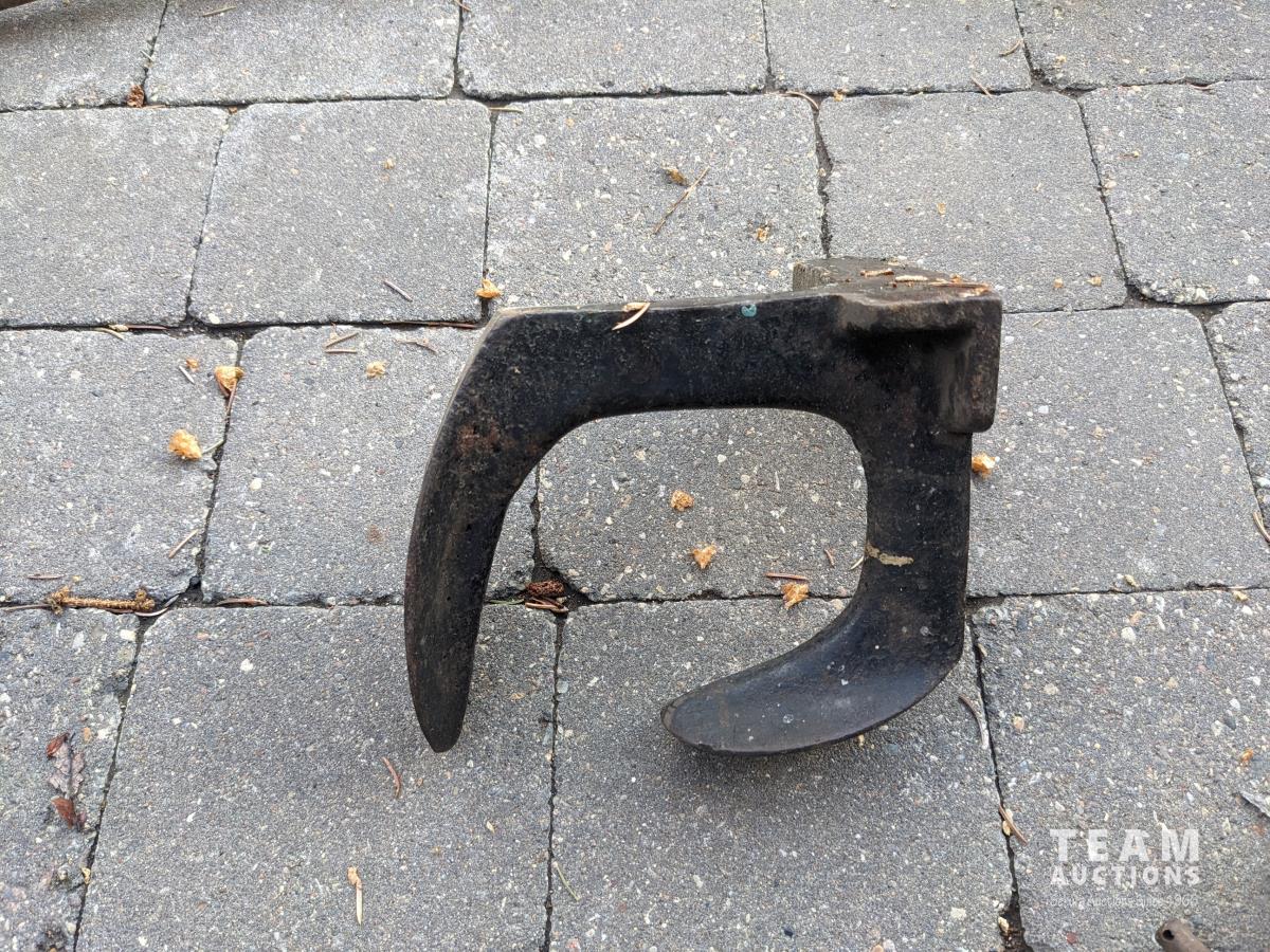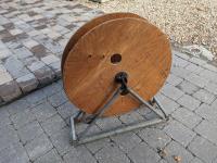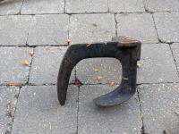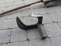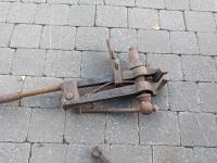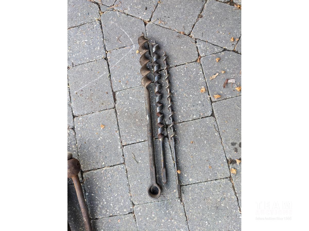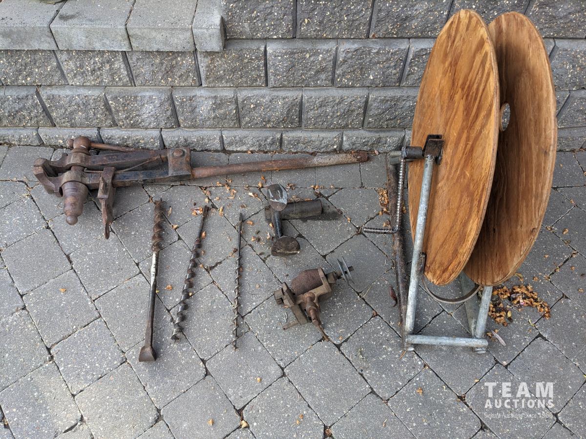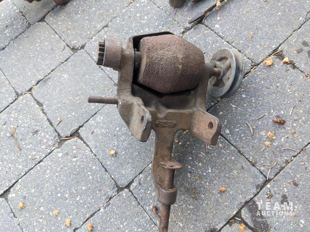 Sickle sharpening stone, (3) wood drill bits, hose or cord reel, blacksmith's vise, shoe repair anvil