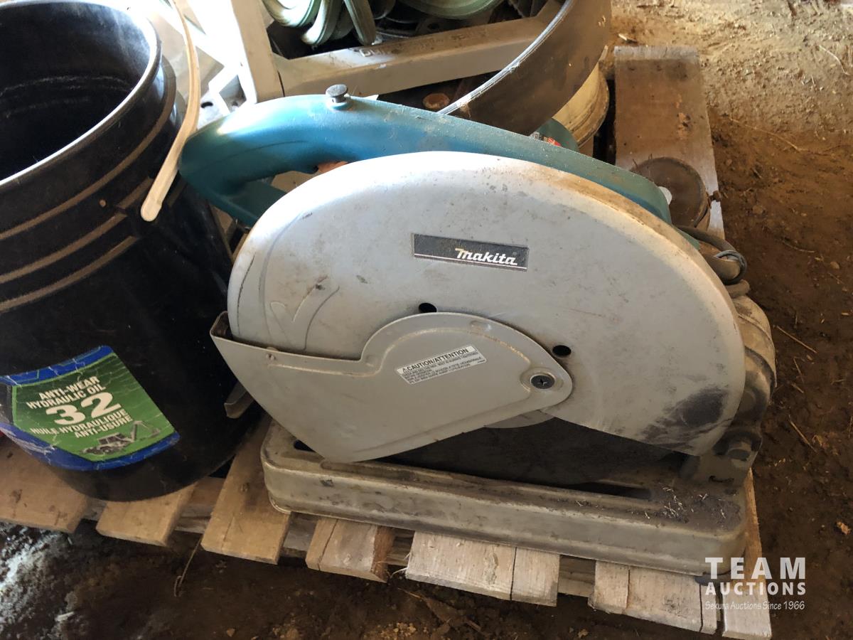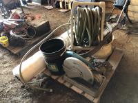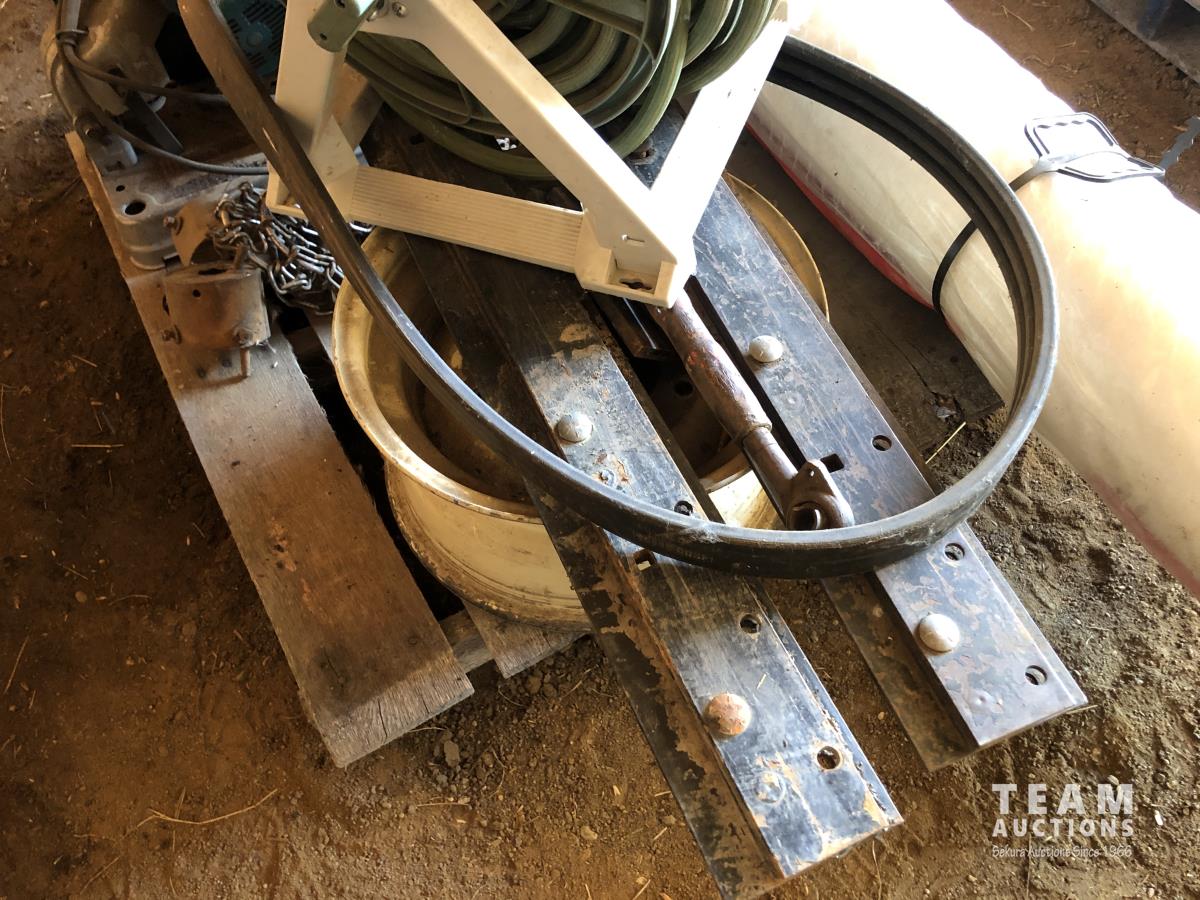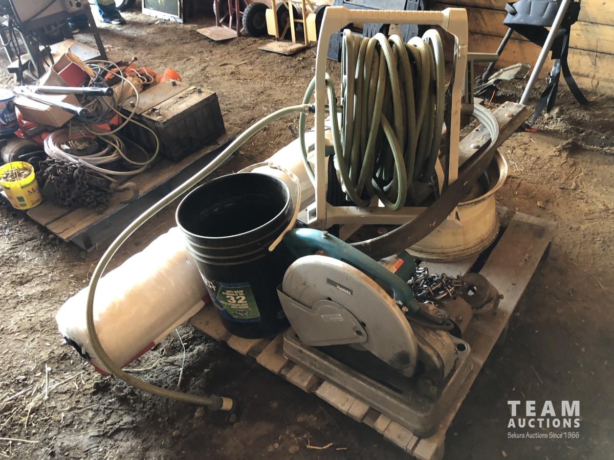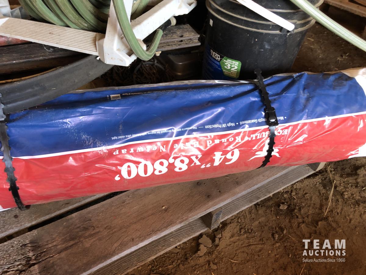 Eco Bull net wrap (64 inch x 8,000 ft, 14 inch Makita chop saw, garden hose and reel, 3 ft grader blades, rim