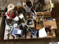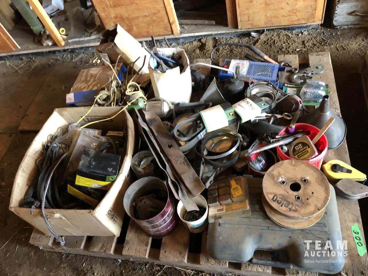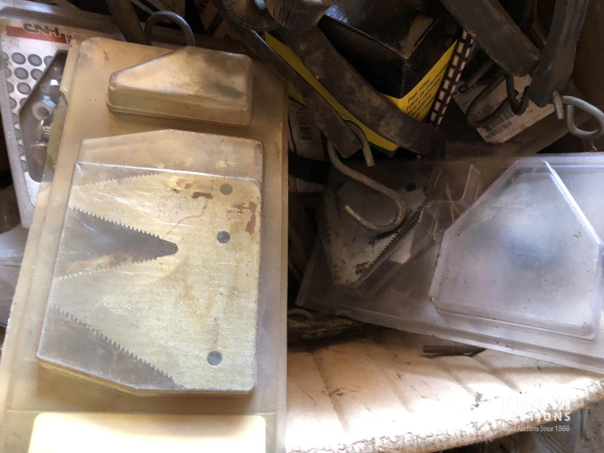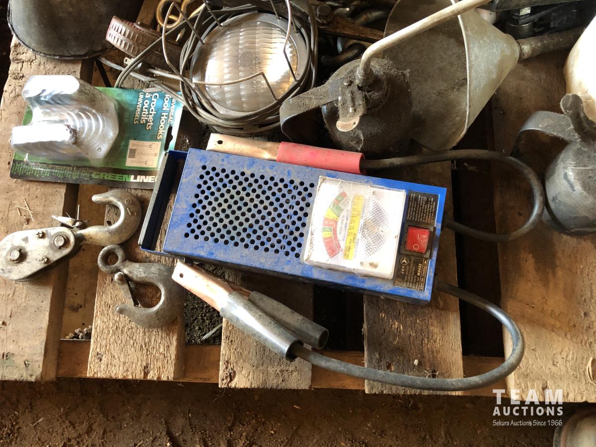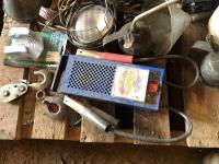 assorted hardware, battery tester, sickle blades, mower blades, trouble light, chalk line