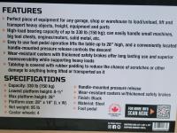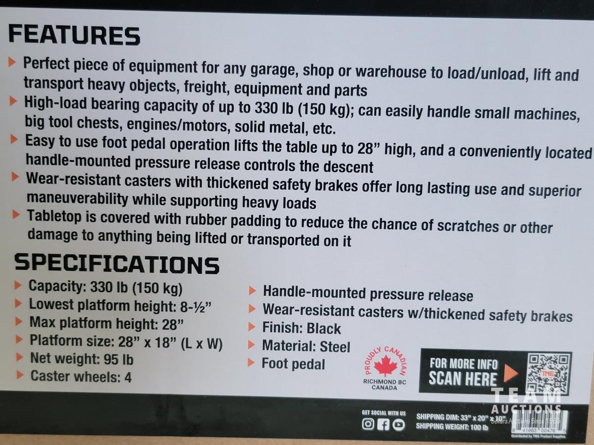 28 inch lifting height, foot pedal operation, rubber padded tabletop