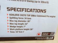 7 HP Kohler gasoline engine, 28 inch log diameter capacity, 3-sec cycle time