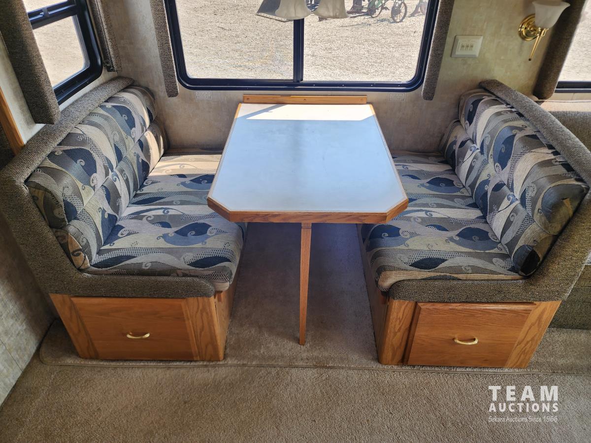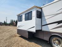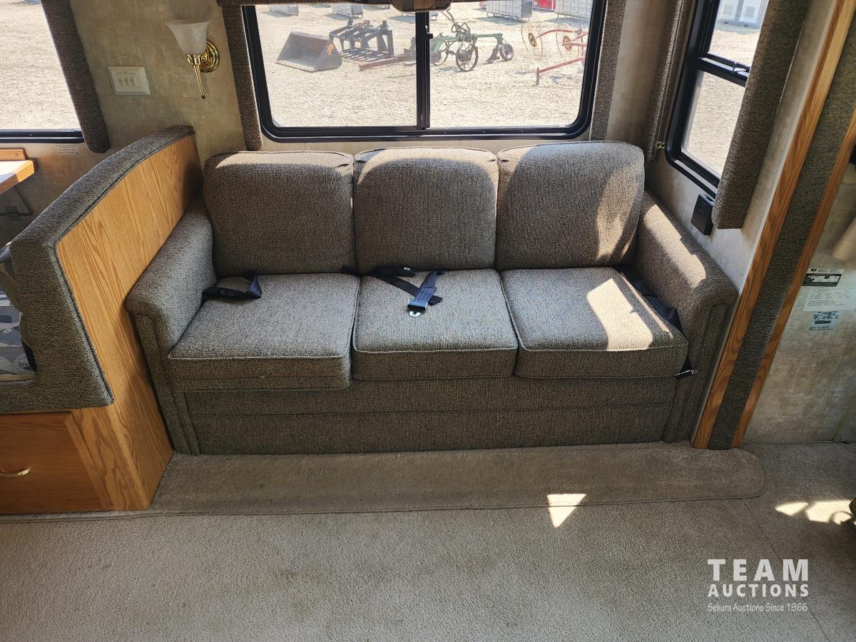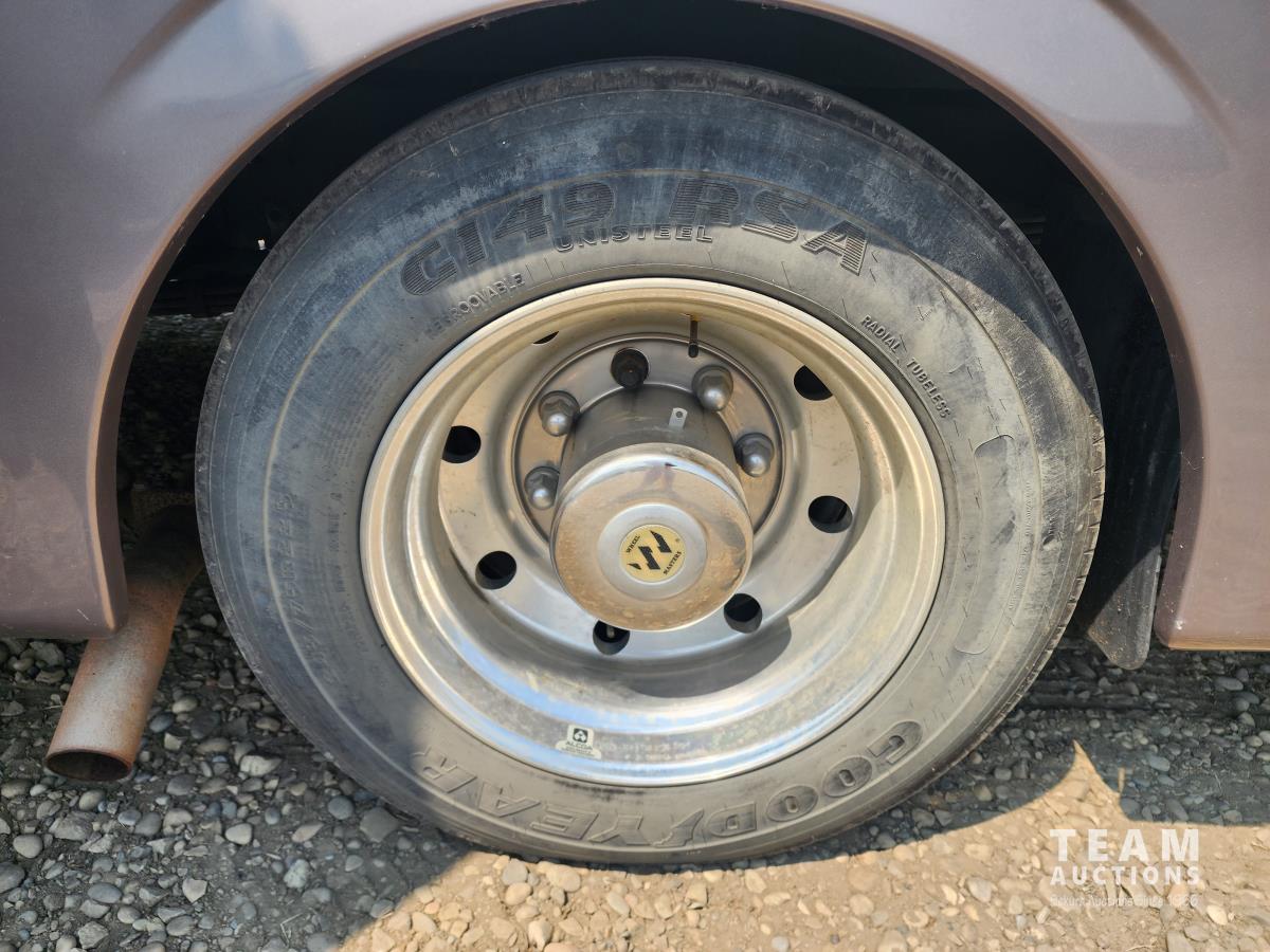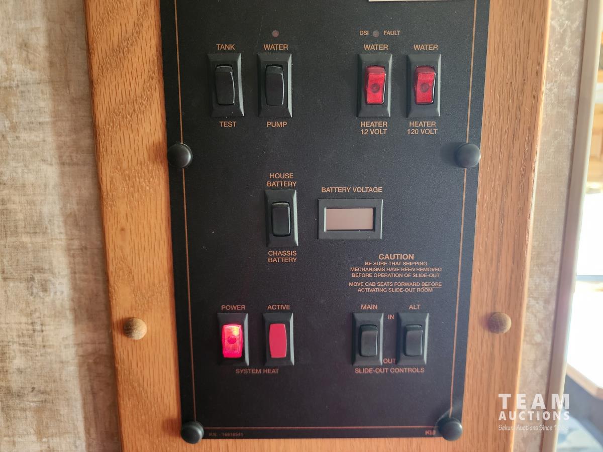 6.8L, V10 engine, (2) slide outs, Onan 5500 generator, fridge, stove, microwave, dinette, couch, full bathroom, queen bed, heat, A/C, power jacks, backup camera, (2) TV's, spare tire, 245/75R22.5 tires