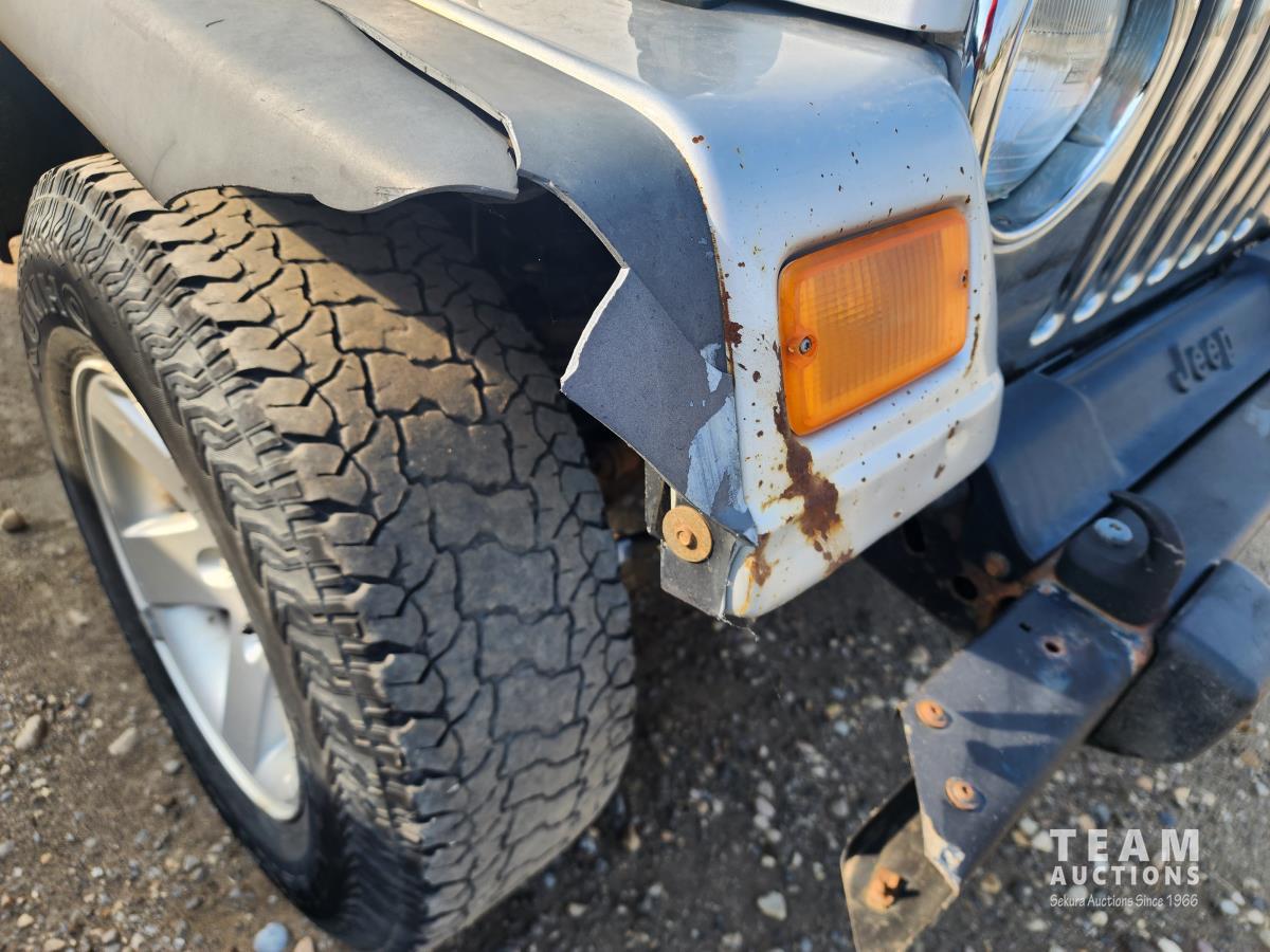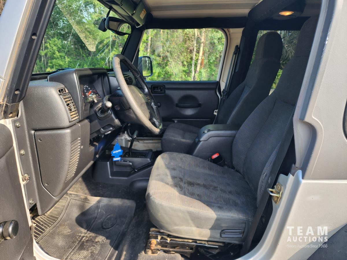 4.0 L, 3 speed automatic transmission, A/C, 4 wheel diff lock, removeable storage box, chrome headlight bezels and grill cover, receiver hitch, original soft top (new in box), custom quilted headliner, (4) extra tires, 245/75R16 tires