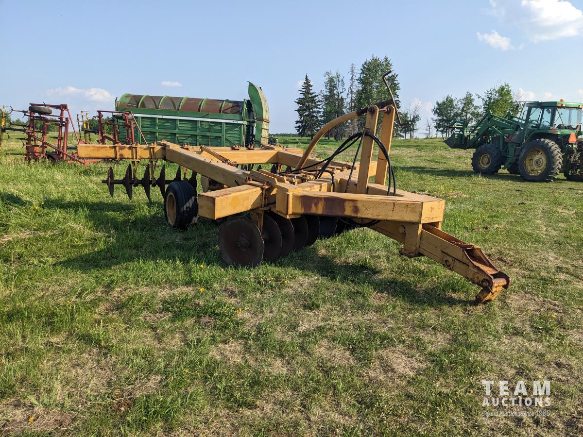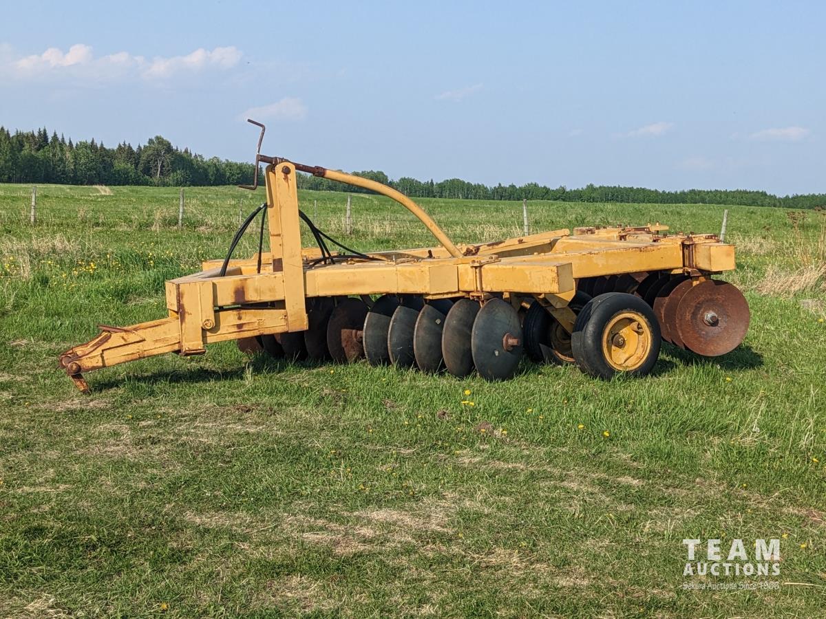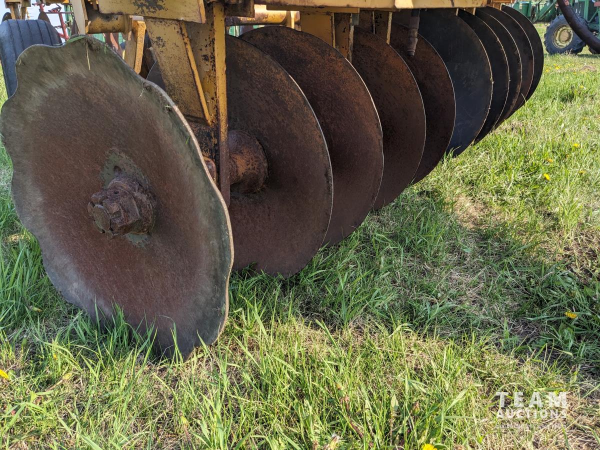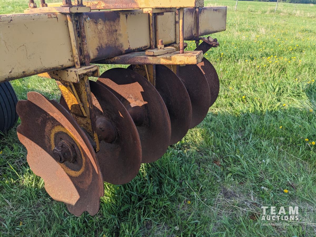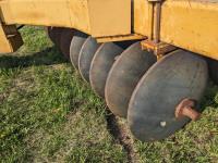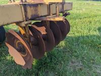 10 inch spacing, half of front gang has new 26 inch disc blades and other half 23.5 inch blades, rear 23 inch disc blades, hydraulic lift cylinder, adjustable gang angle, 11.5-16 duals