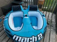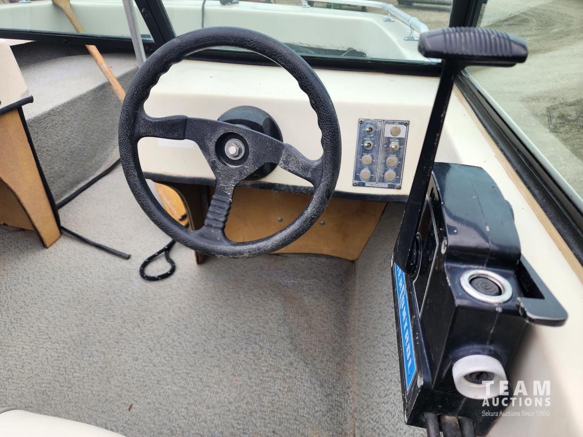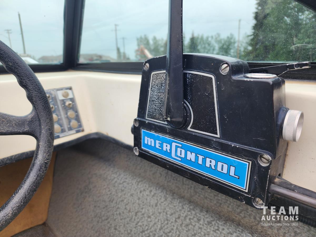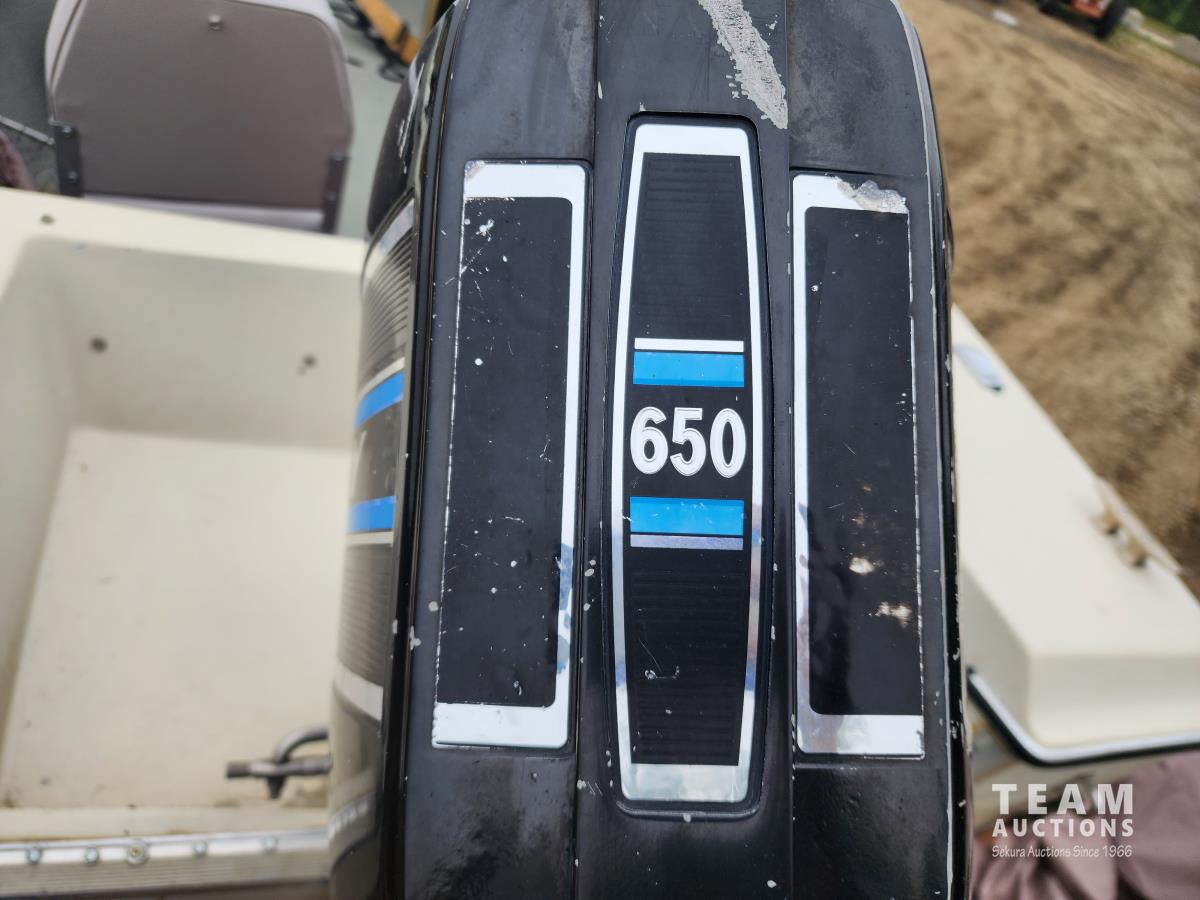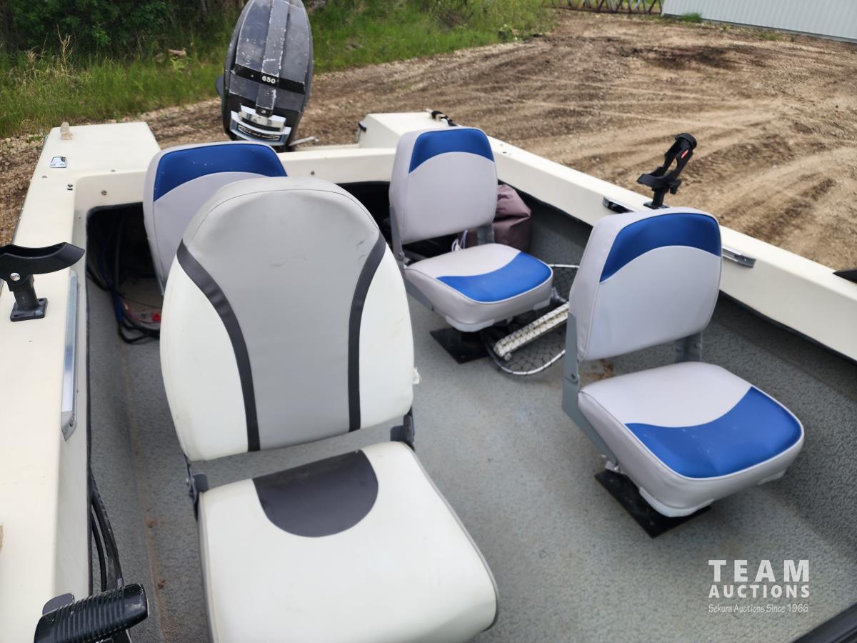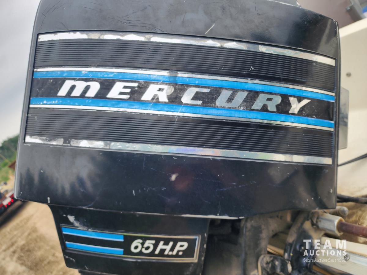 Mercury 65 HP motor, (4) swivel chairs, (2) rod holders, Mach 2 tube, cover, ropes, bumpers, drink holders, S/A trailer, spare tire, 4.80-12 tires