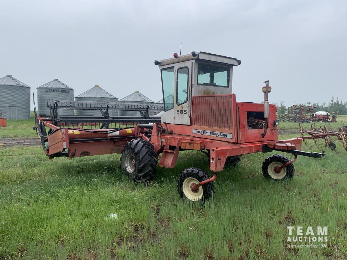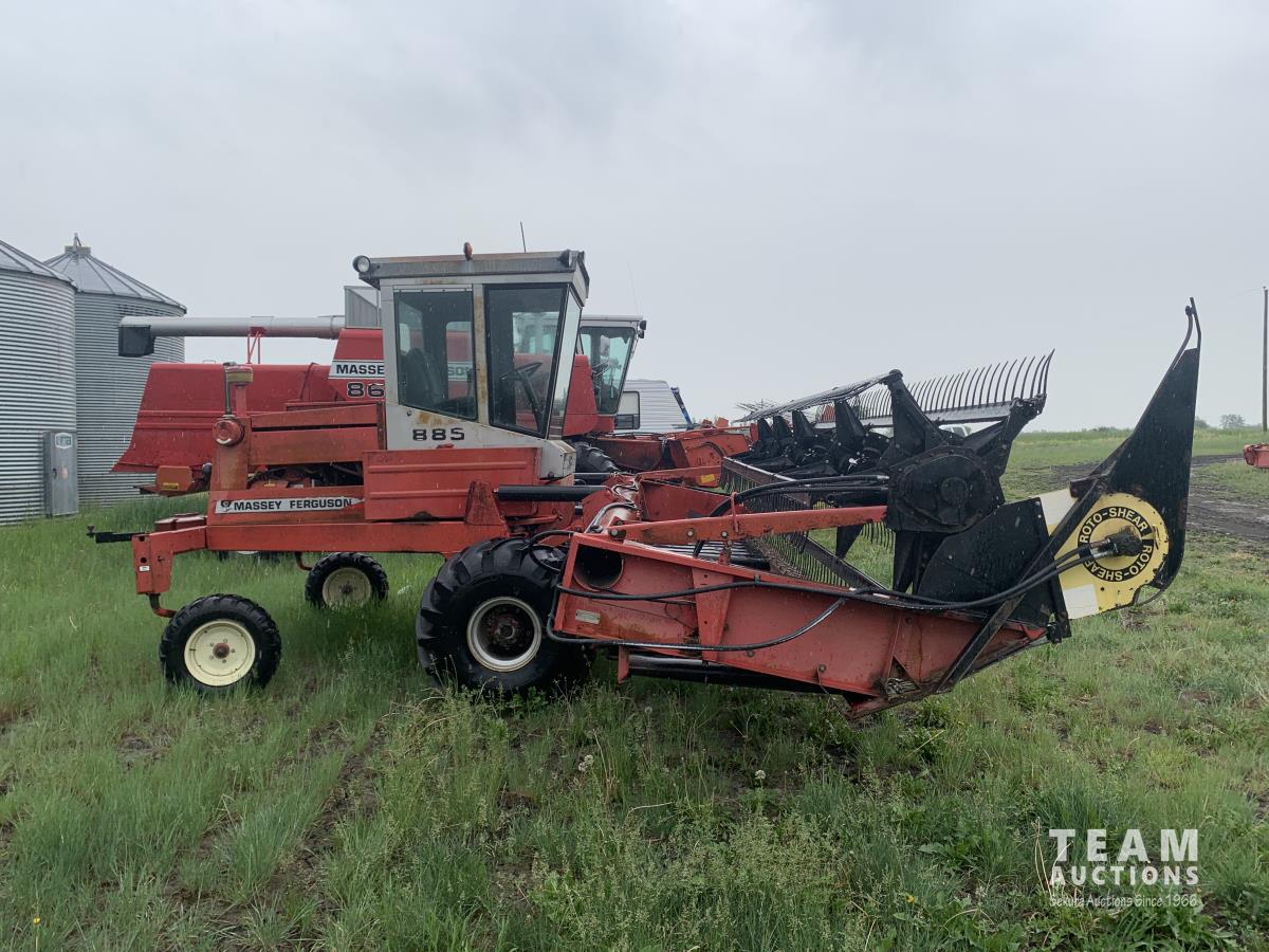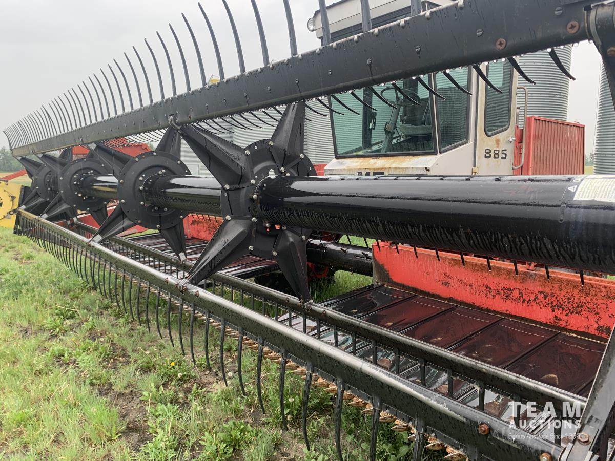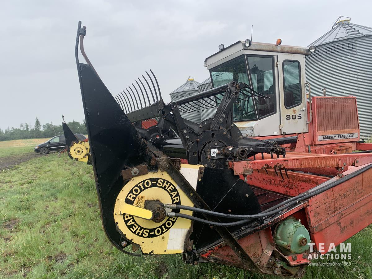 Massy Ferguson 885 21 ft double delivery rigid draper header, pickup reel, variable speed reel, skid plates, Roto shears crop dividers, Canola drum, Chrysler 225 225 cu in 6 cylinder gas engine, A/C, radio, upgraded stereo, Hour clock was replaced at 2100, 18.4-16.1 front tires, 7.60-15 rear tires