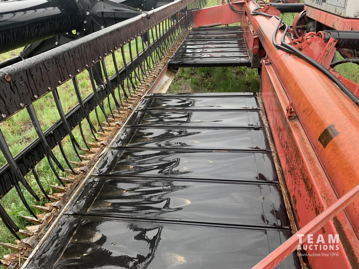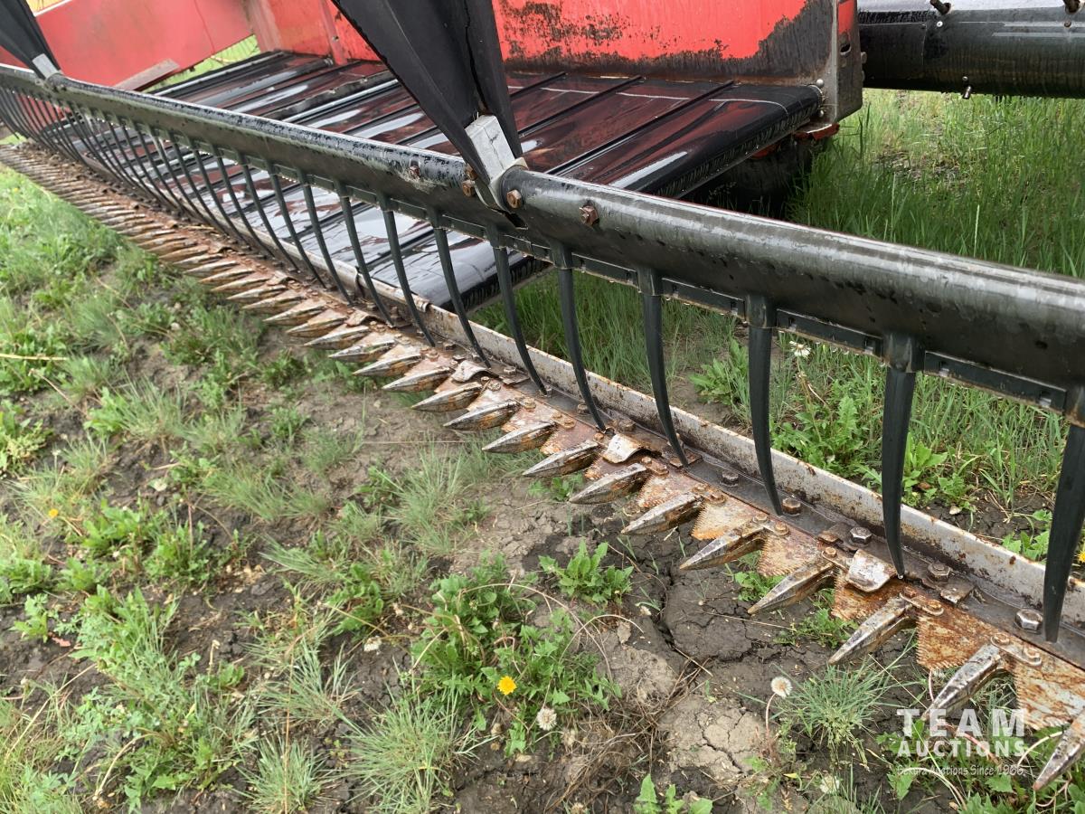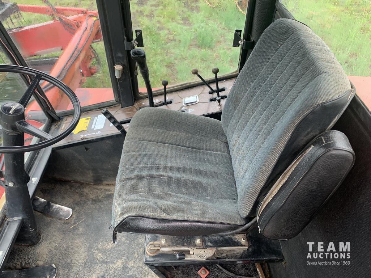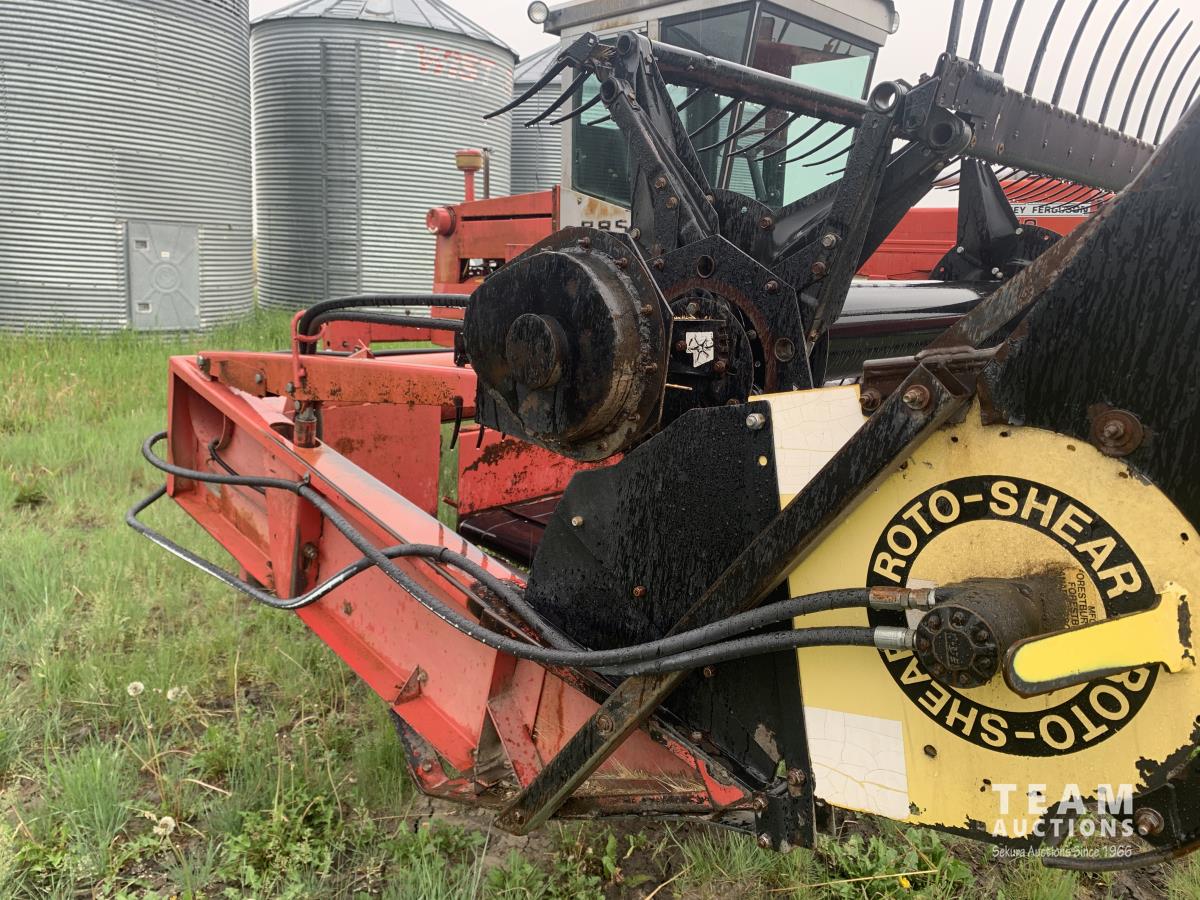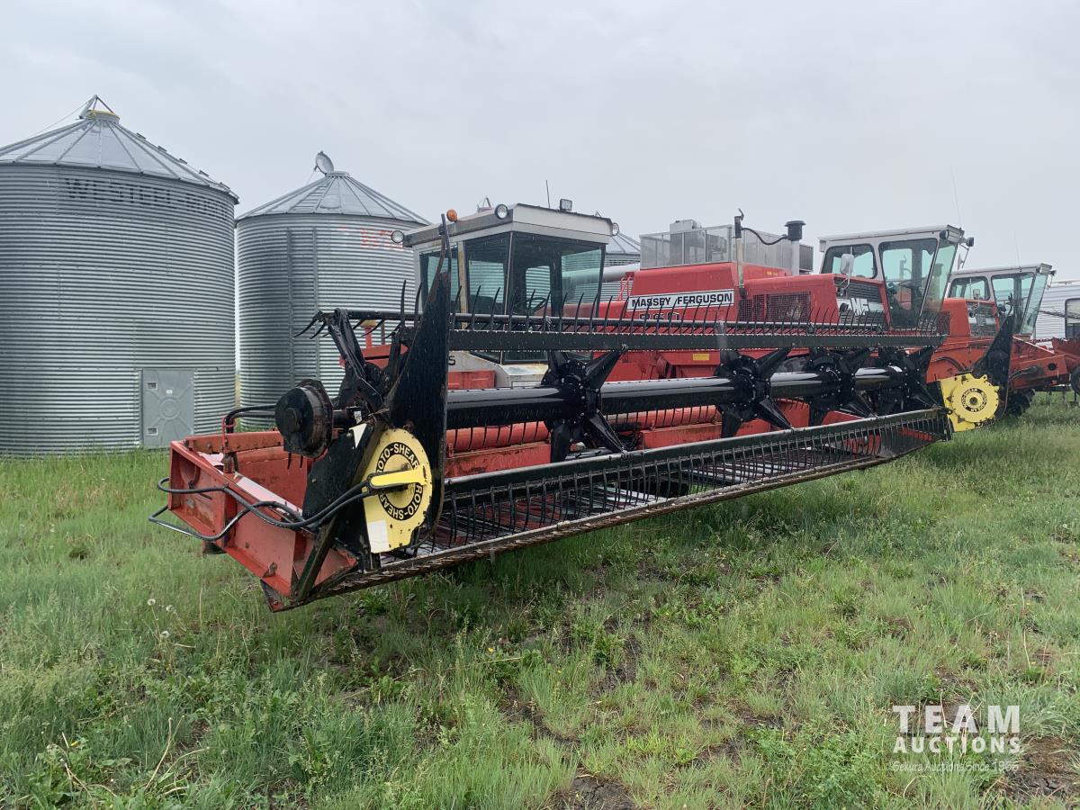 Massy Ferguson 885 21 ft double delivery rigid draper header, pickup reel, variable speed reel, skid plates, Roto shears crop dividers, Canola drum, Chrysler 225 225 cu in 6 cylinder gas engine, A/C, radio, upgraded stereo, Hour clock was replaced at 2100, 18.4-16.1 front tires, 7.60-15 rear tires