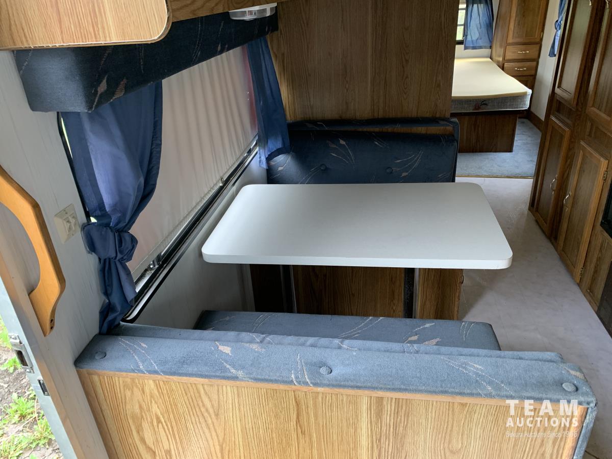 Spring suspension, air condition, fridge, stove, microwave, front seating area, rear bedroom, bathroom, shower, toilet, sink, ST205/75R15 tires