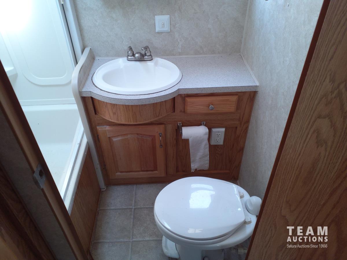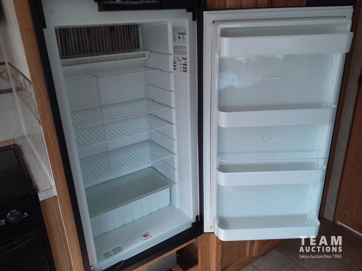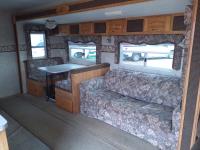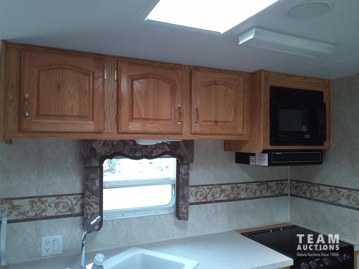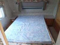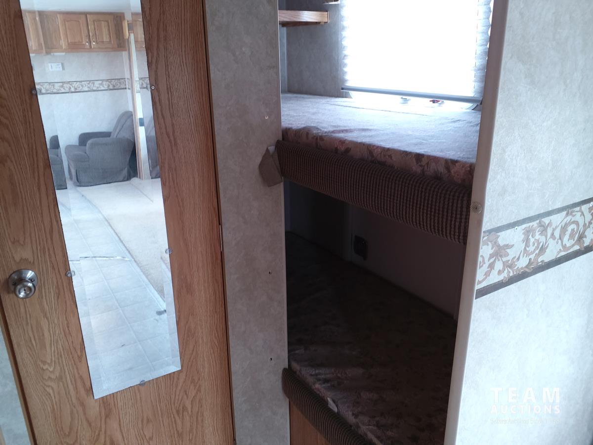 Queen bed, bunk bed, table folds down, couch, fridge, microwave, stove, bathroom, tire size ST235/80R16