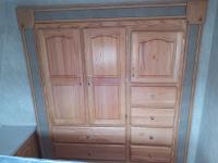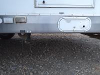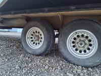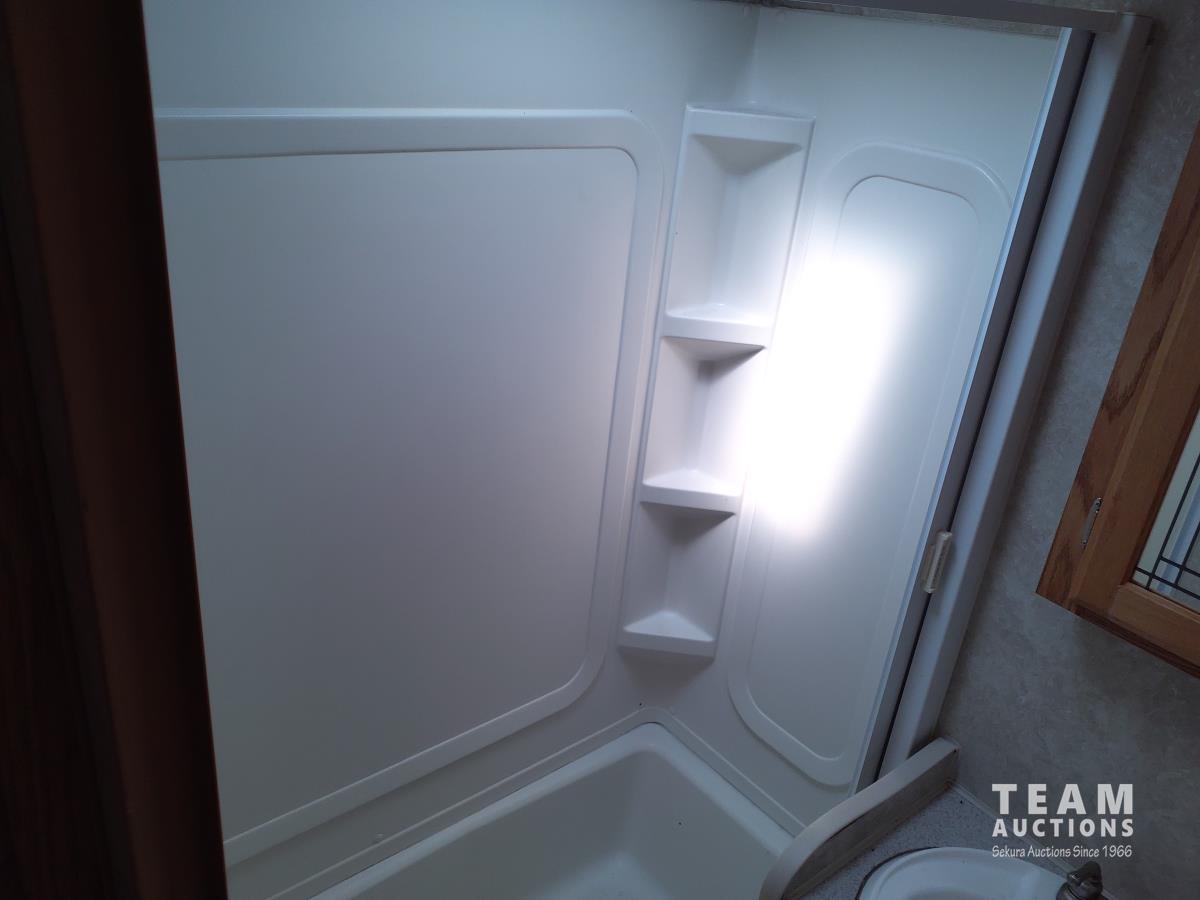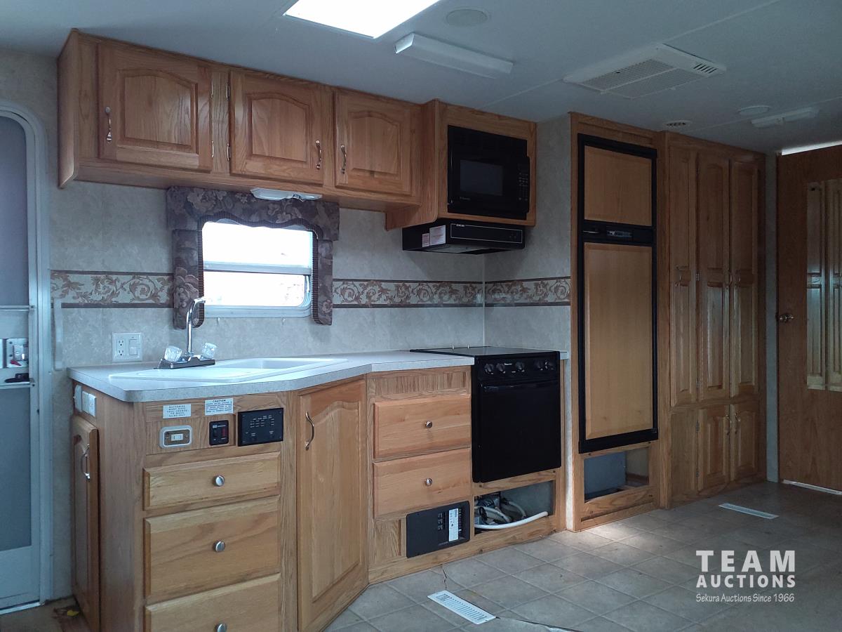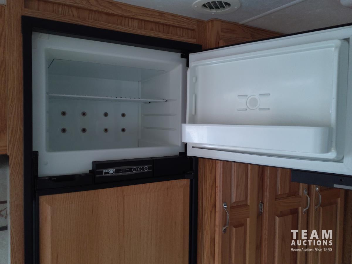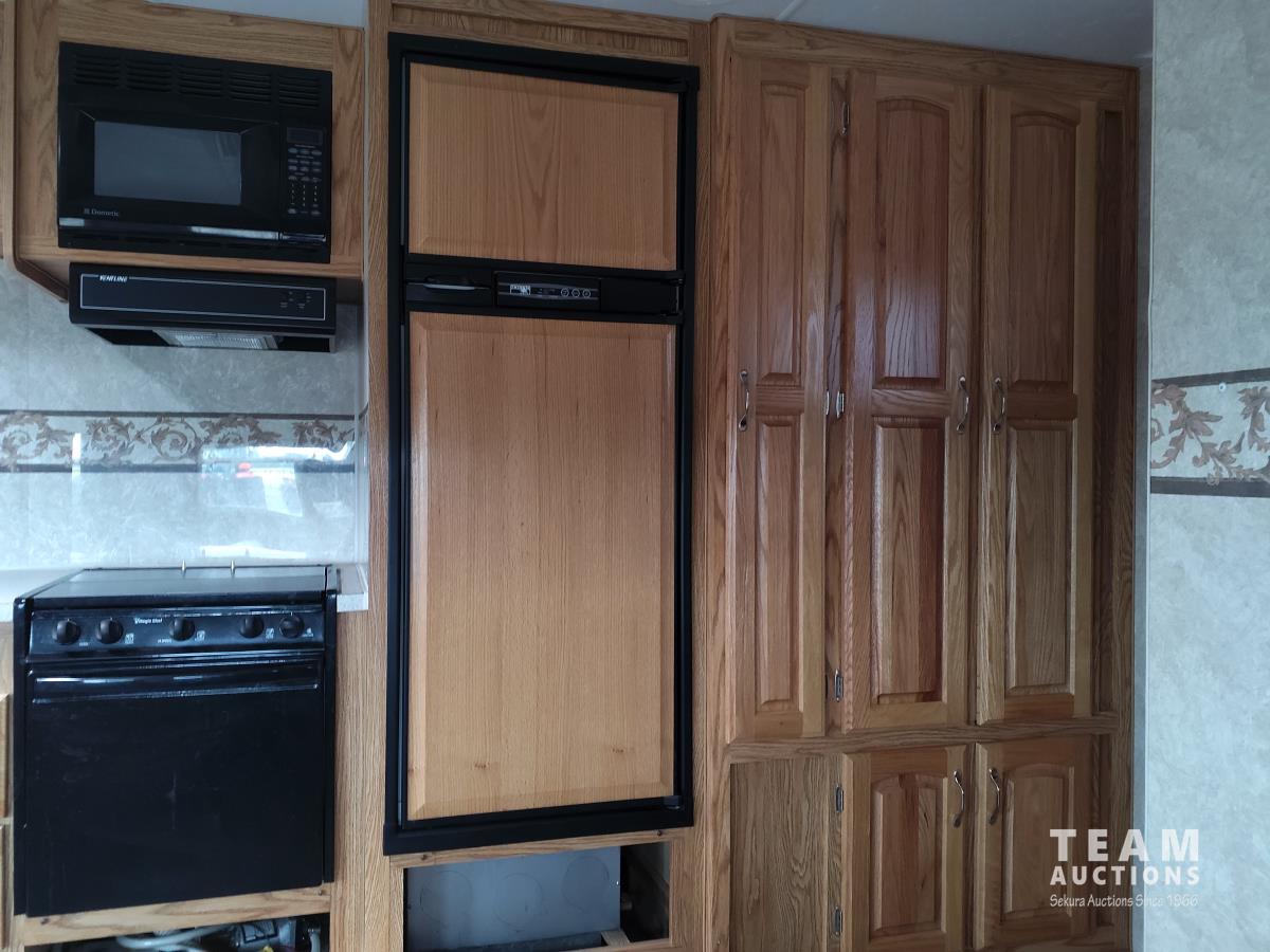 Queen bed, bunk bed, table folds down, couch, fridge, microwave, stove, bathroom, tire size ST235/80R16