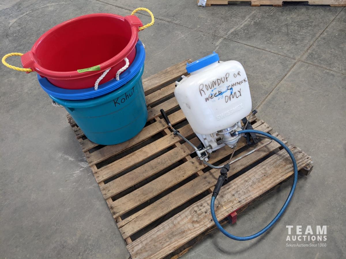 1070 (3) Tote Bin/Buckets and Swissmex Backpack Sprayer
