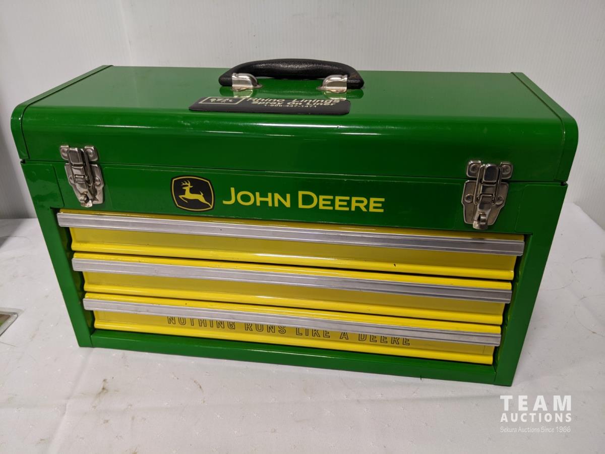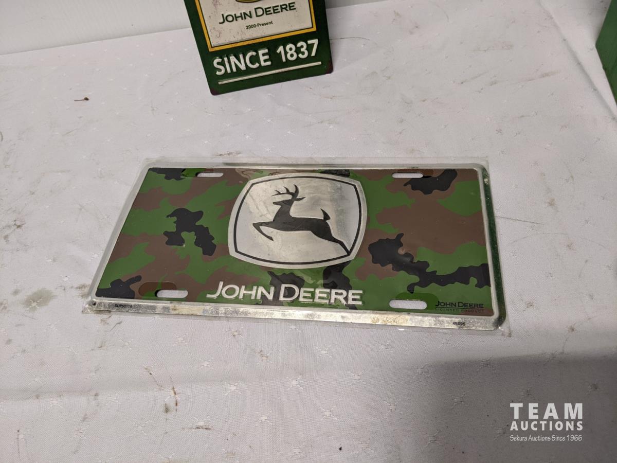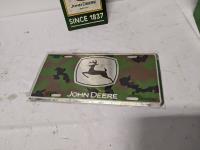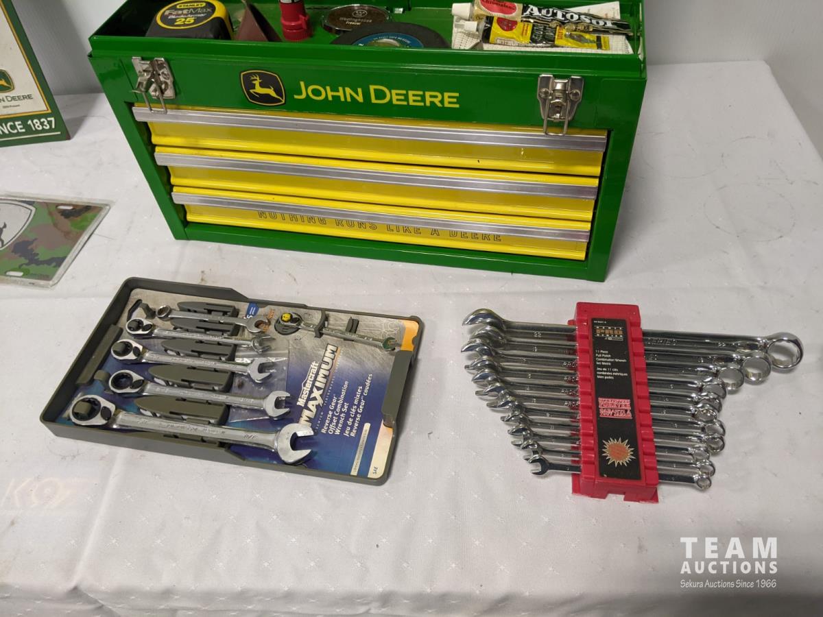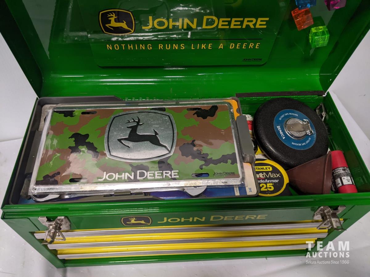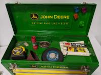 John Deere tool box with assorted tools, John Deere sign and license plate