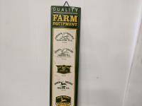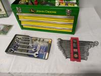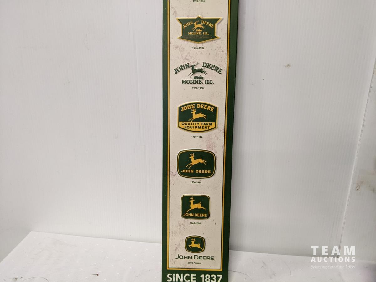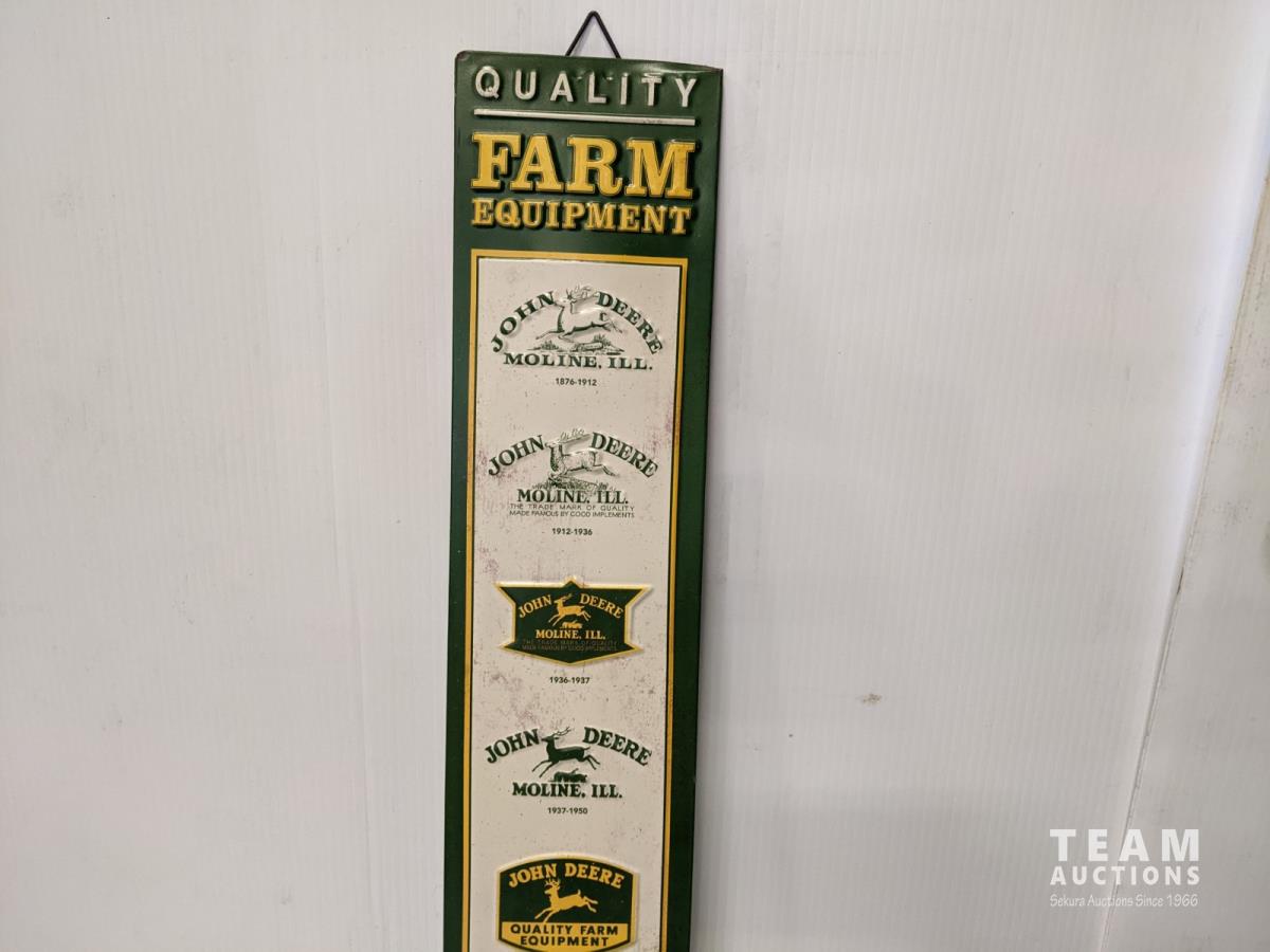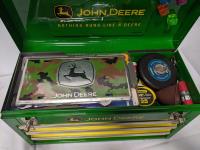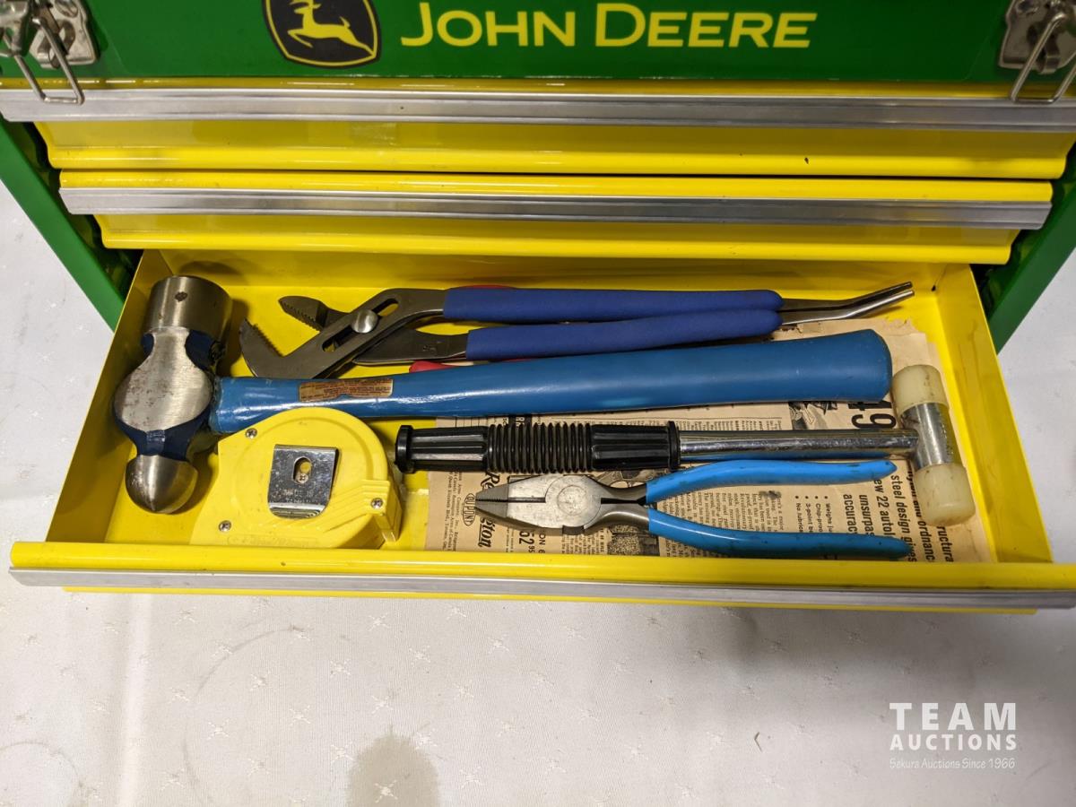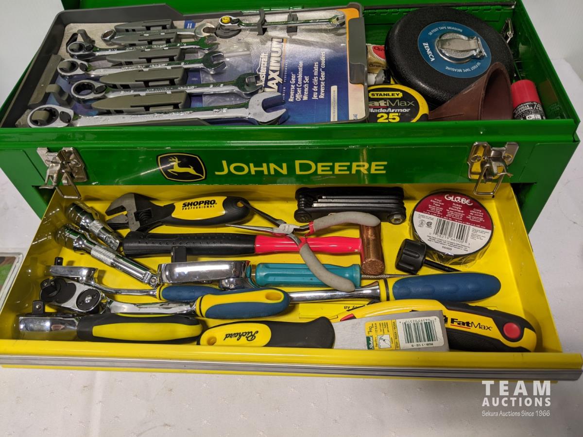 John Deere tool box with assorted tools, John Deere sign and license plate