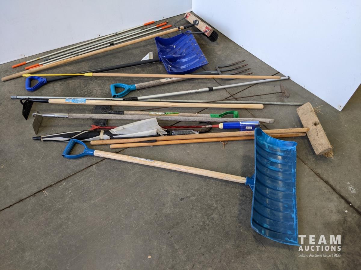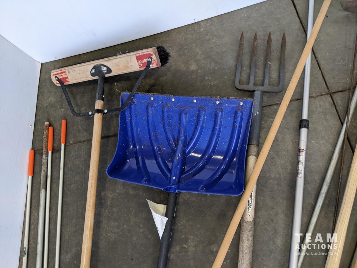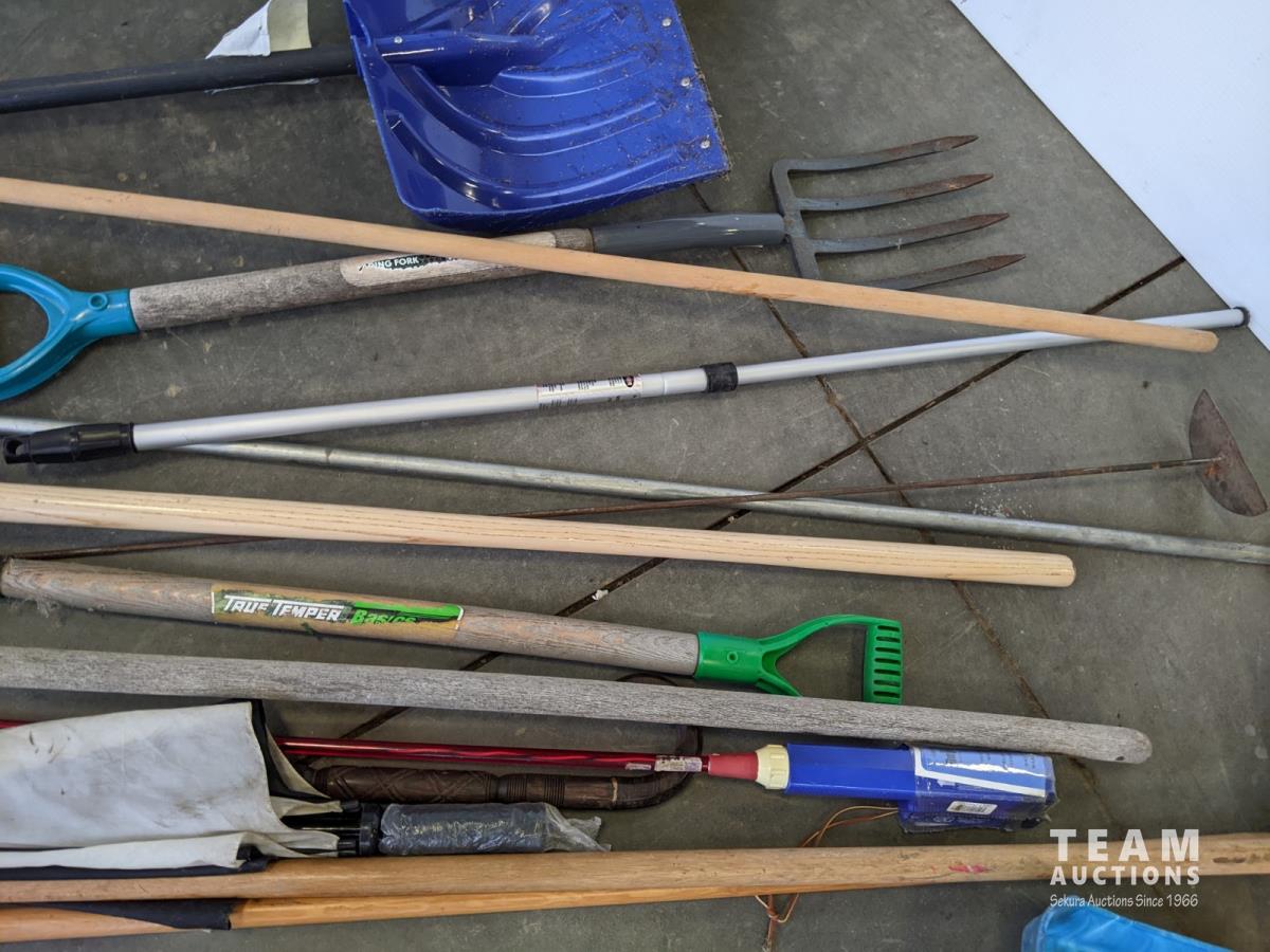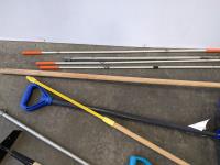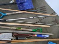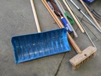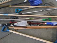 (2) hoes, (2) snow shovels, umbrella, (2) brooms, cattle prod, mini pitch fork