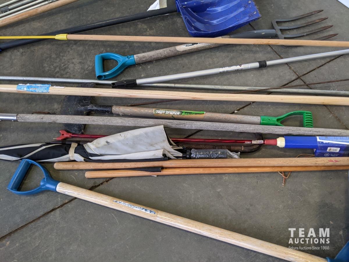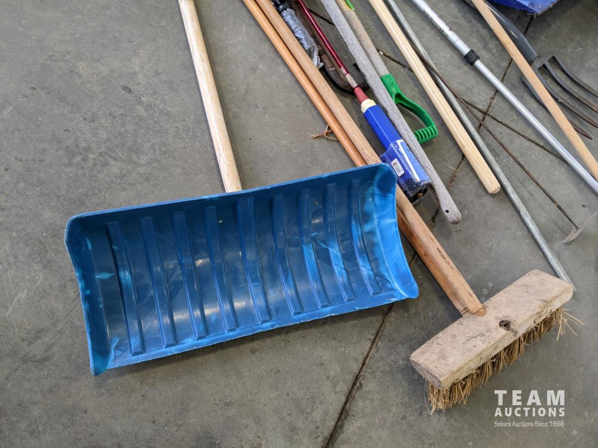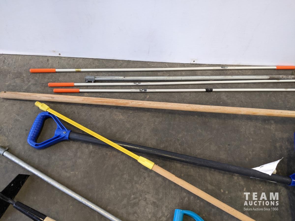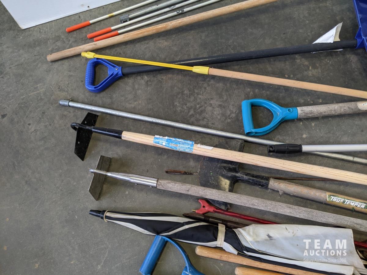 (2) hoes, (2) snow shovels, umbrella, (2) brooms, cattle prod, mini pitch fork