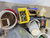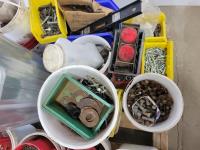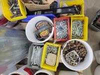 Various screws, bolts, nuts, electrical boxes, hand saws and18 inch aluminum level