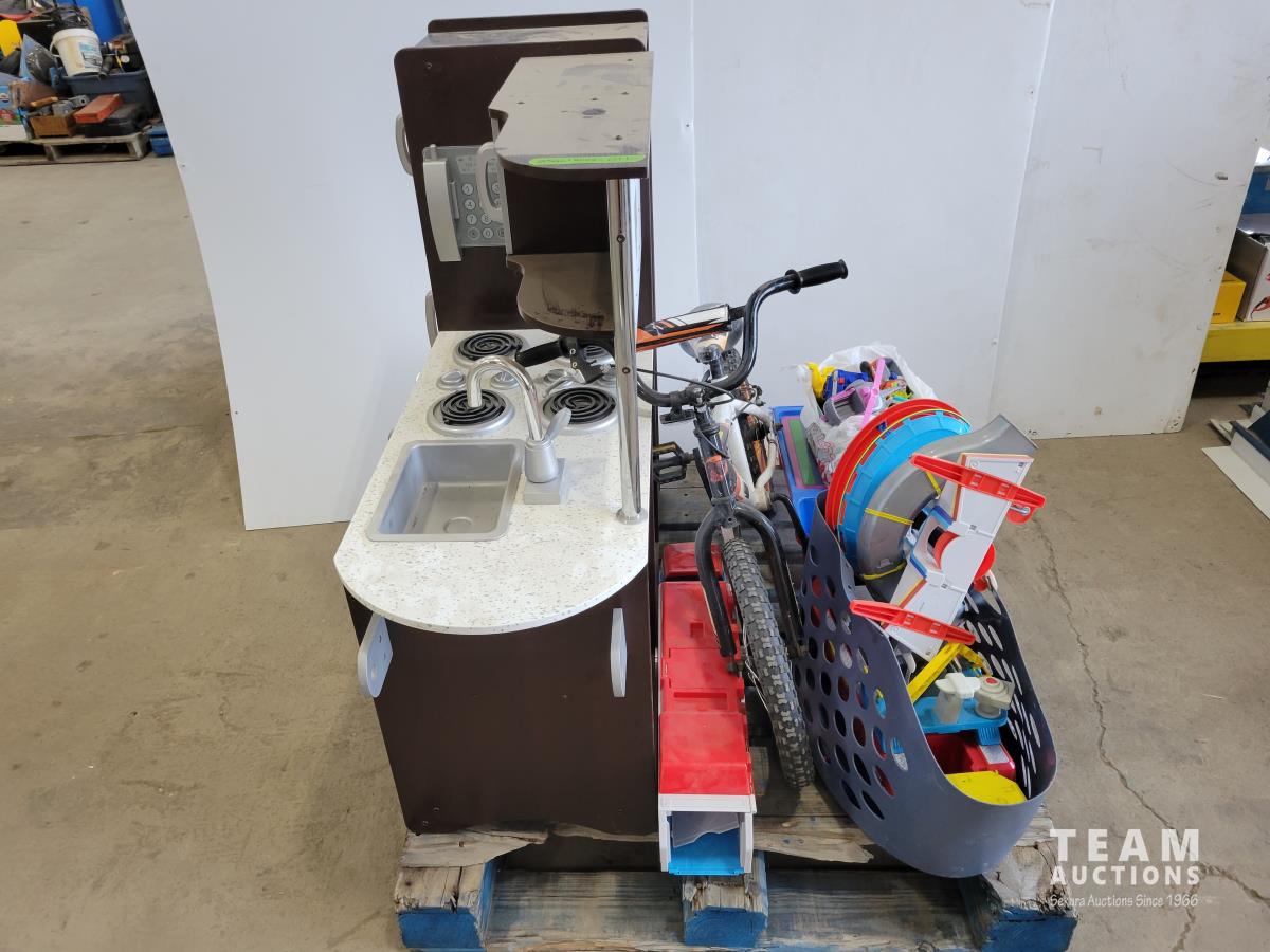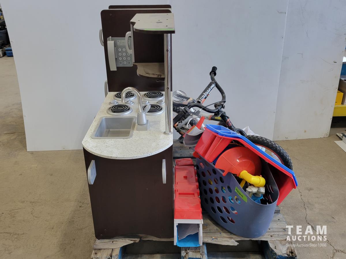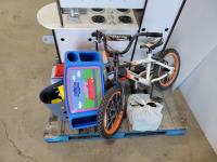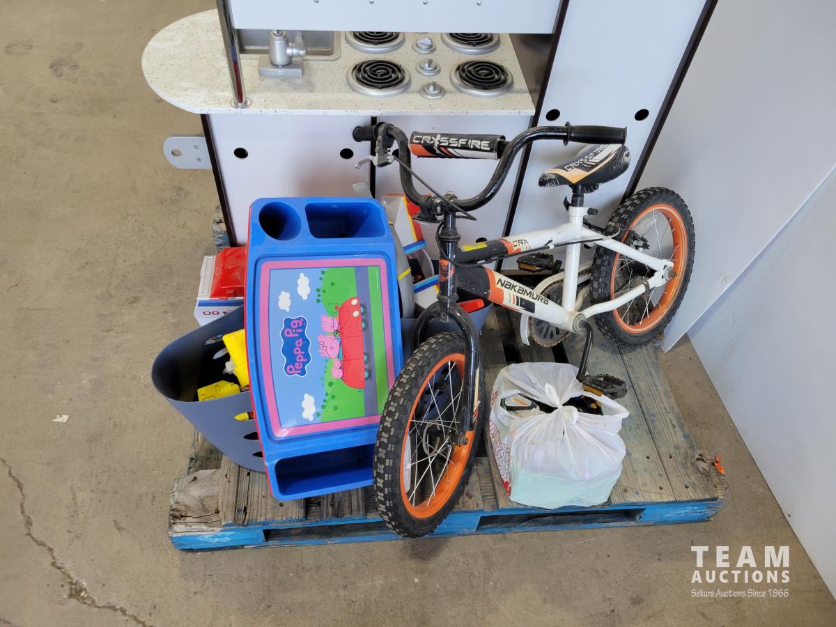 Kids Kraft play kitchen, crossfire nakamura kids bike 16 inch, bag of toy trucks, Peppa Pig TV tray and toy truck