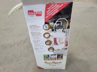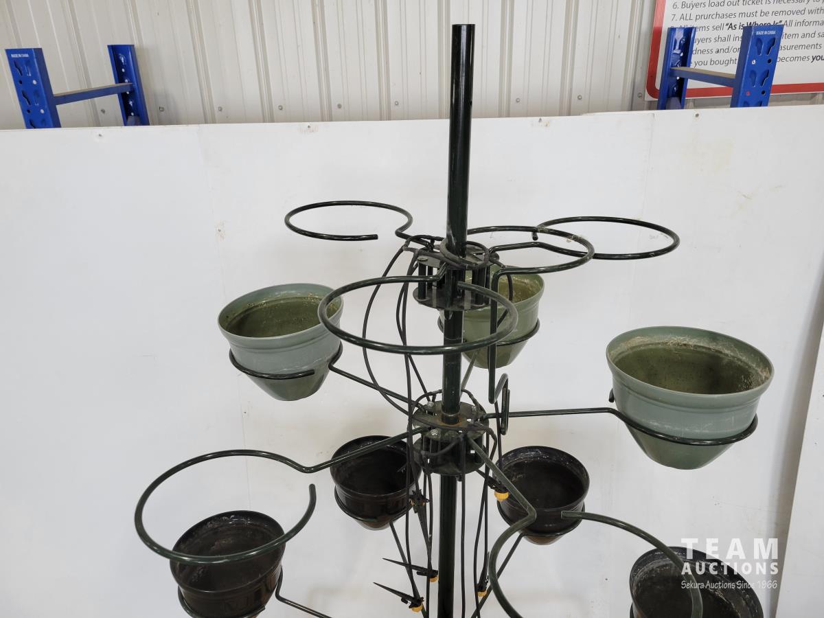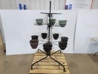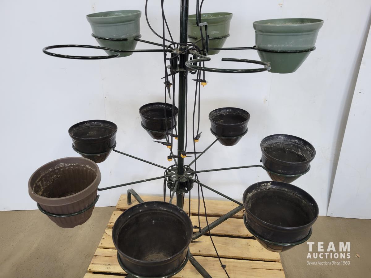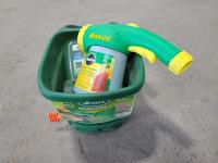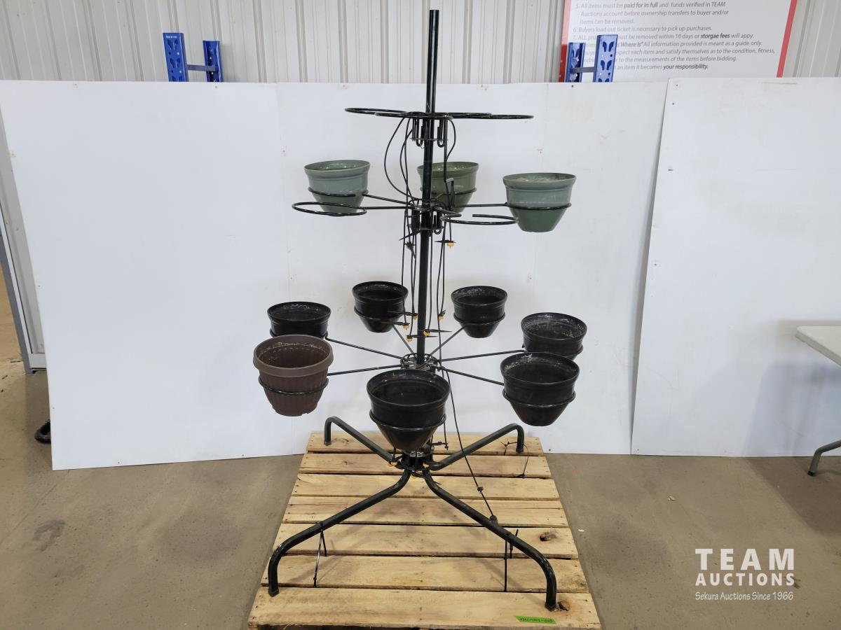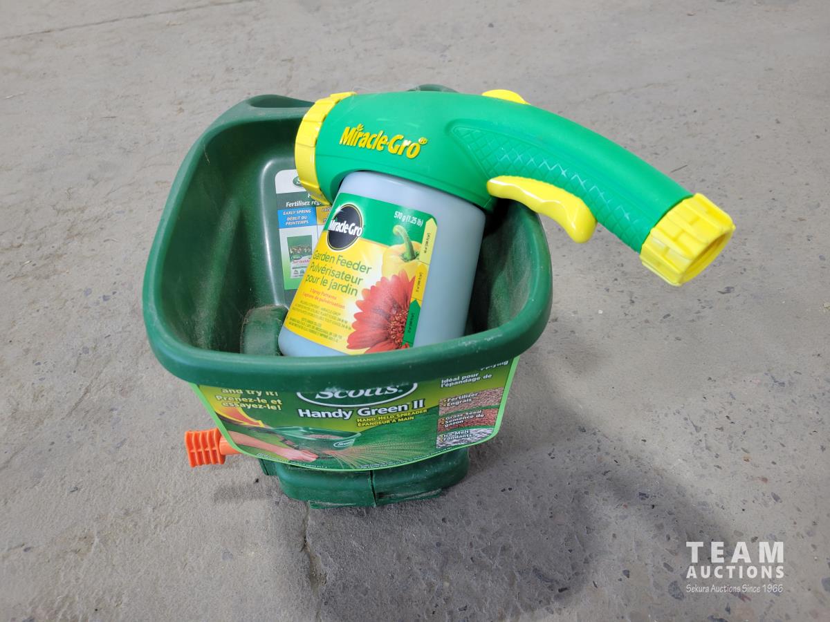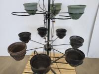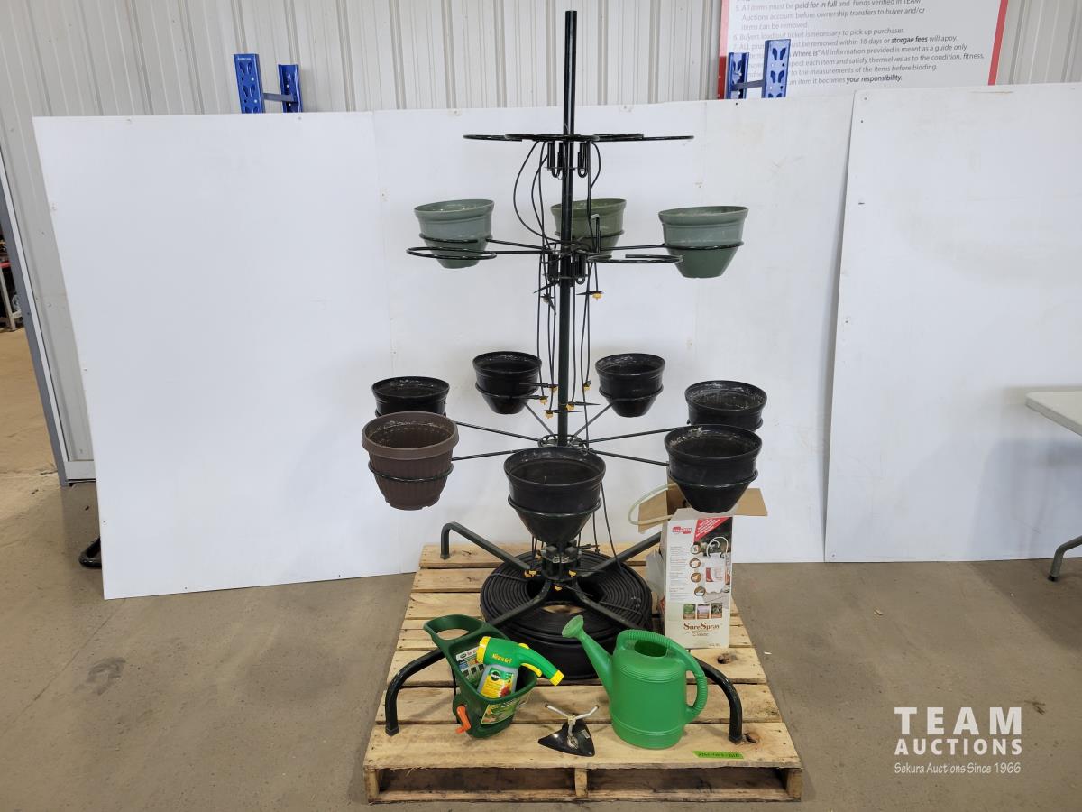2 tier 15 pot plant stand with irrigation, edging, watering can, Scotts hand held broadcaster, Chaplin weed sprayer, Miracle-Gro garden feeder