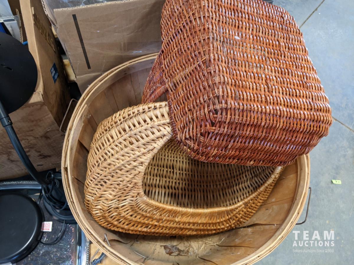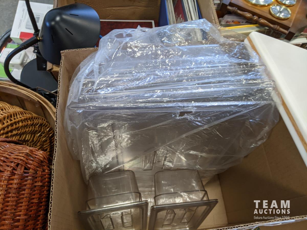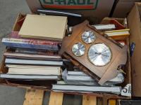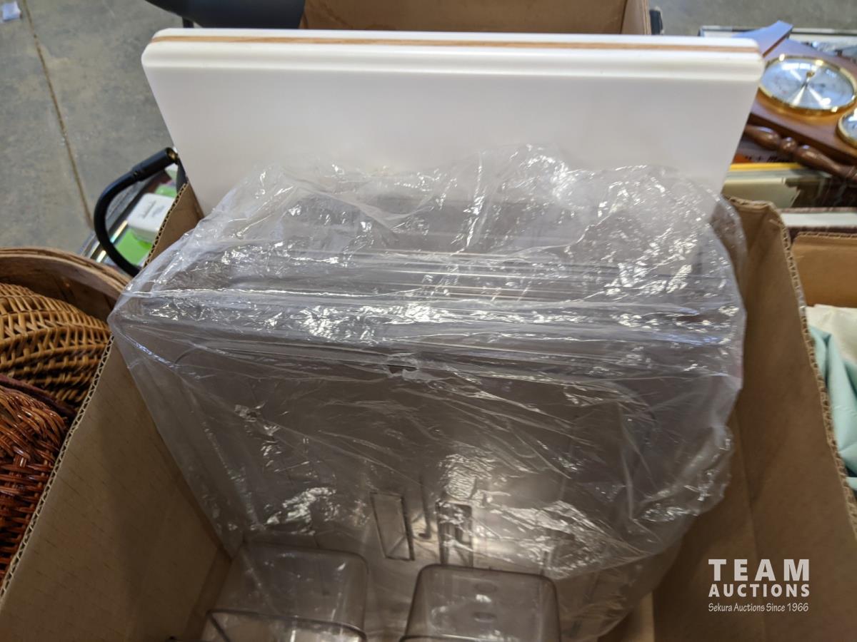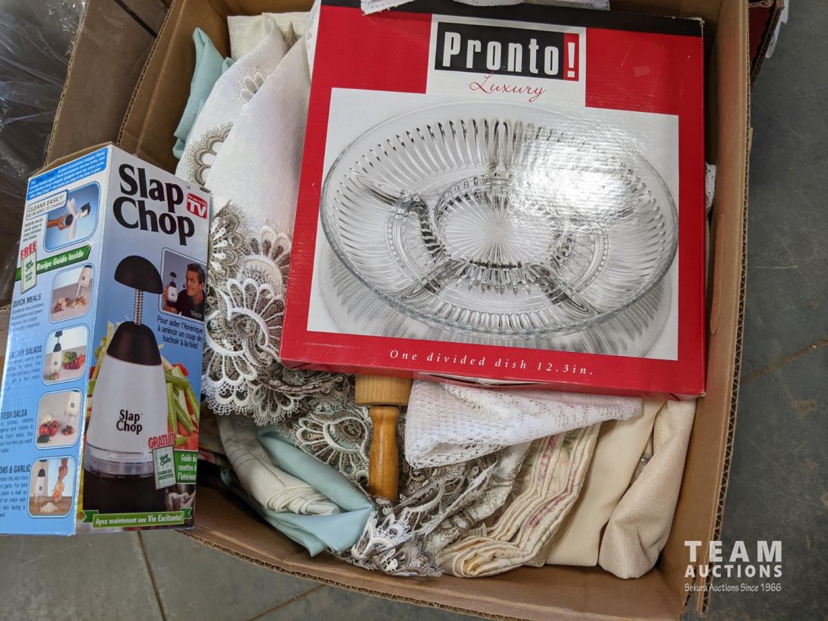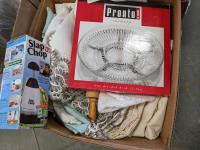 Qty of books, table linens, slap chop, rolling pin, serving dish, chopping block, food prep bins, wicker baskets, food and veggie cutter, tray and (2) thermostat controls