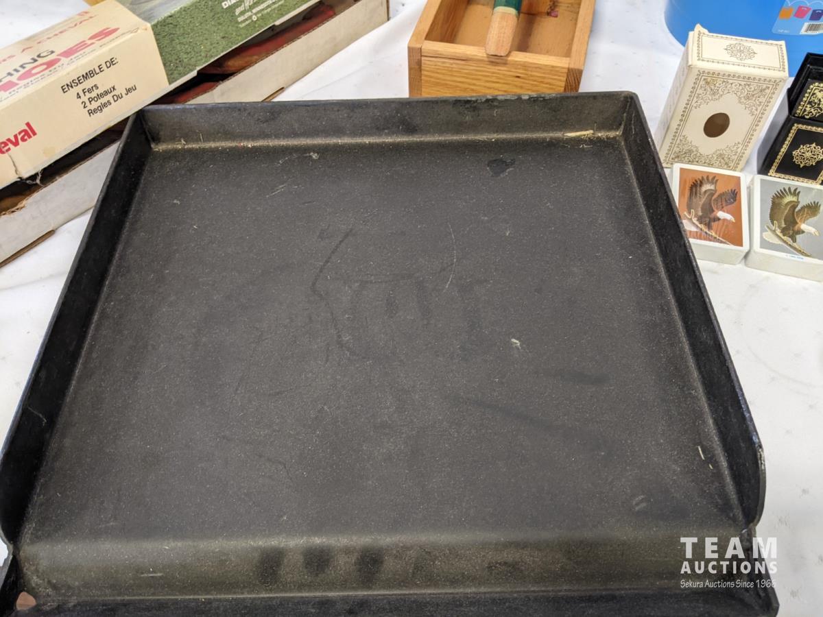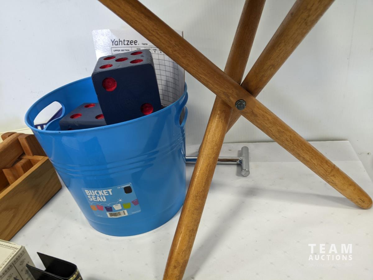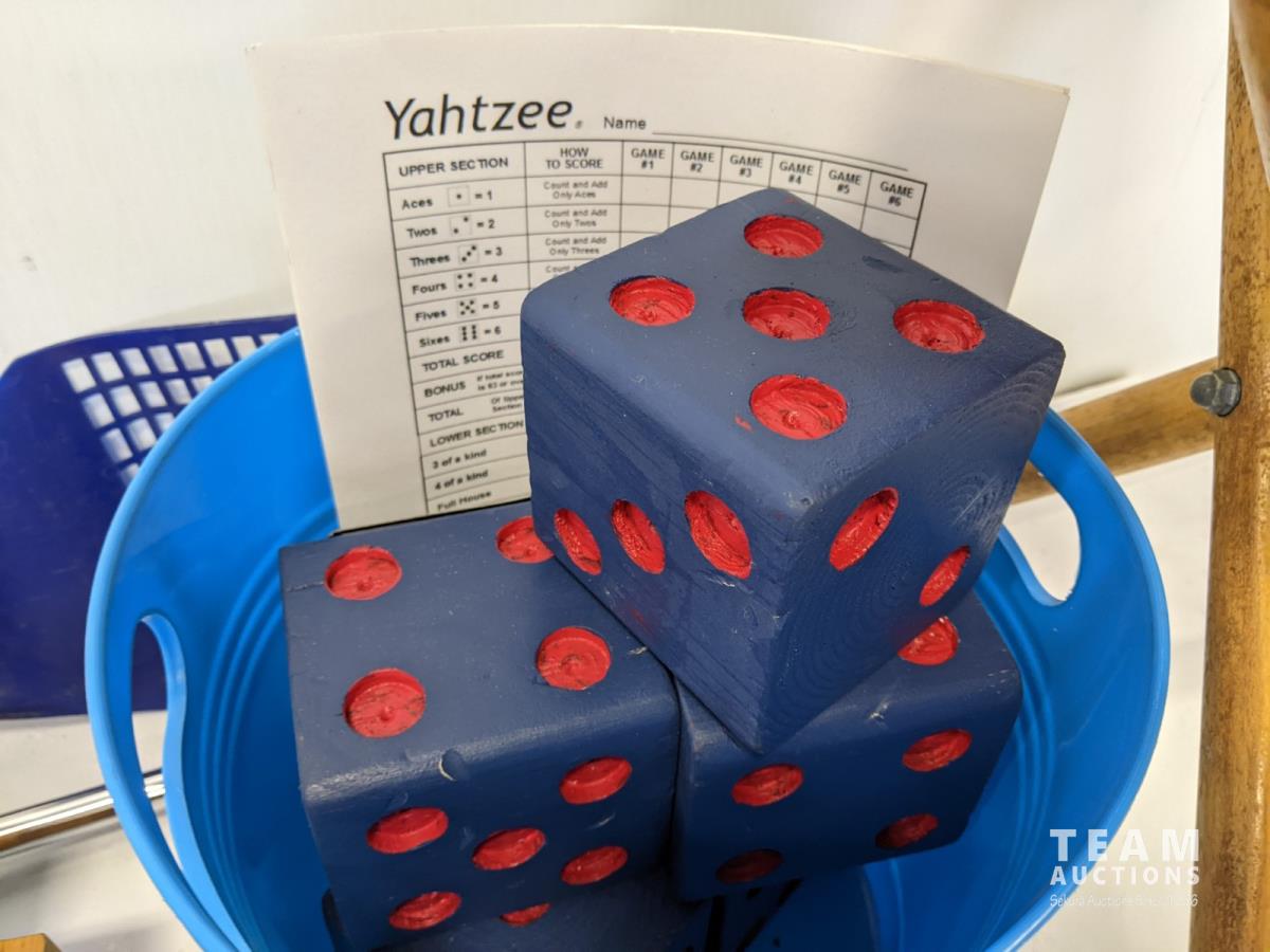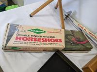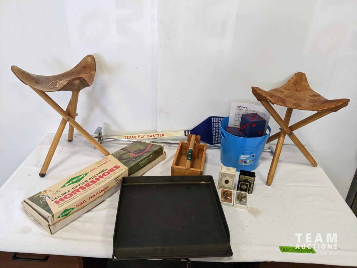 Giant yahtzee game, horse shoes, 16 inch x 16 inch griddle, (2) leather folding stools and cards
