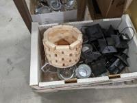 Center pieces/candle holders, fish food, dog water bowl, side table, pencil sharpener