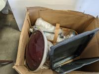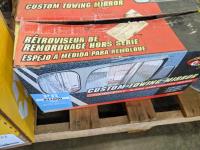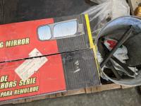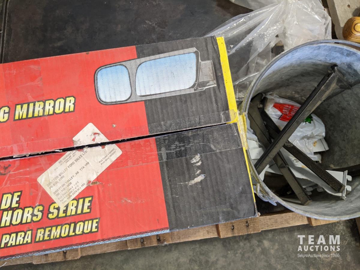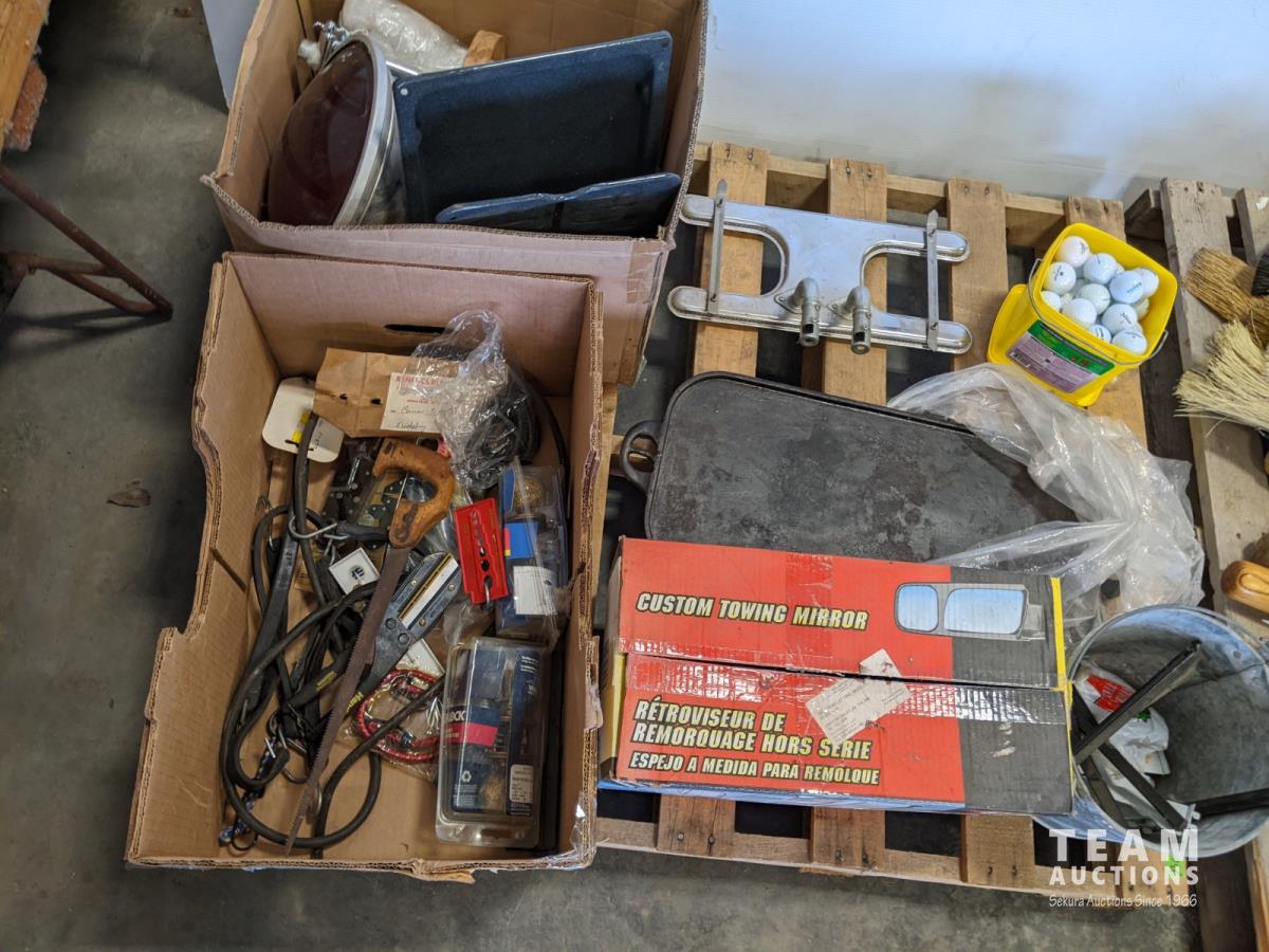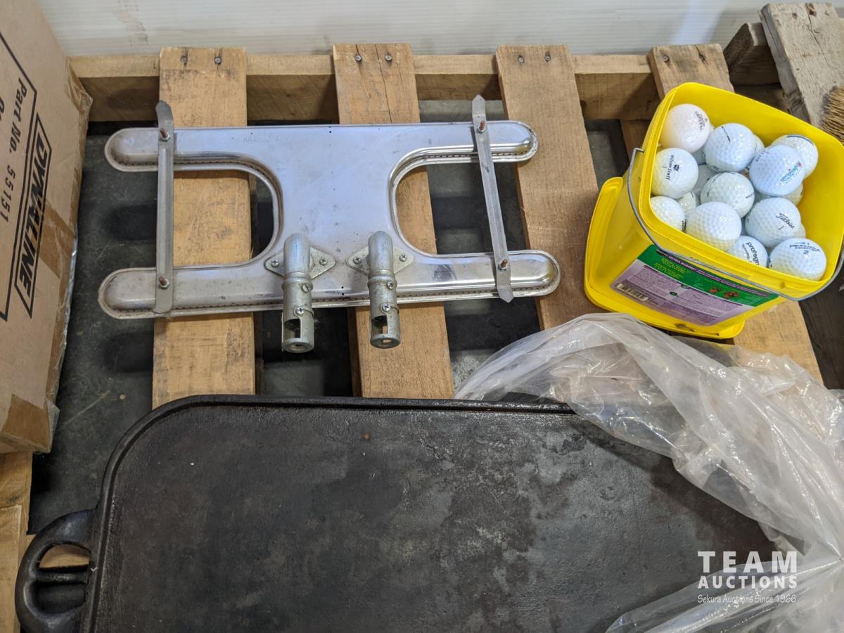 Cast iron griddle, golf balls, small hand tools and towing mirrors