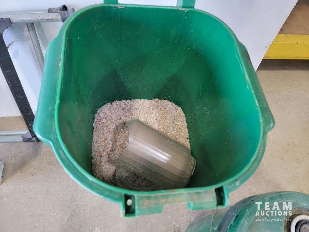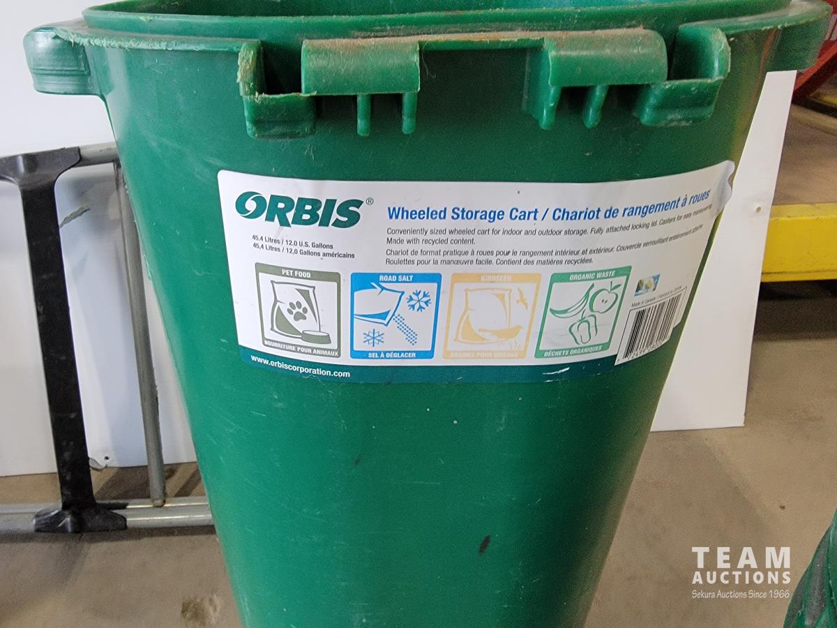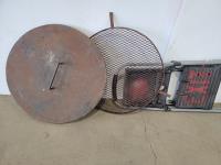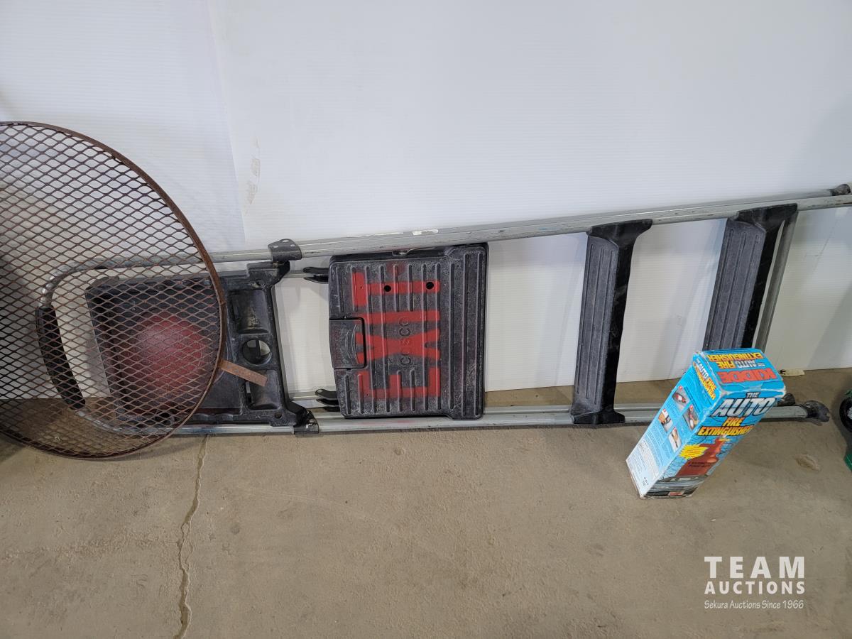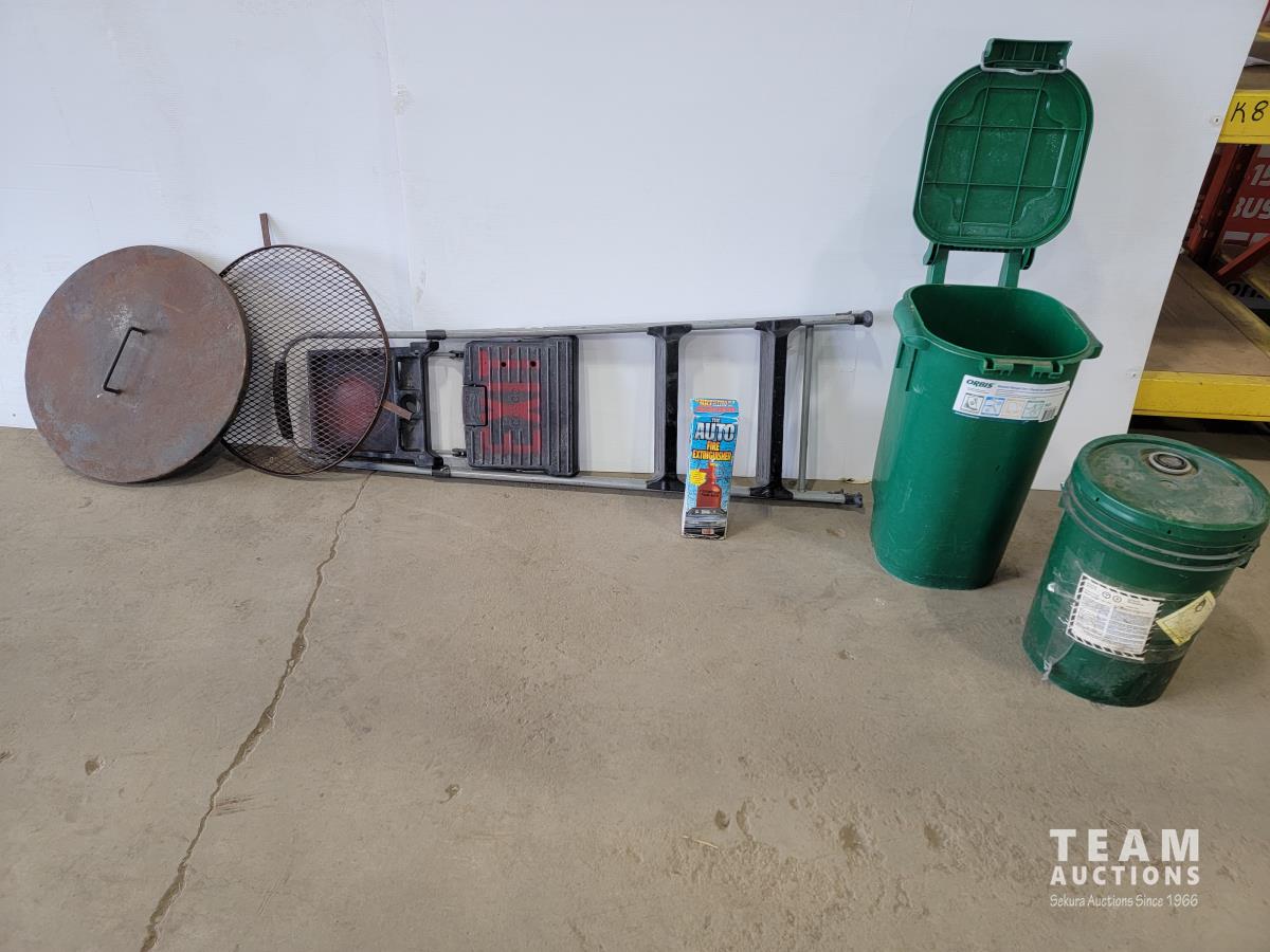 Burn barrel lid and screen, Cosco step ladder, Orbis salt cart and fire extinguisher